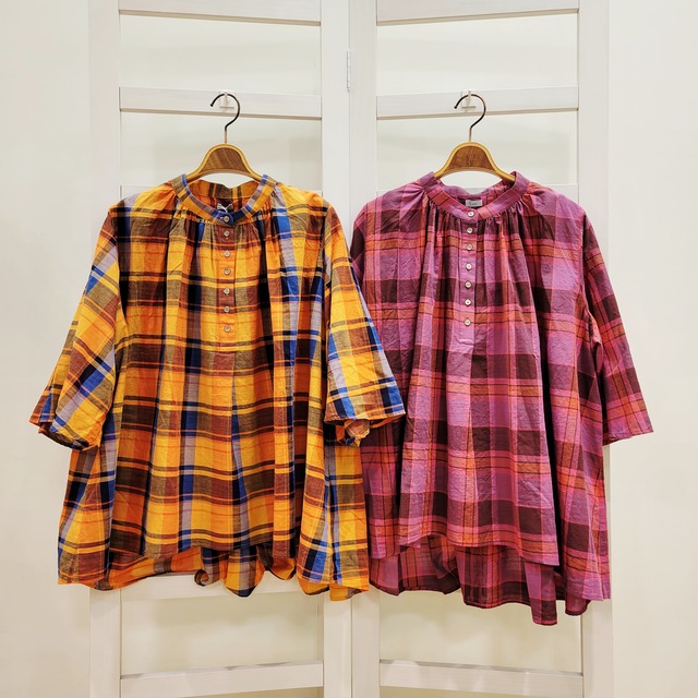 あたたかみのあるオレンジをベースにした、やさしい雰囲気のチェック柄ブラウス。首元に寄せたギャザーが、ふんわりとした立体感のある表情を添えています。ほどよい存在感がありながら、コーディネートに自然と馴染む一枚。バンドカラーですっきりと着られ、パンツにもスカートにも合わせやすいデザインです。 品番:251008 カラー: A(PINK) B(ORANGE) サイズ:フリーサイズ 着丈 71cm バスト 112cm 肩幅 39cm 袖丈 38cm 素材: コットン 100% 手洗い:可