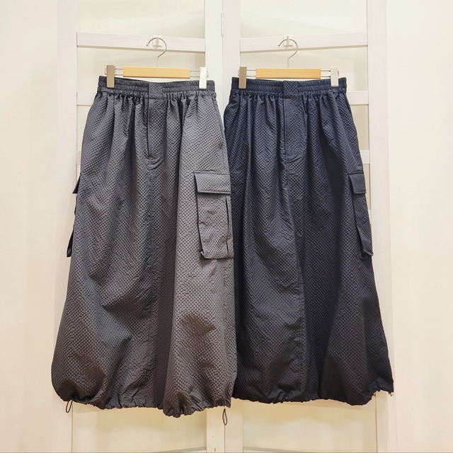 艶とハリのあるポリエステルシアサッカー素材を用いたイージーコクーンスカートです。 サッカー素材に立体的な表面感をミックスしたかわいらしい素材。 両サイドにポケットがついていて、カジュアル感アップ。 両裾にゴムドロストが付いており、裾のボリューム感を調節可能です。 品番:21267308 カラー: 003(C.GRAY) 004(BLACK) サイズ:Free ウエスト 64~78㎝ ヒップ 82㎝ スカート丈 85㎝ 裾幅 64㎝(調節可能) 素材: ポリエステル 100% 裏地:なし