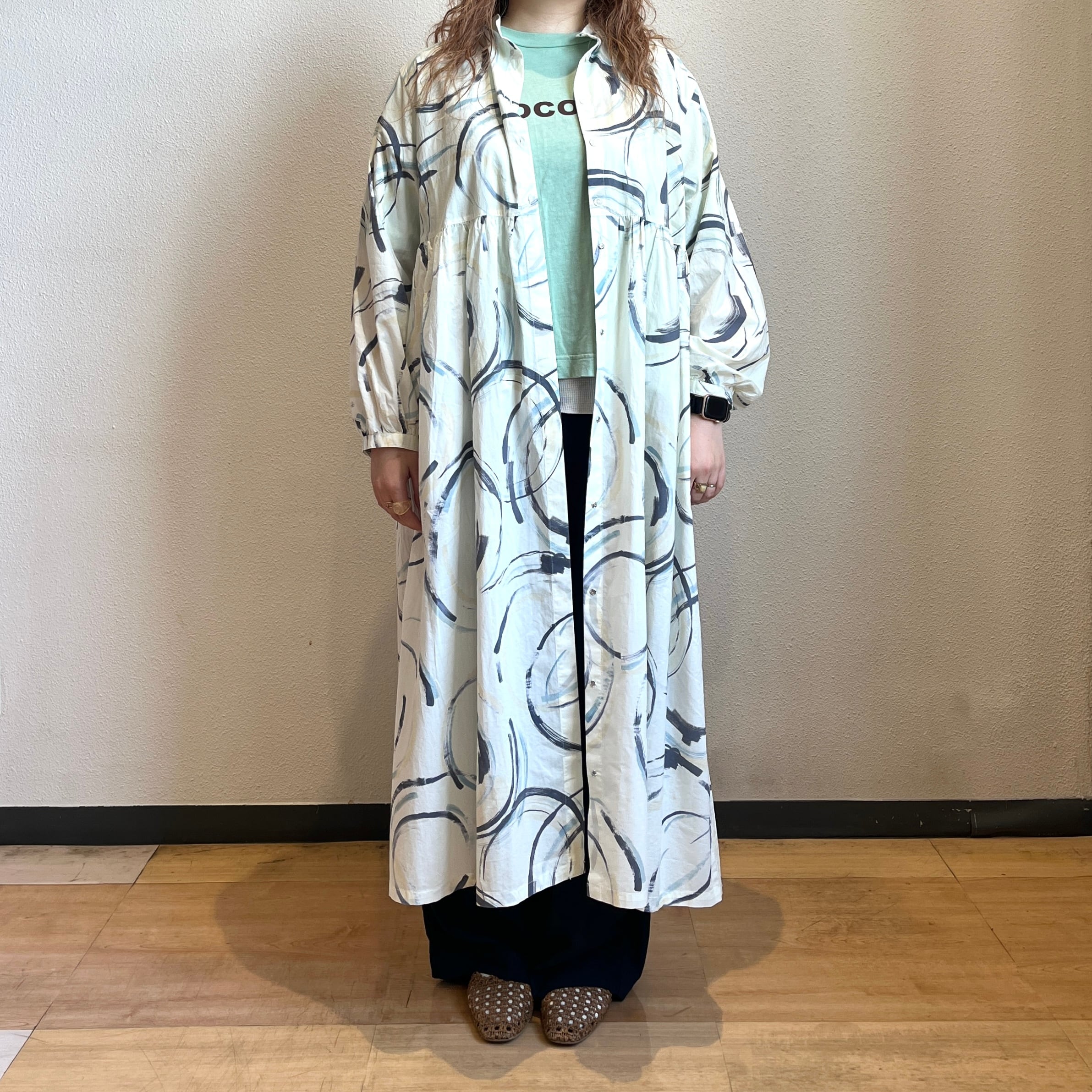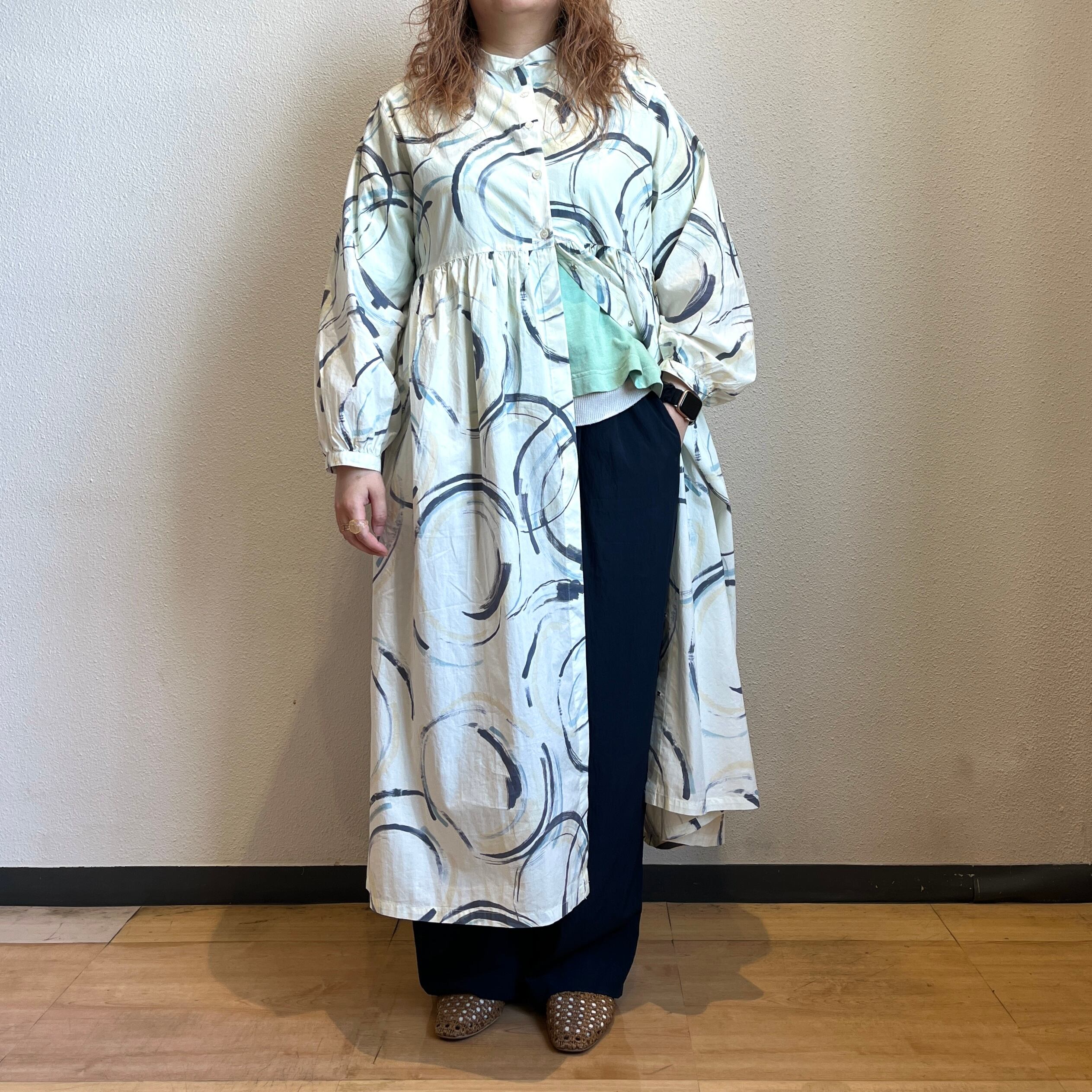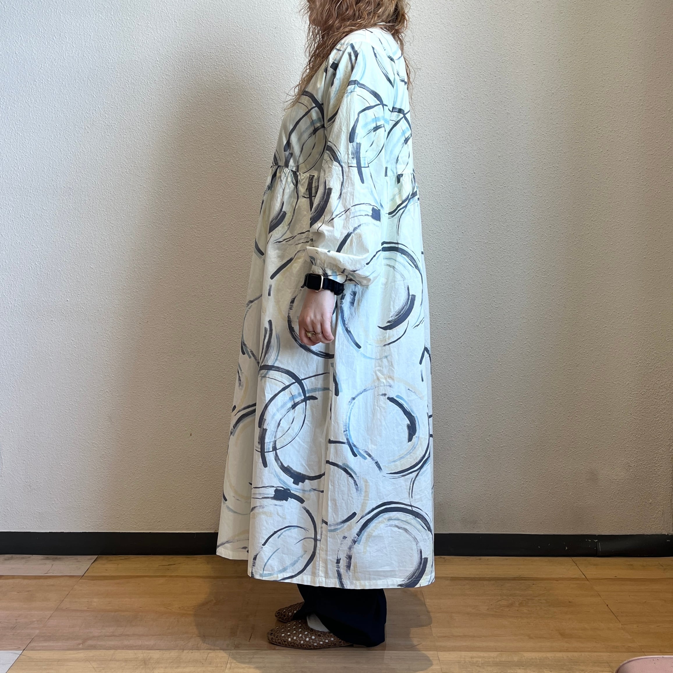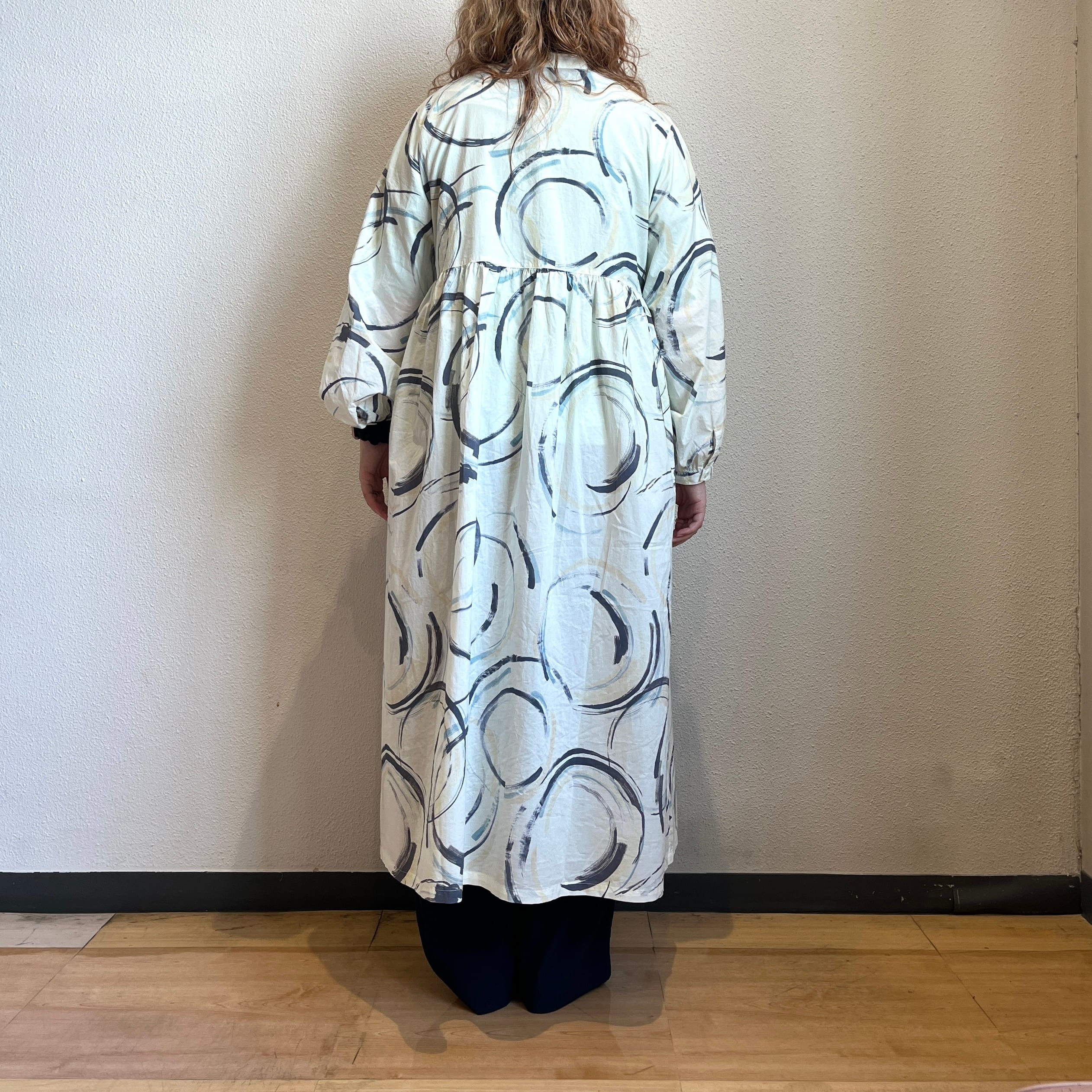 大人でも気負わずたのしめる、派手すぎないドット模様をプリントしたワンピース。ボタンが前でも後ろでも着こなせる、うれしい前後2way仕様です。高めのウエスト位置で切り替えを入れ、一枚でバランスよく決まるのも魅力的。ロング丈の羽織りとしても活用できます。