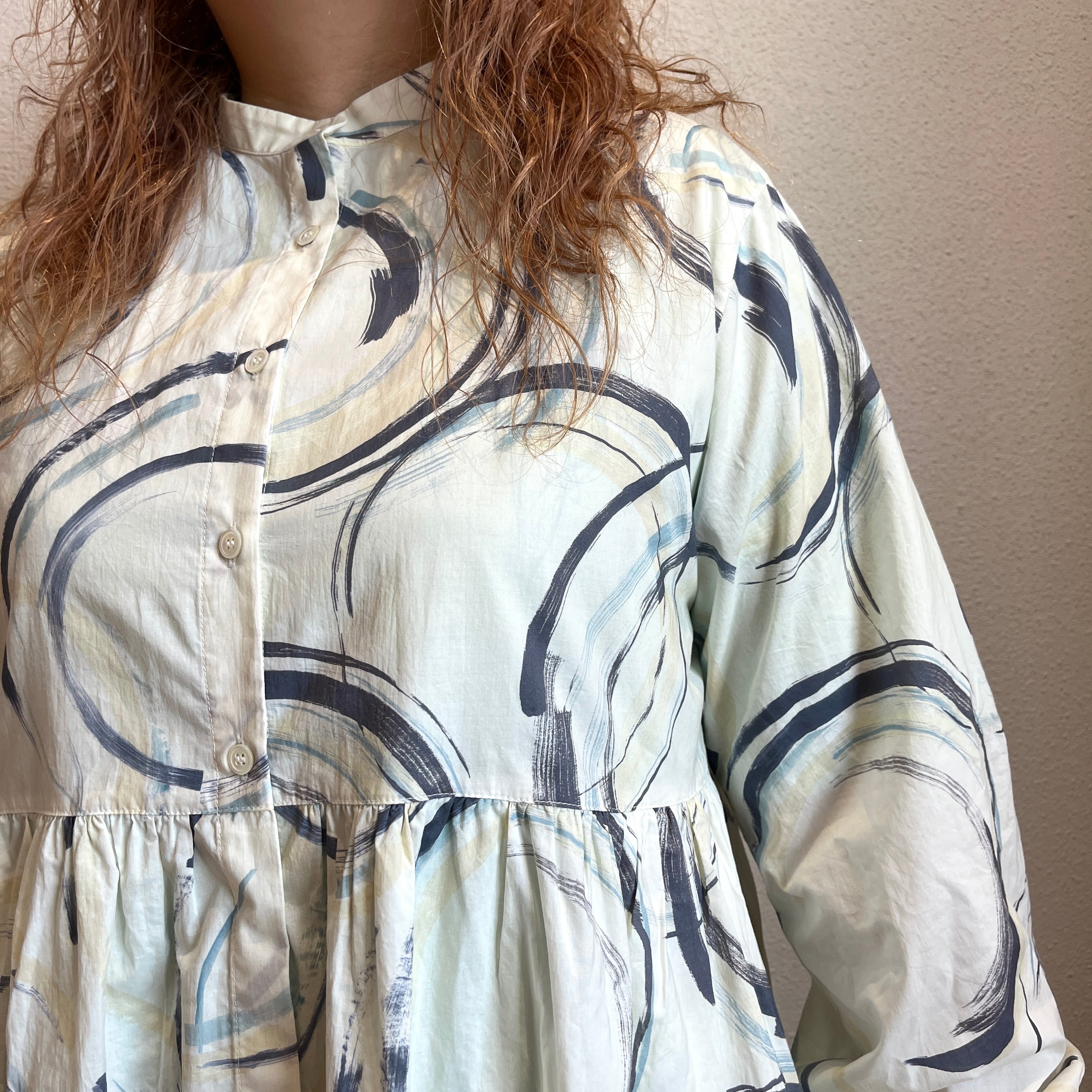 肌あたりよく仕上げたコットン布帛素材。絵の具でペイントしたような、抜け感たっぷりなドット模様を全面にインクジェットプリントしています。