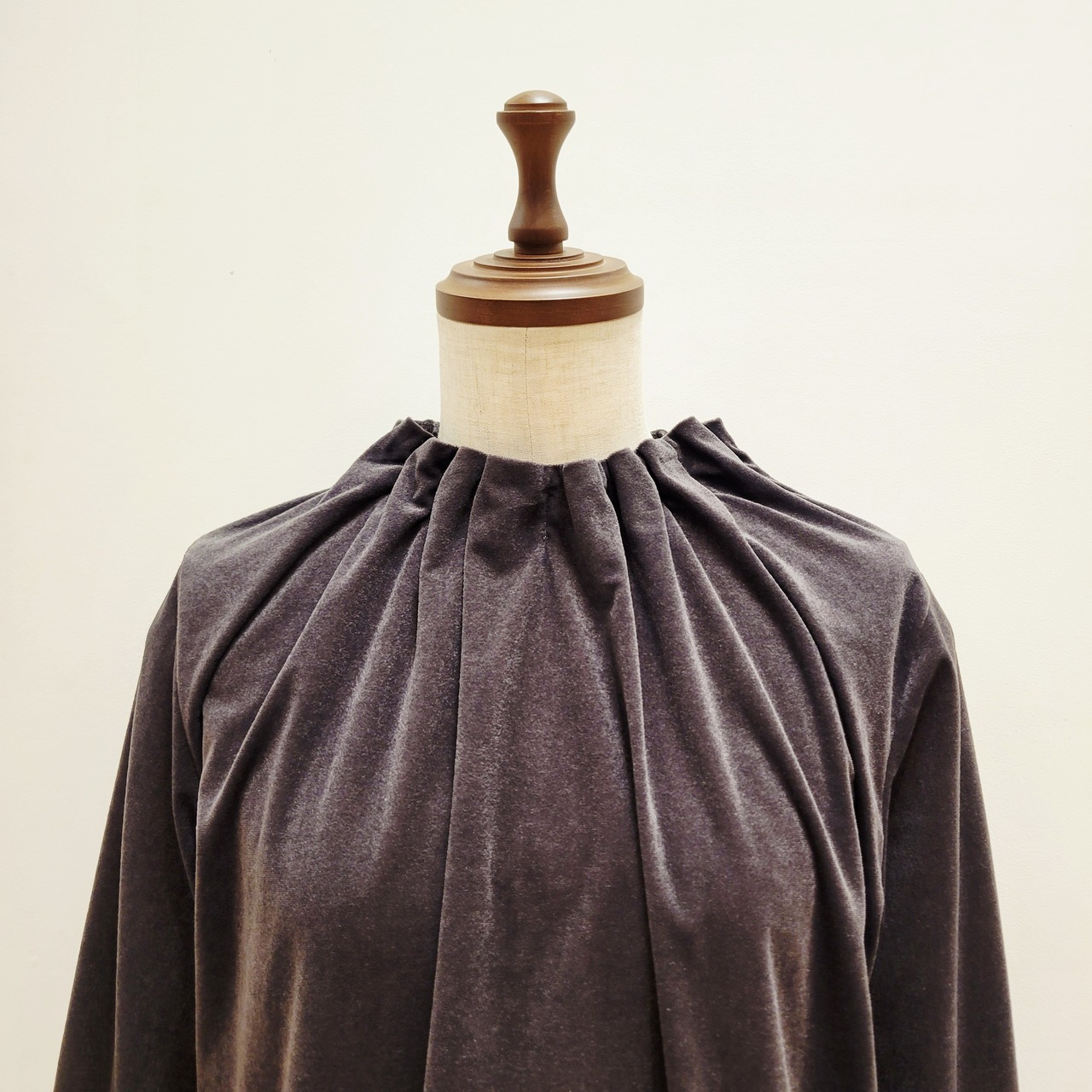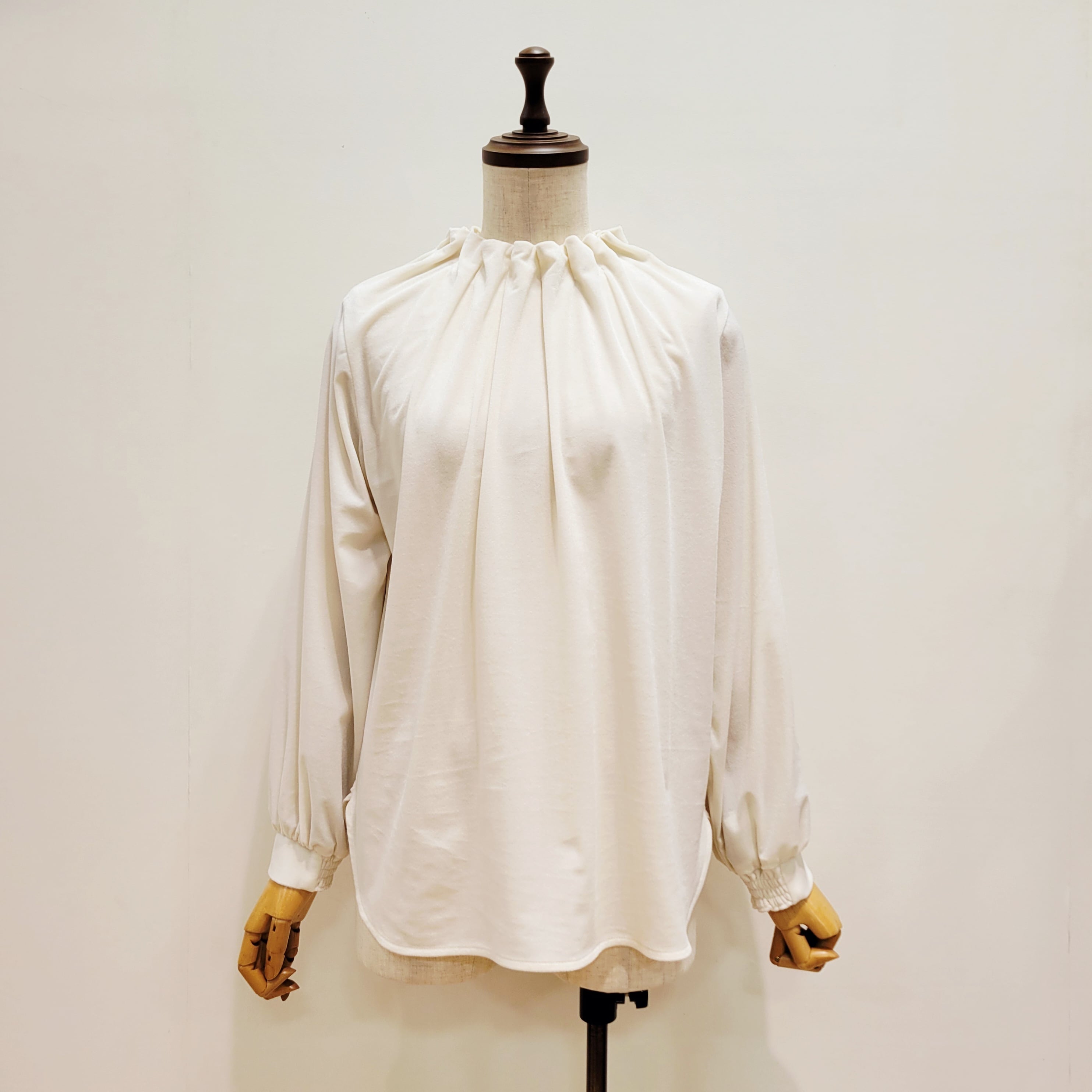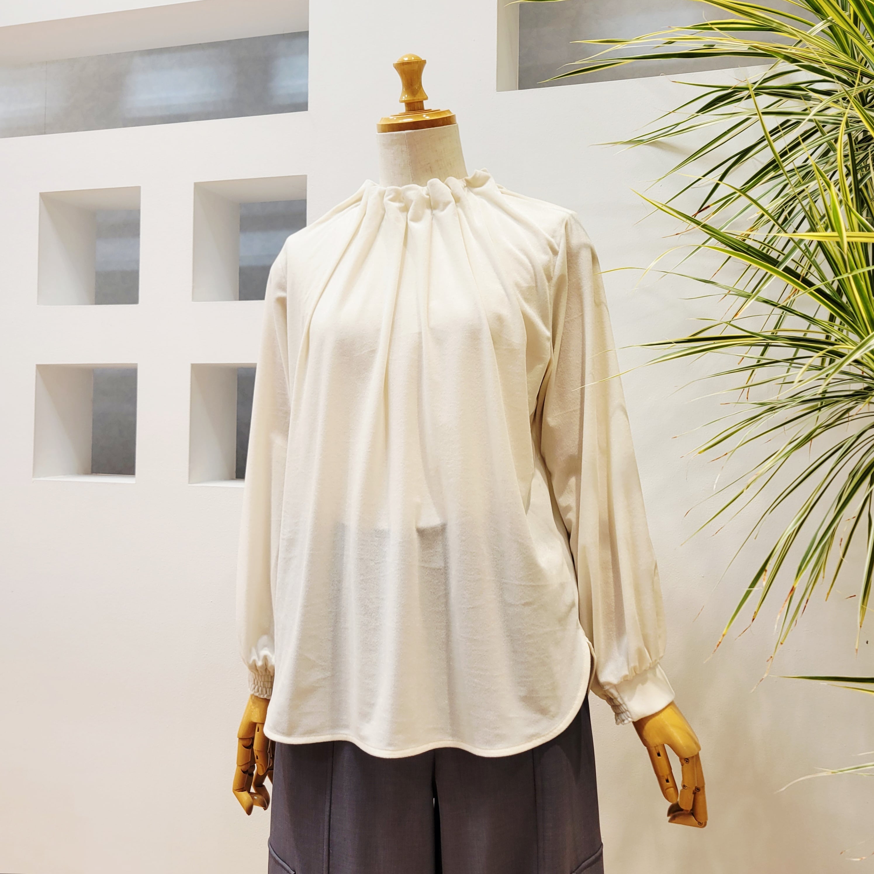 スタンドネックの内側に通気性の良いゴムをたたきギャザーを寄せたデザイン。