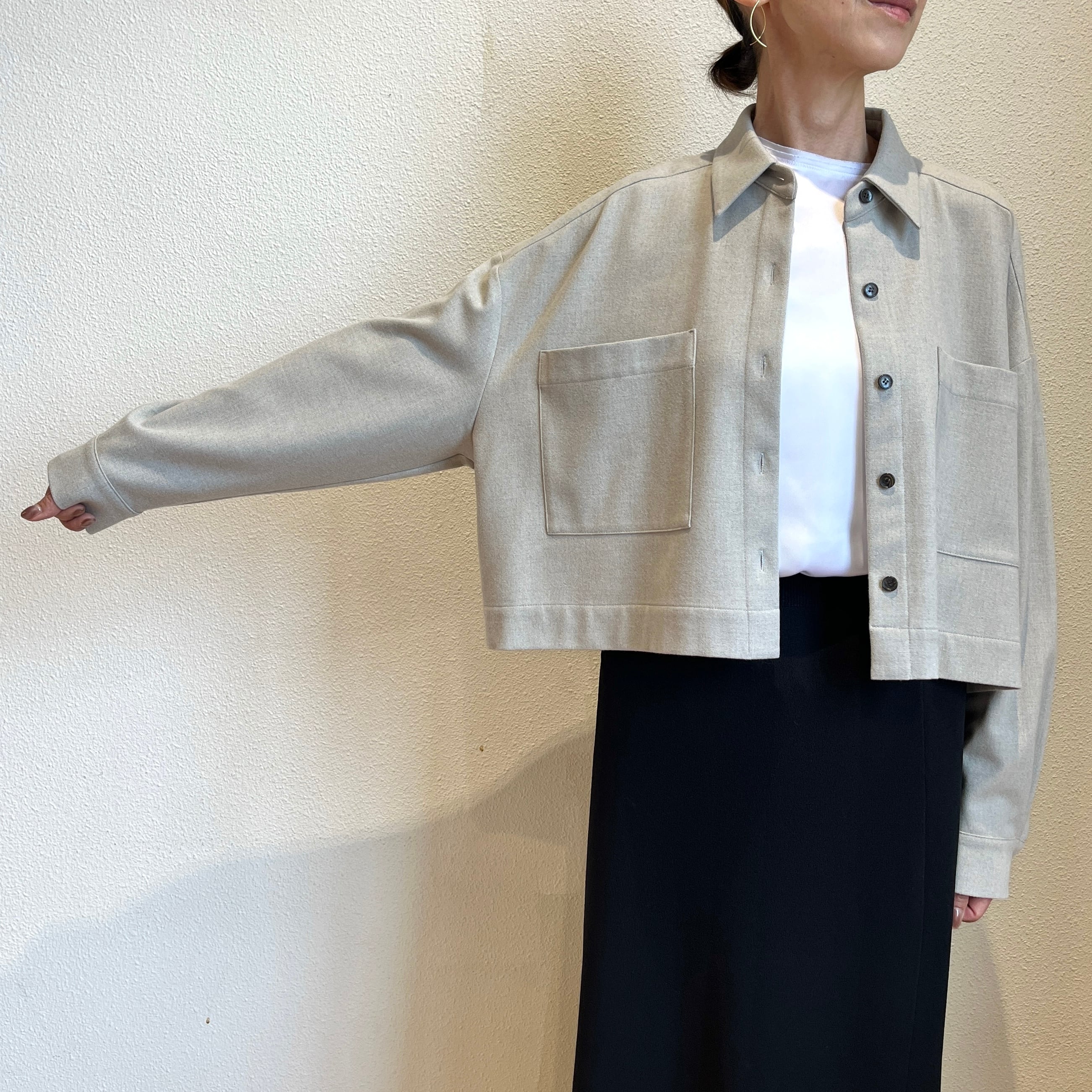 着丈が短めのショートジャケットはボリューム感のあるボトムスとぴったり。