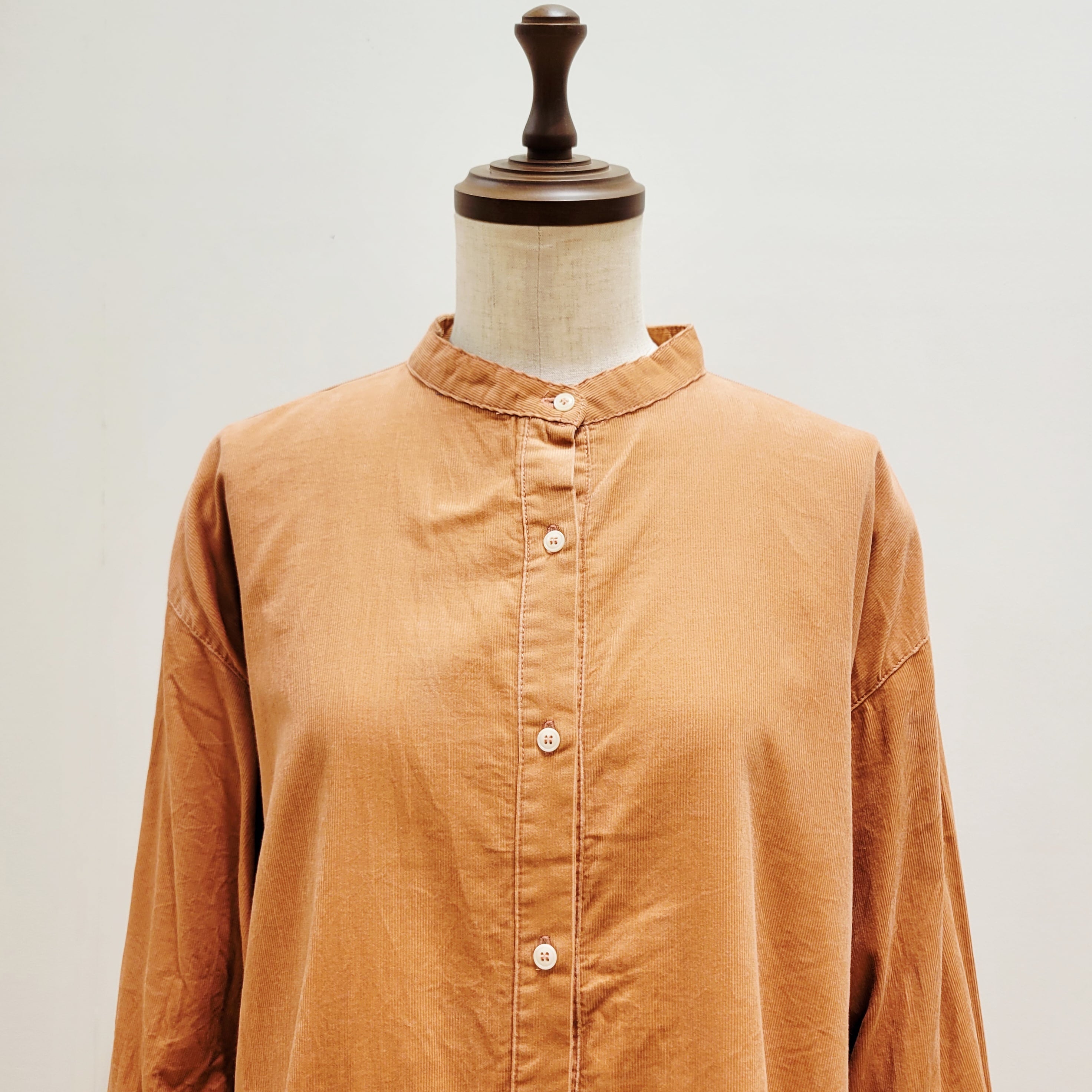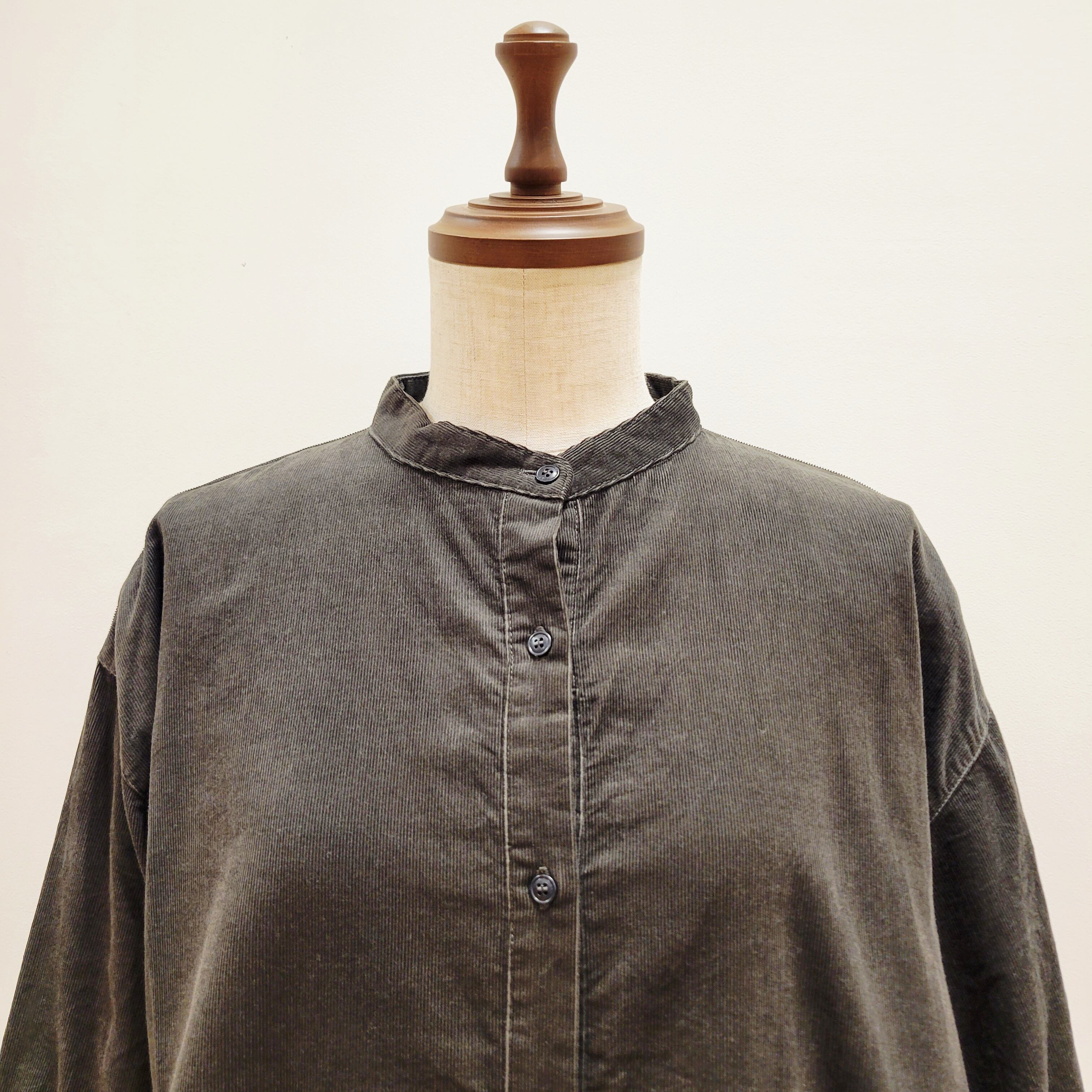 ゆったりとした身幅のあるシルエットですが、トレンドのバンドカラータイプのネックが