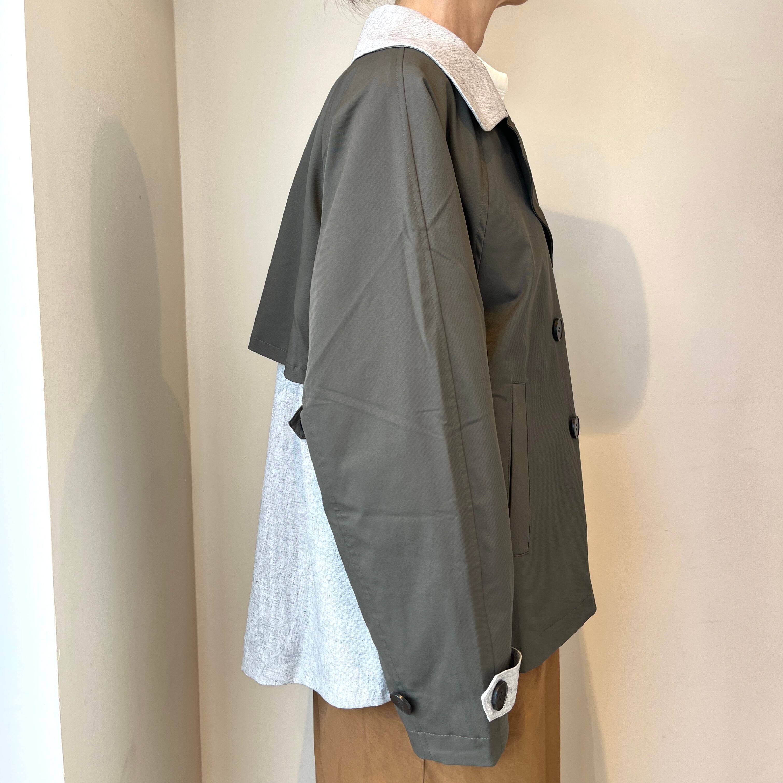 衿や後身頃にはリネン混の素材をドッキングし、バイカラーの配色が特徴的です。