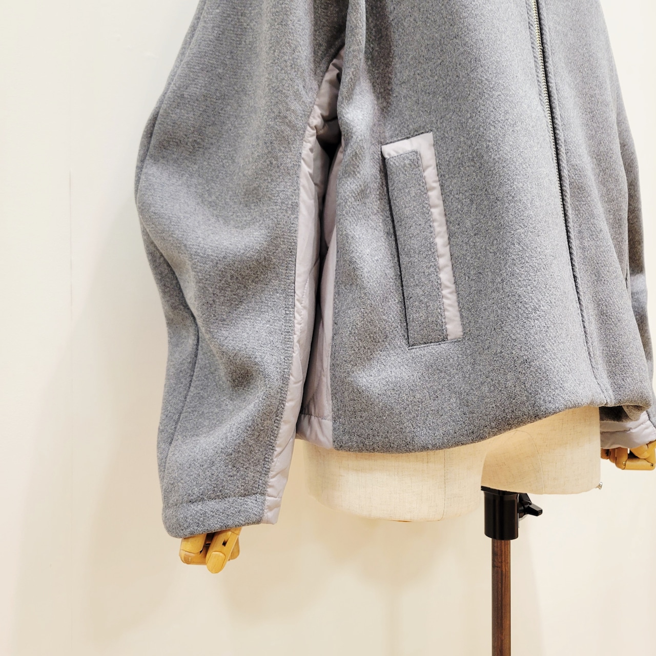 柔らかなメルトン素材に、ハリのあり光沢感のあるキルティングを組み合わせたユニークなデザインが特徴。