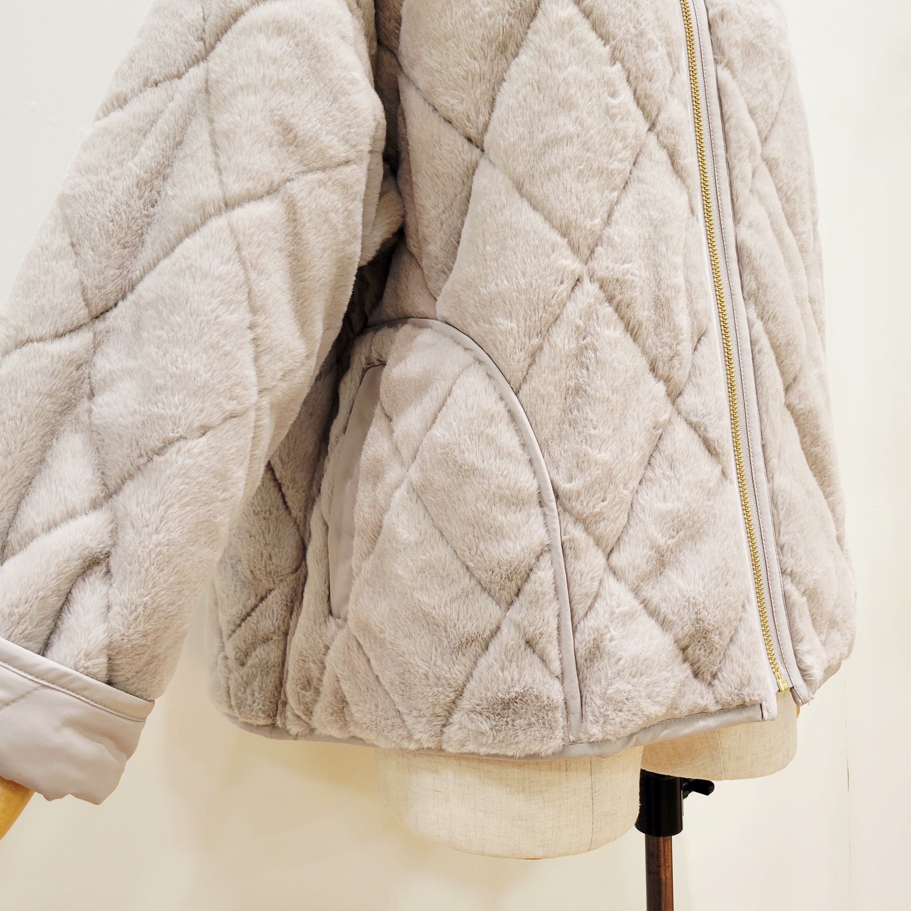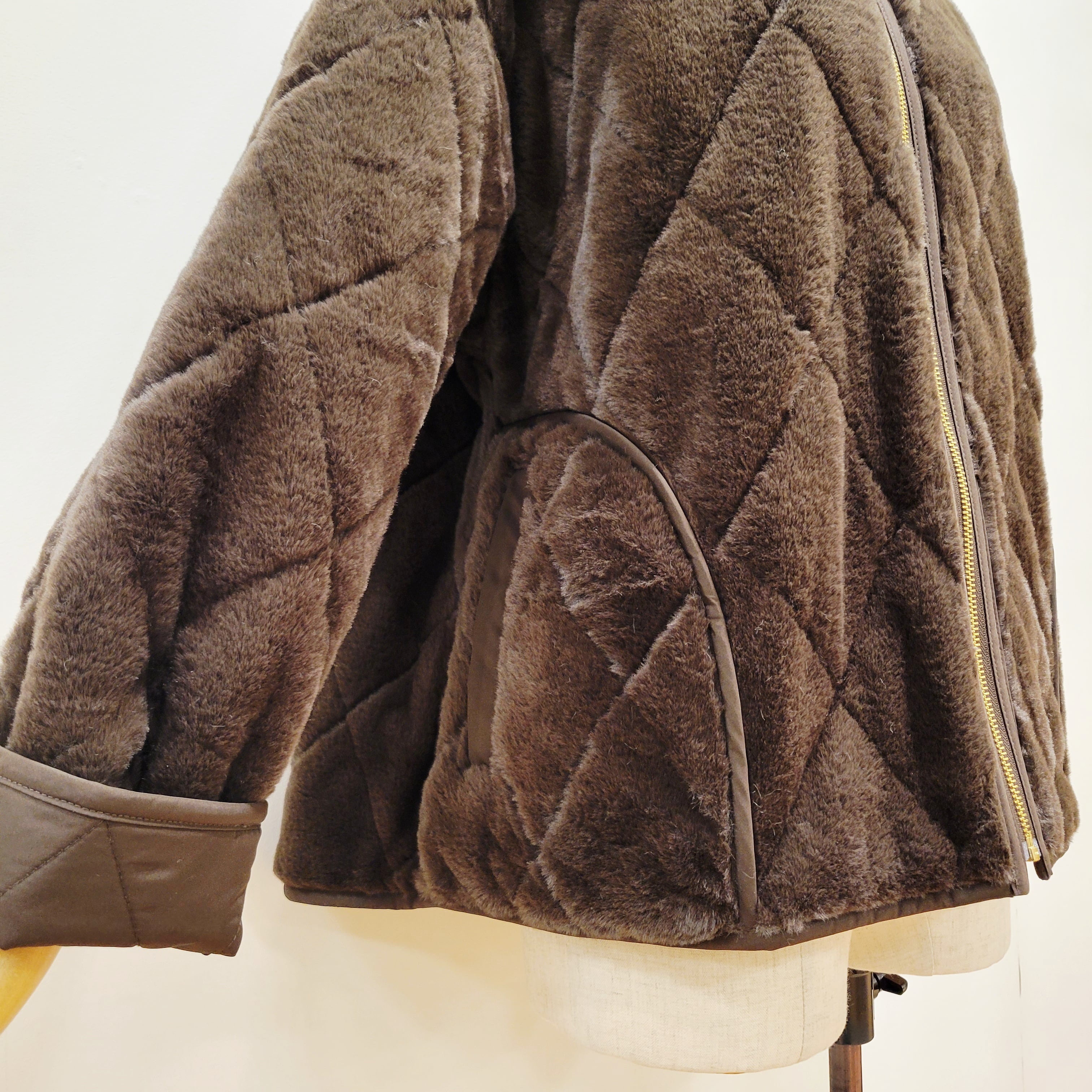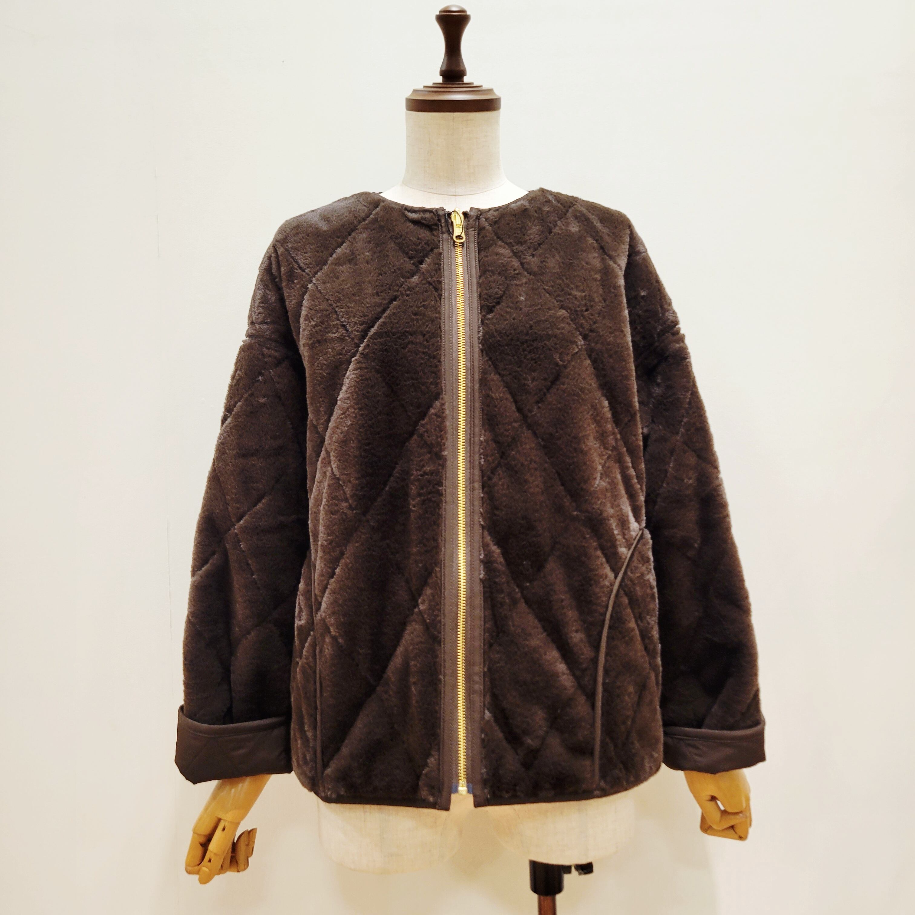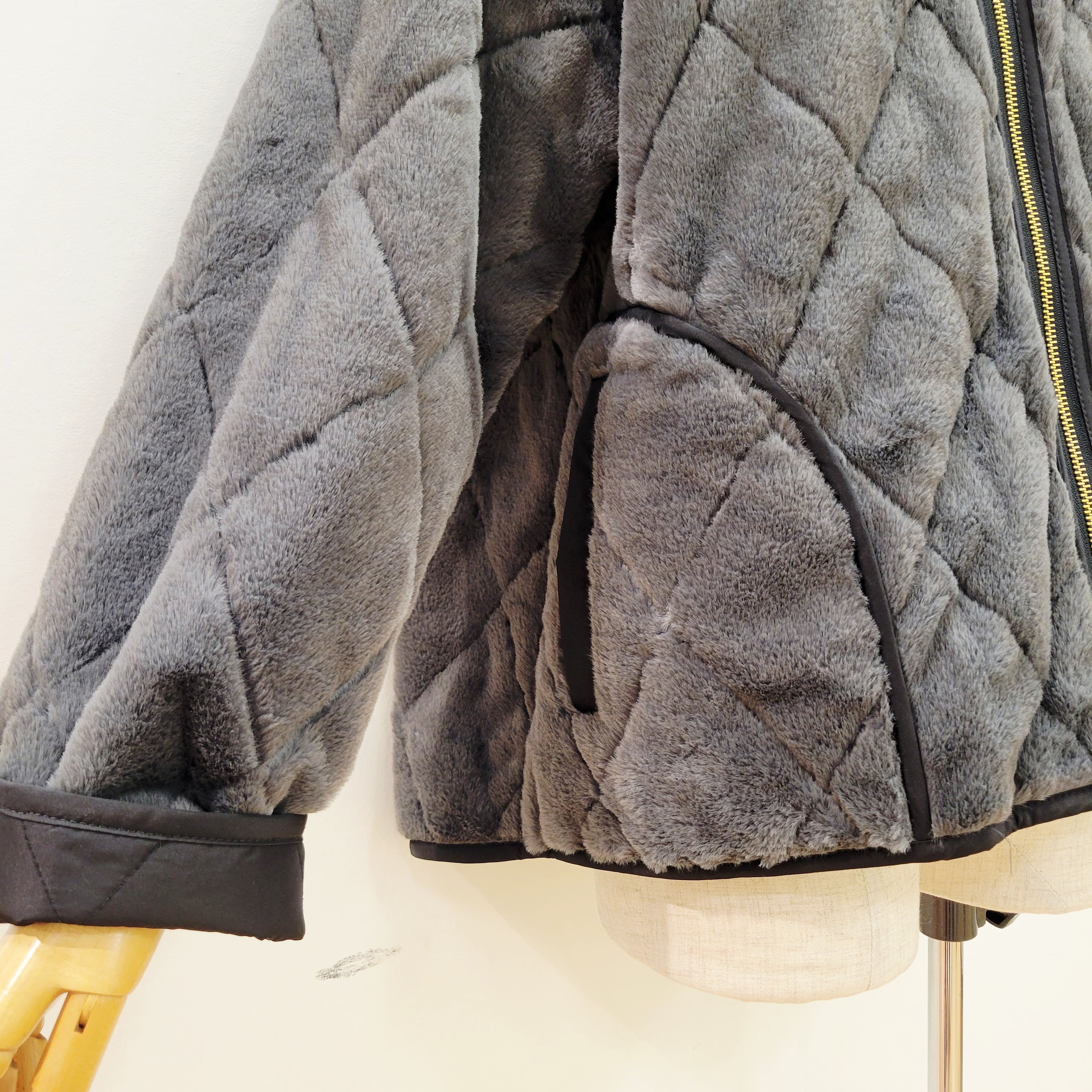 トラッドな雰囲気のキルティングデザインをフェイクファー生地の裏地にも施した