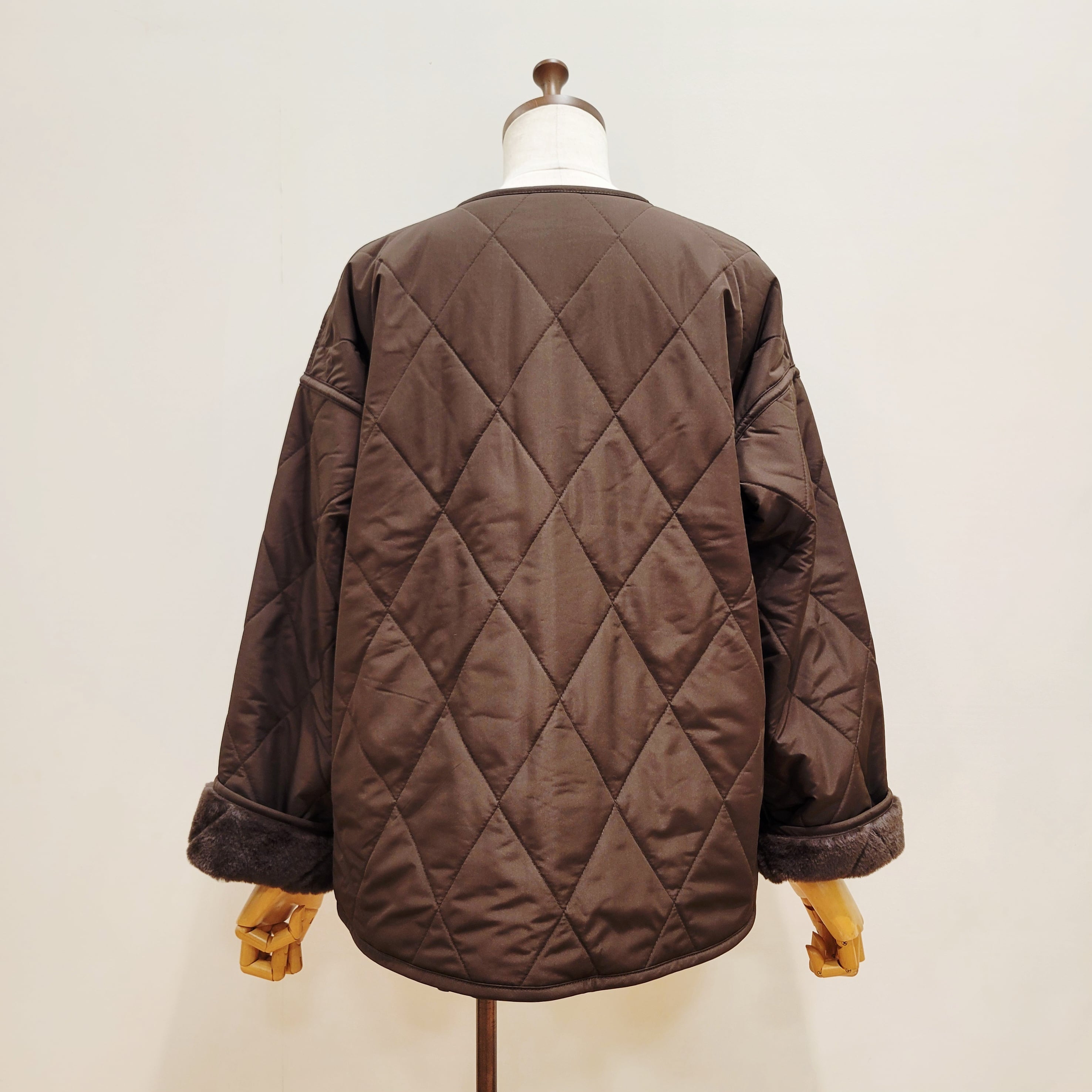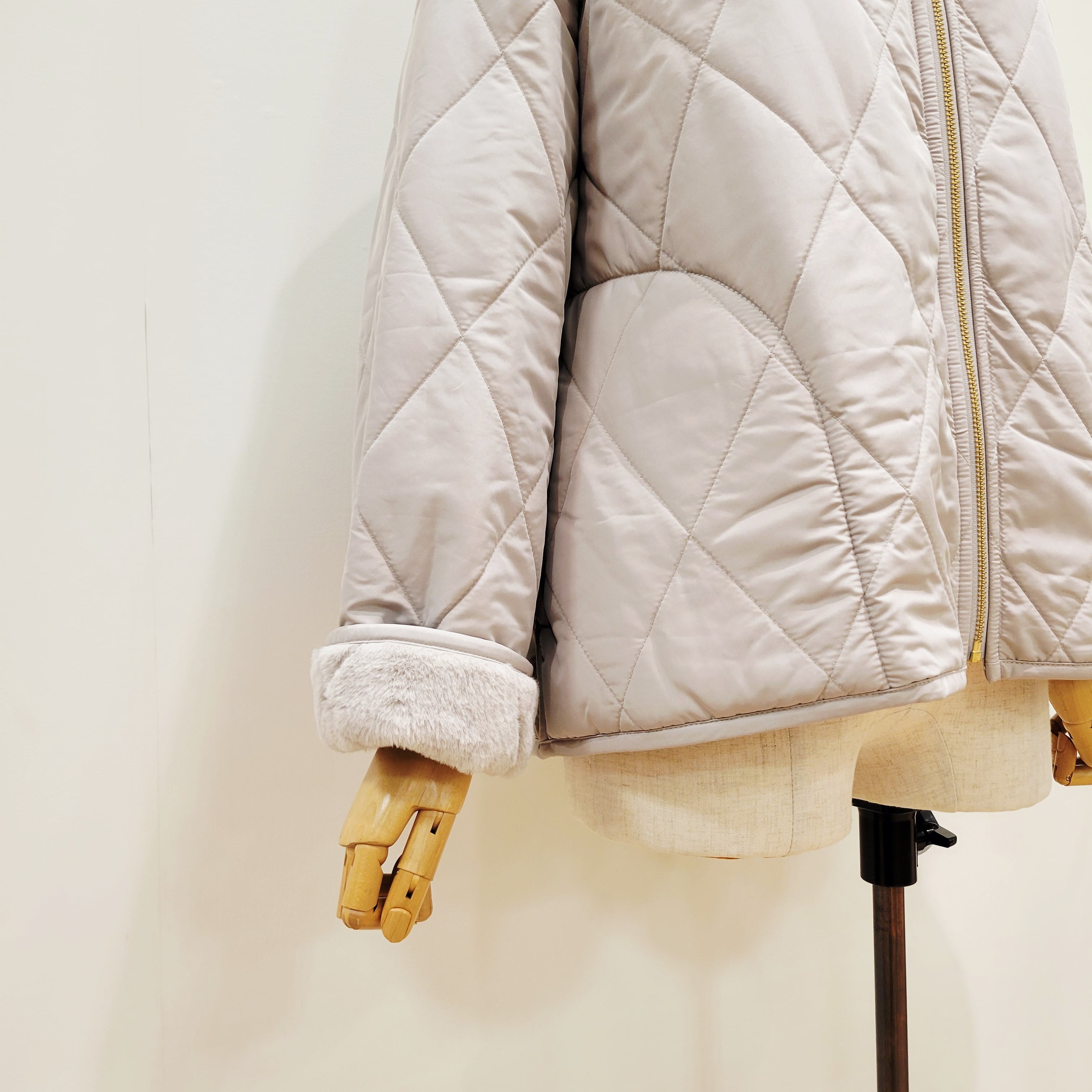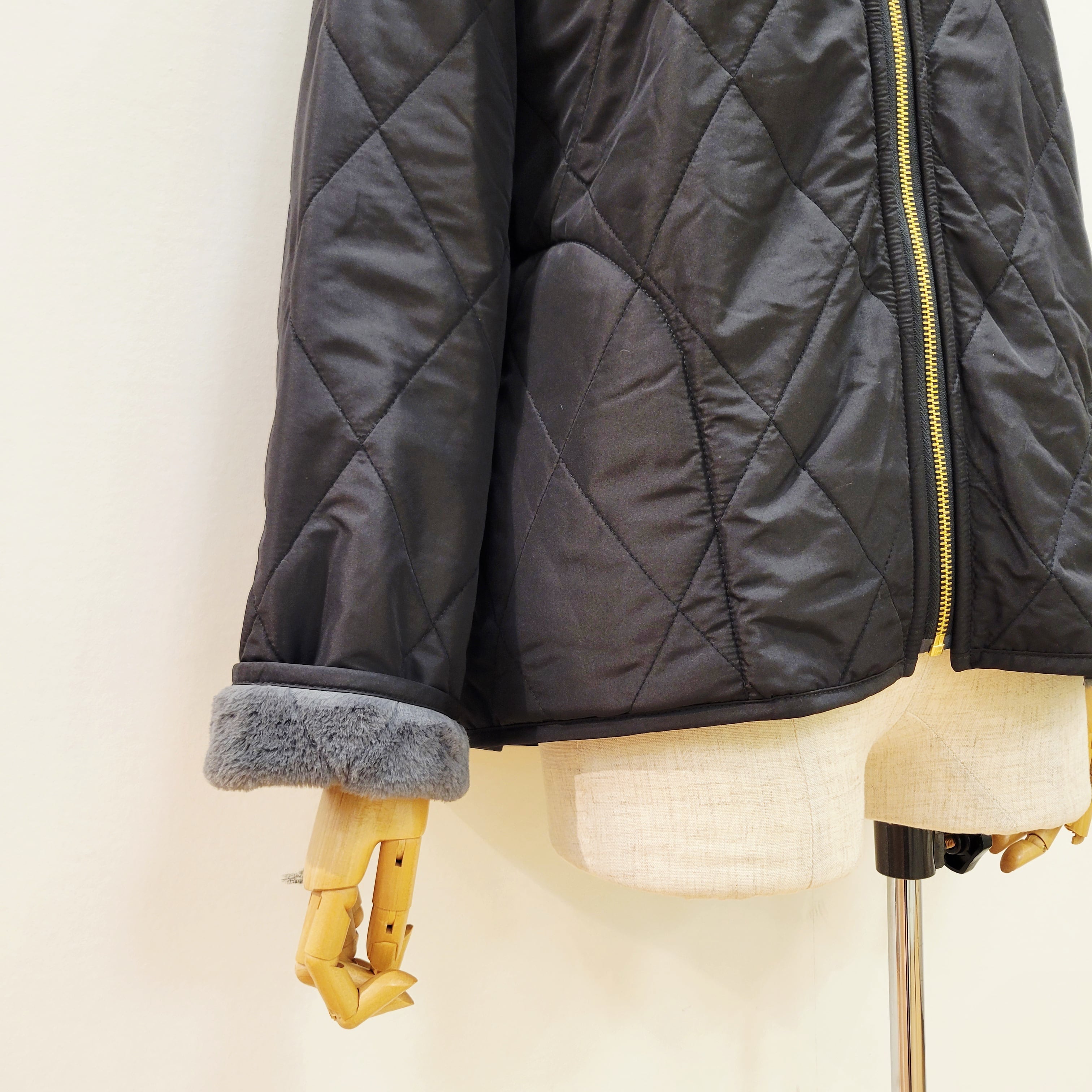 トラッドな雰囲気のキルティングデザインをフェイクファー生地の裏地にも施した