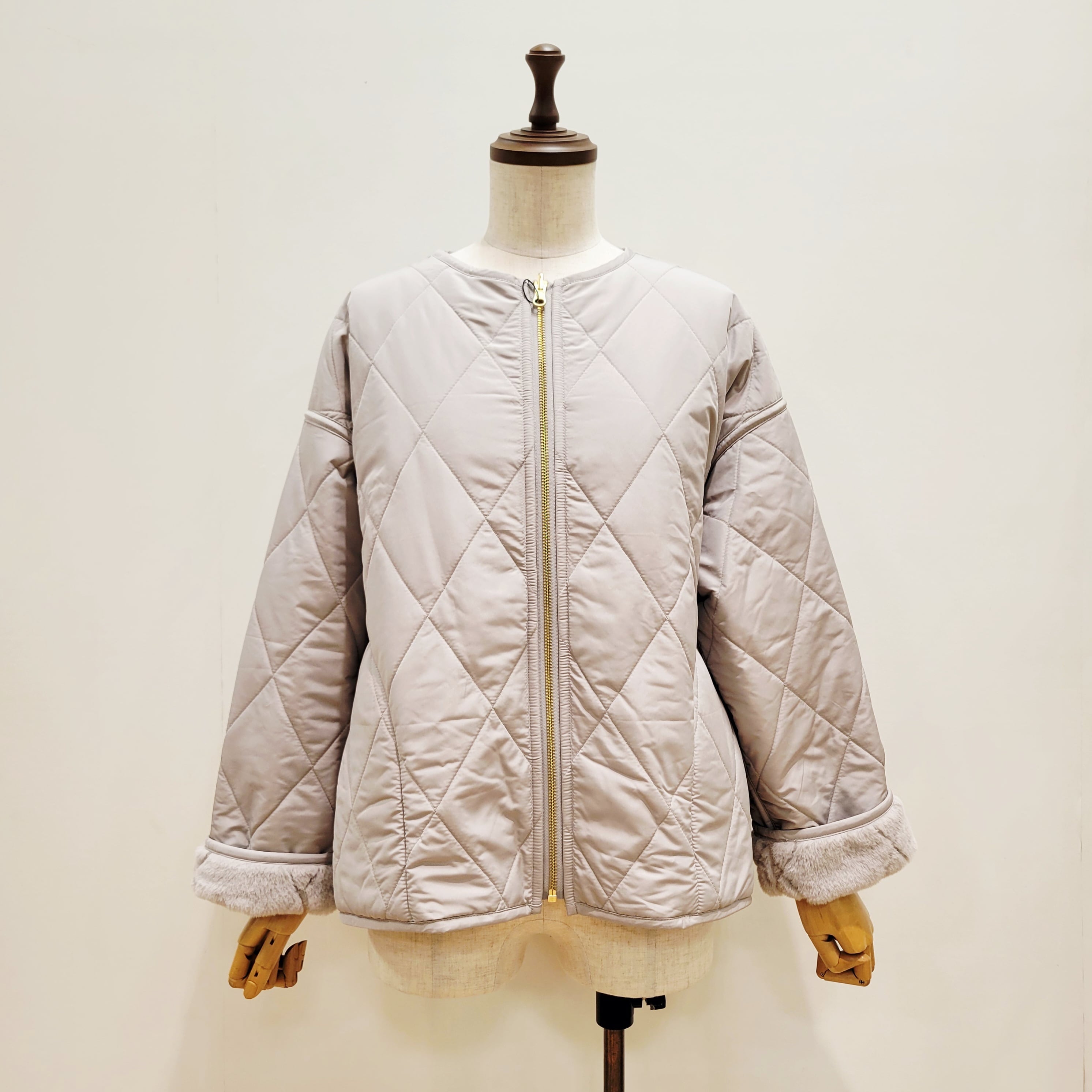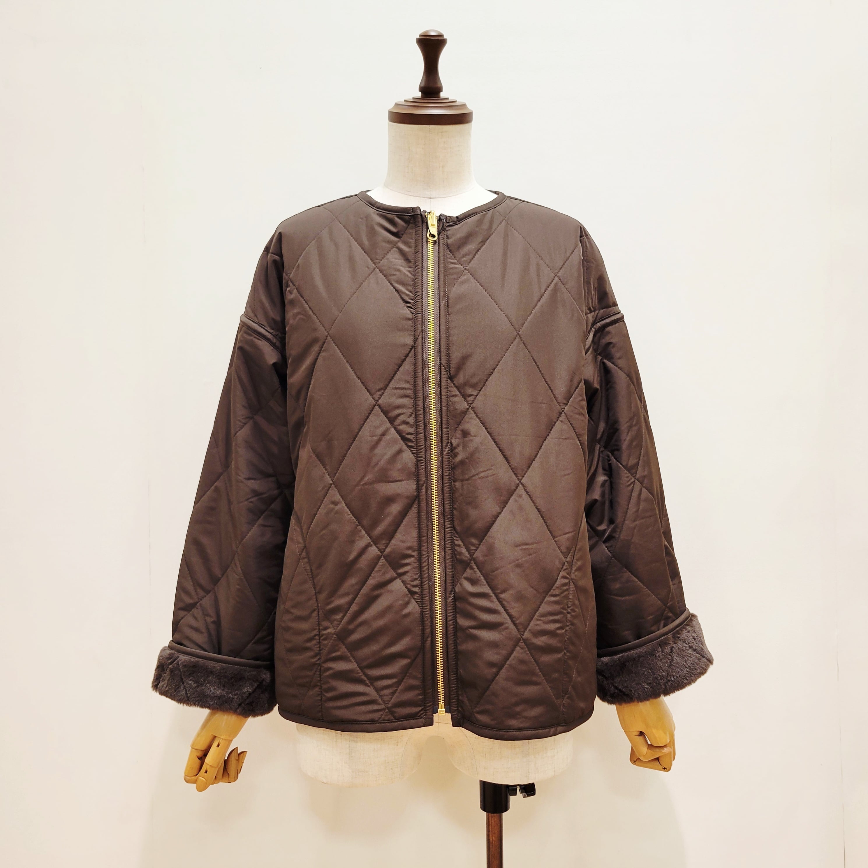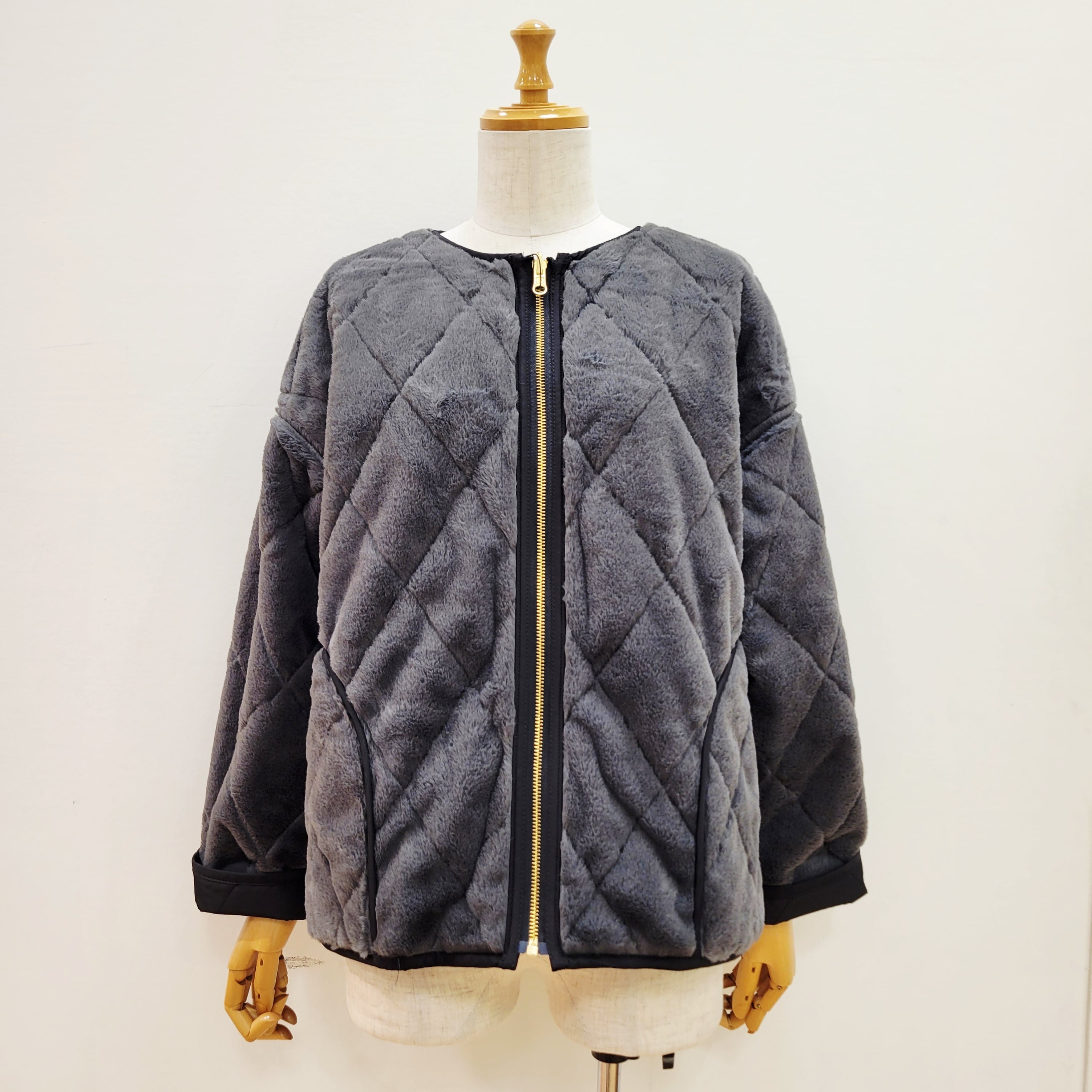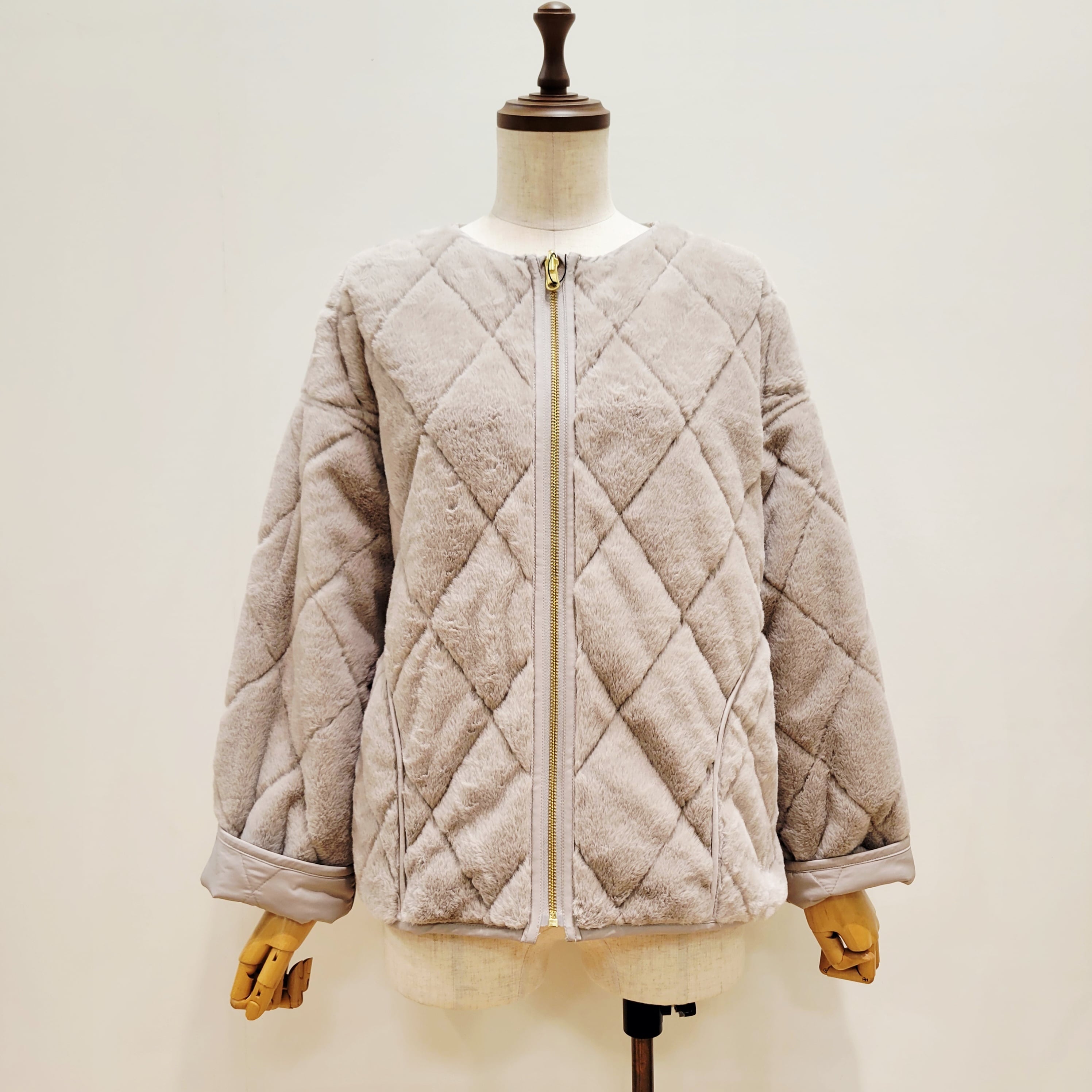 トラッドな雰囲気のキルティングデザインをフェイクファー生地の裏地にも施した
