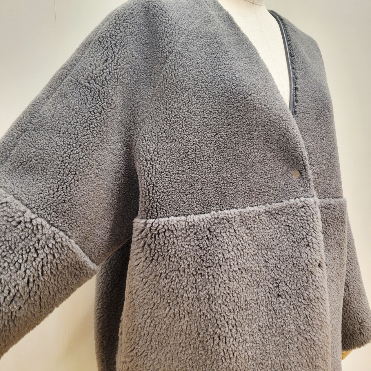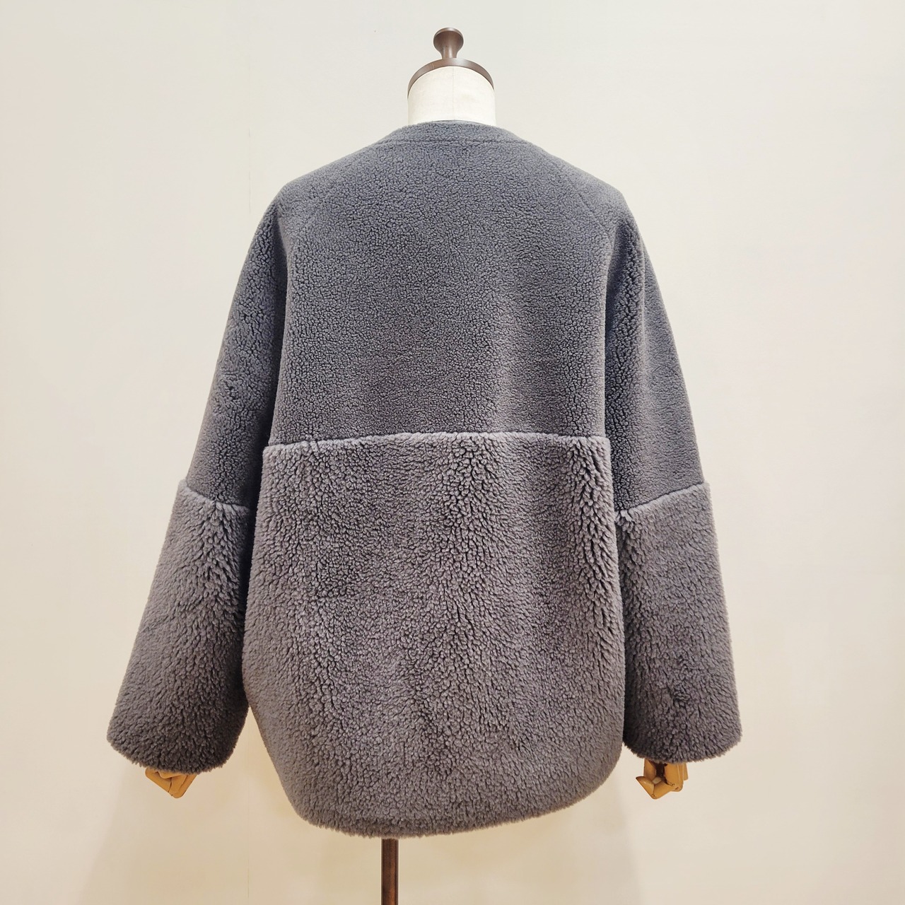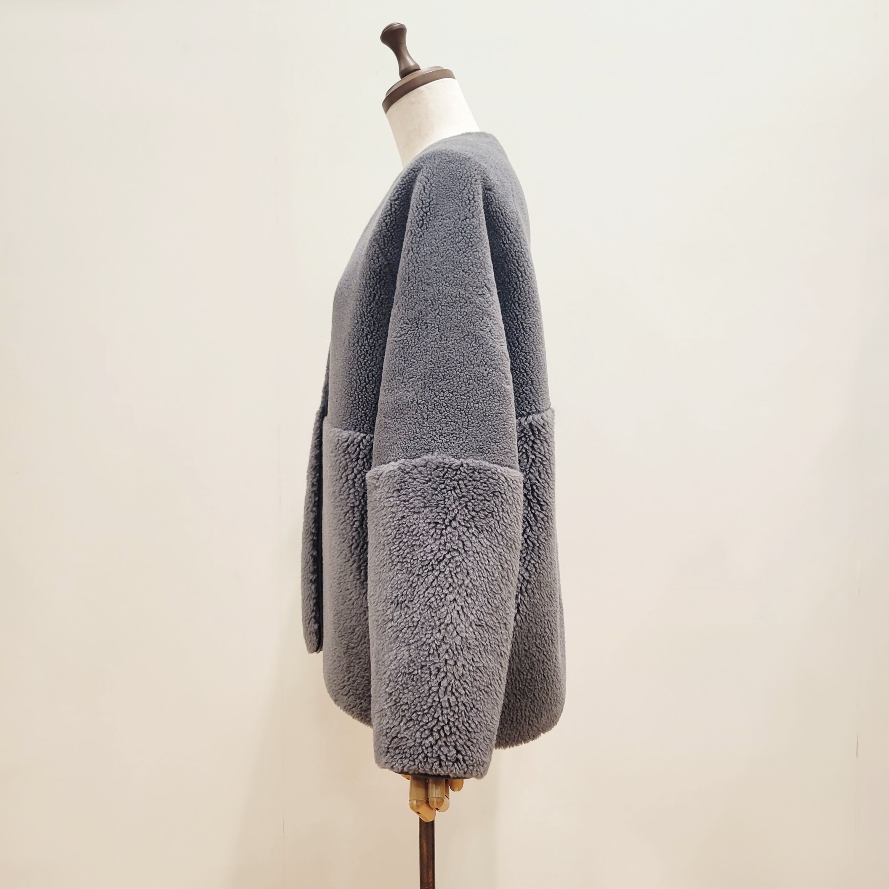 表面は毛足の異なるボアを袖とウエストあたりで切り替えた表情あるデザイン、