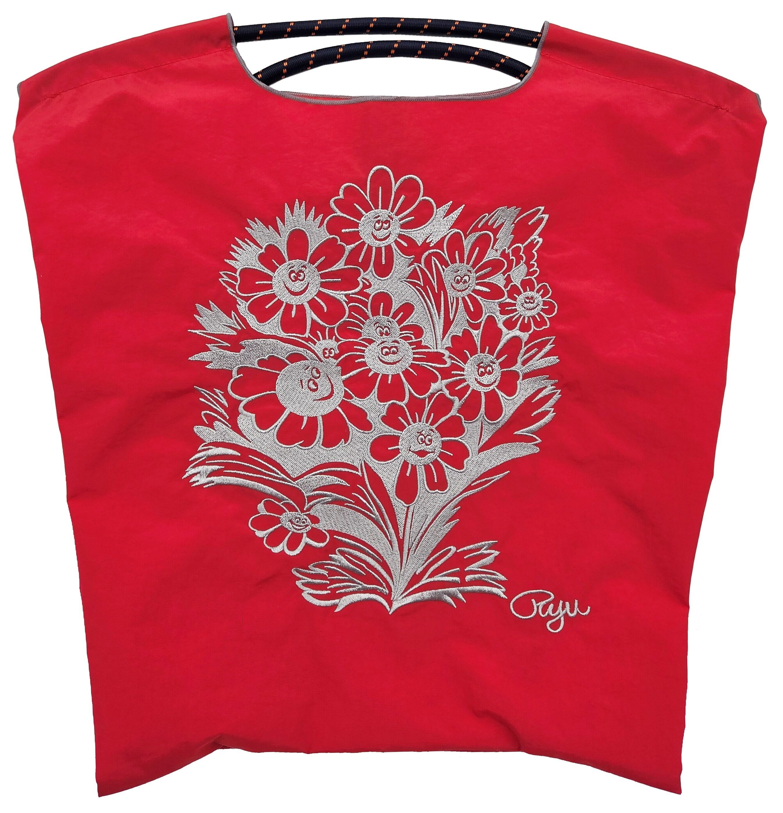 耐久性、撥水性に優れた厚手のポリエステル素材に、 グラフィックデザインをそのまま「刺繍」で施すことで、 高級感がありデザイン性の高いバッグとなっています。