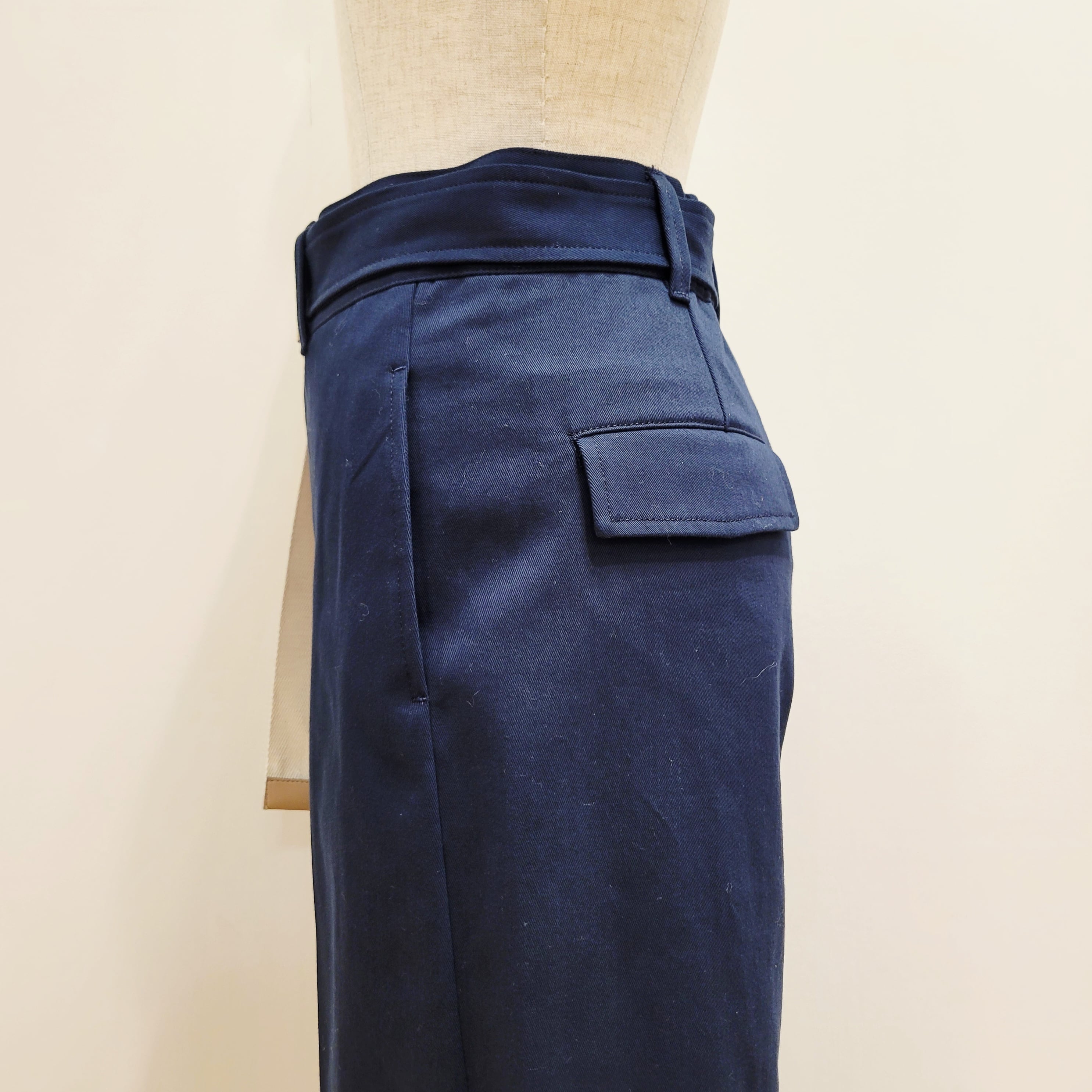 丈夫な綿素材を使った、チノパンツ特有のマットな質感に光沢感、センタープレスも加えた
