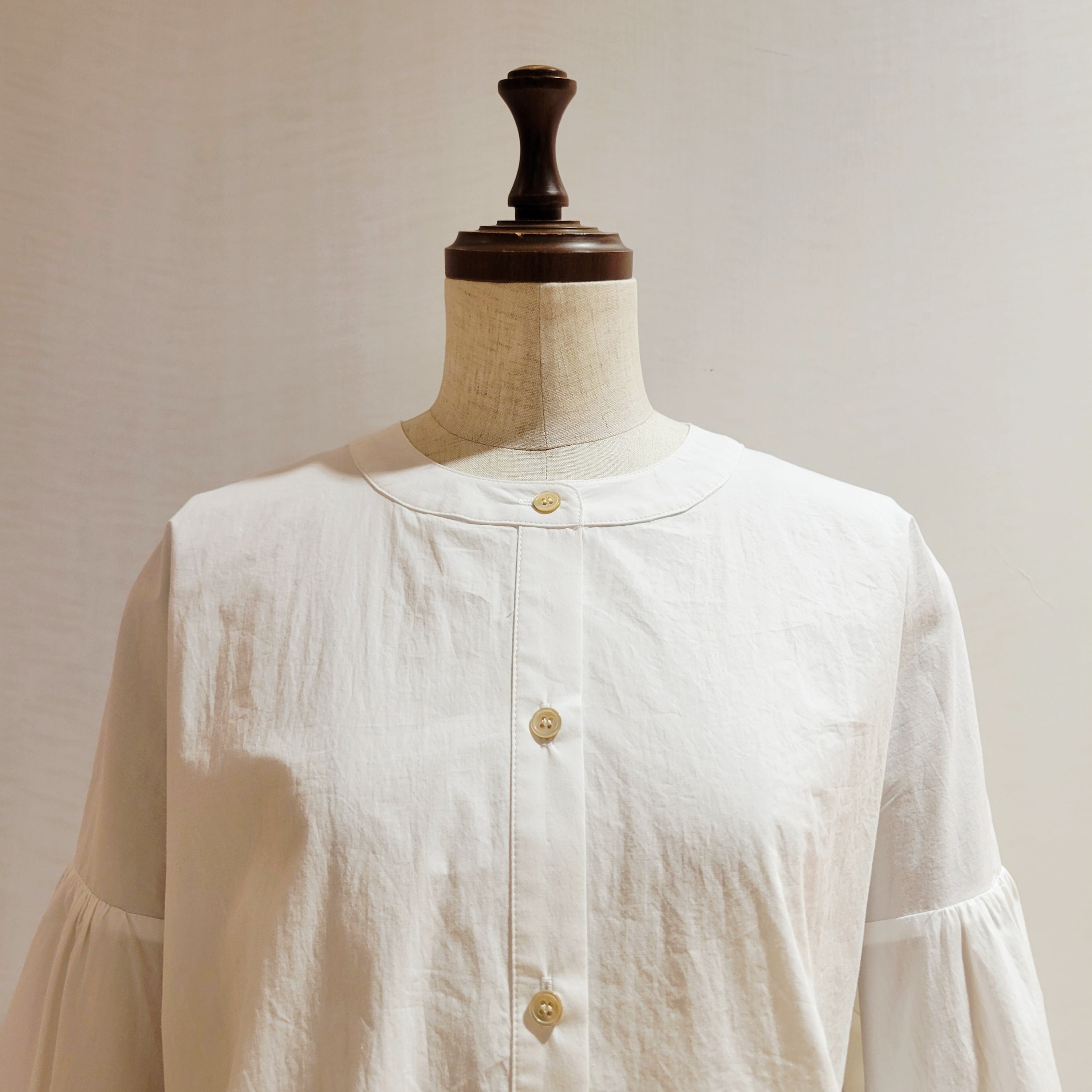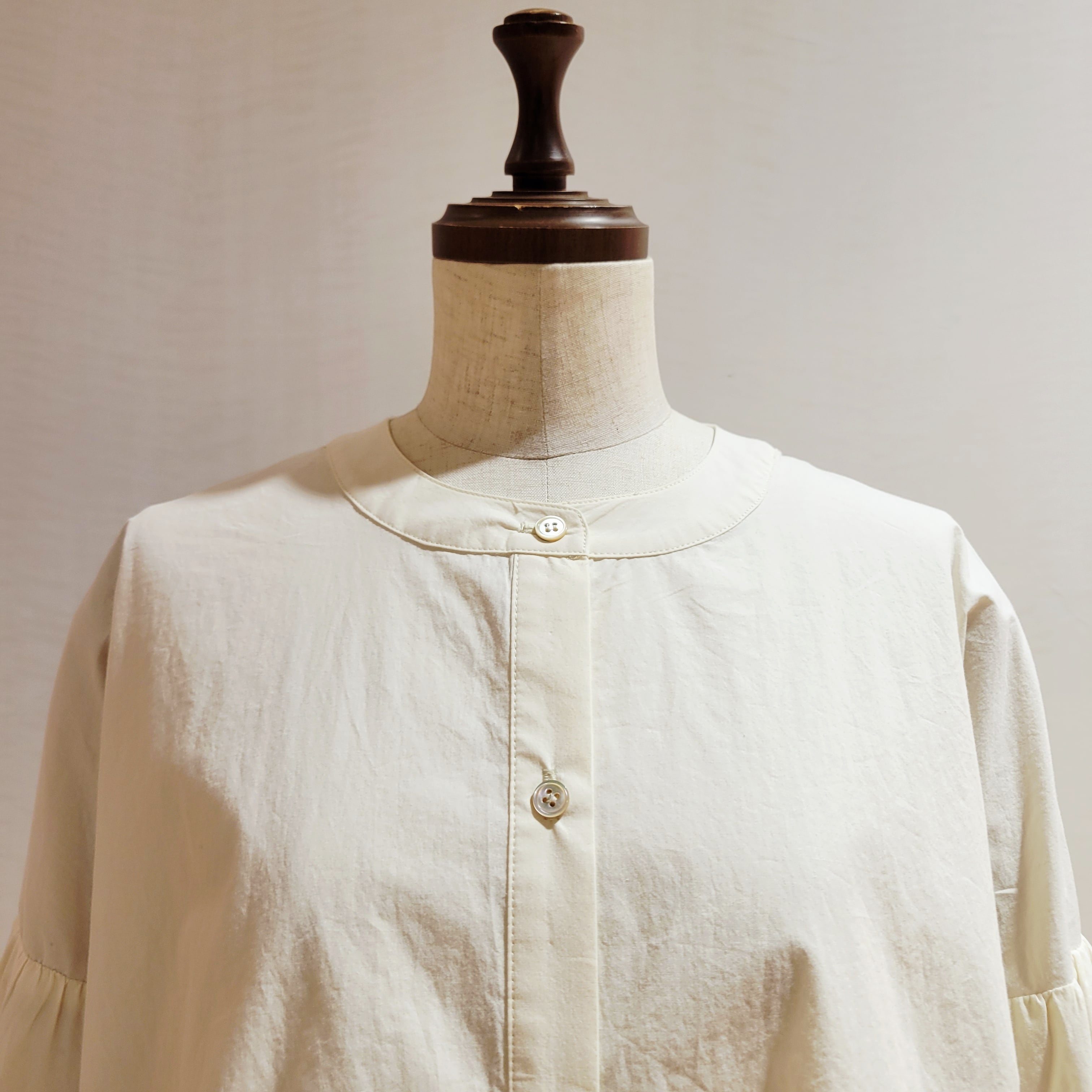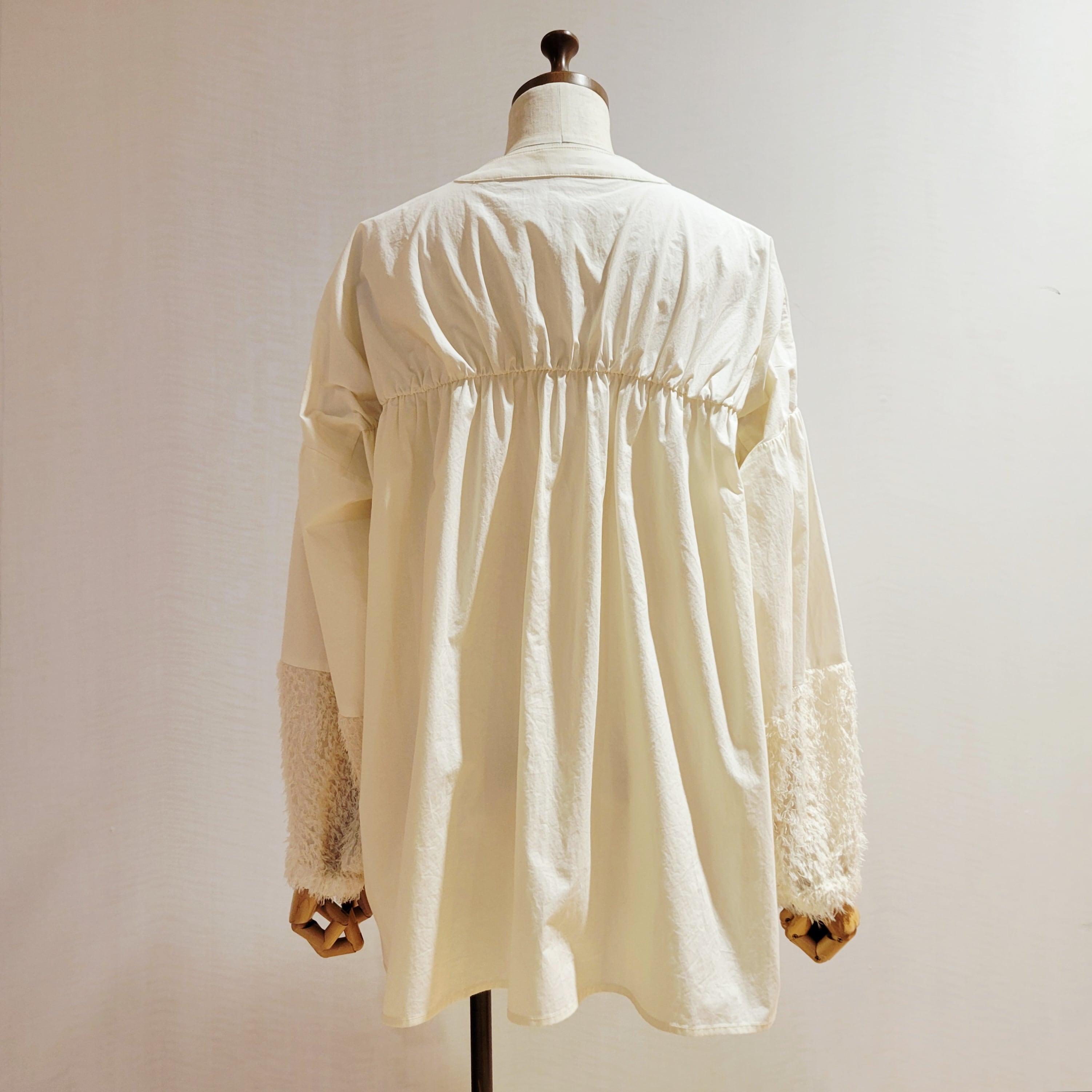 バンドカラーと前身頃はスッキリ見せ、後ろ身頃で背中にギャザーをよせ