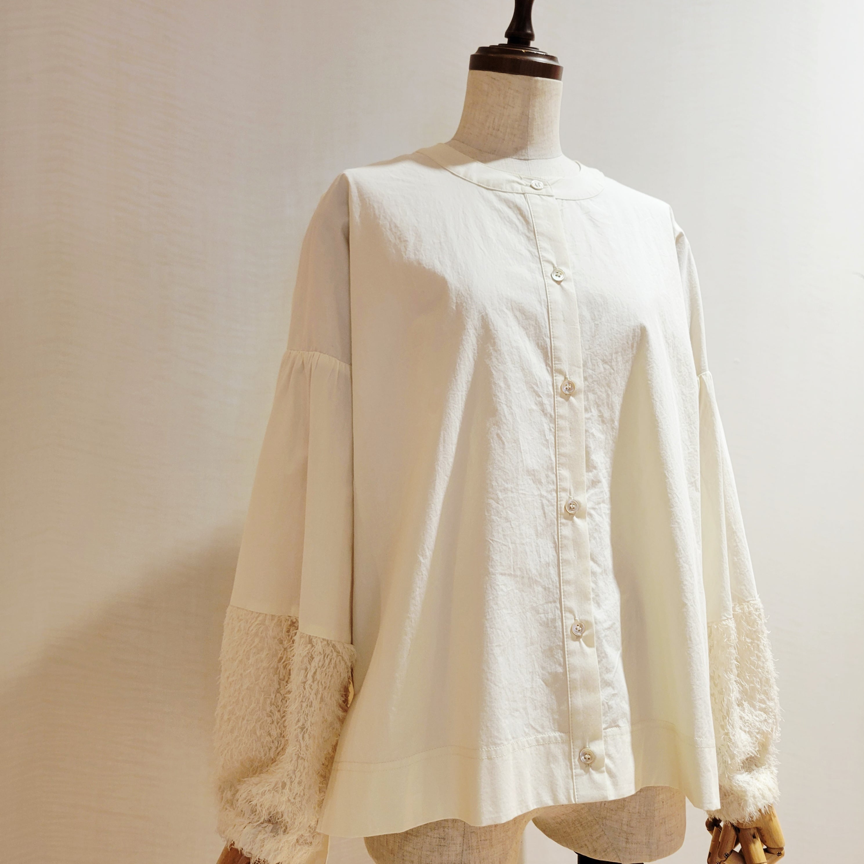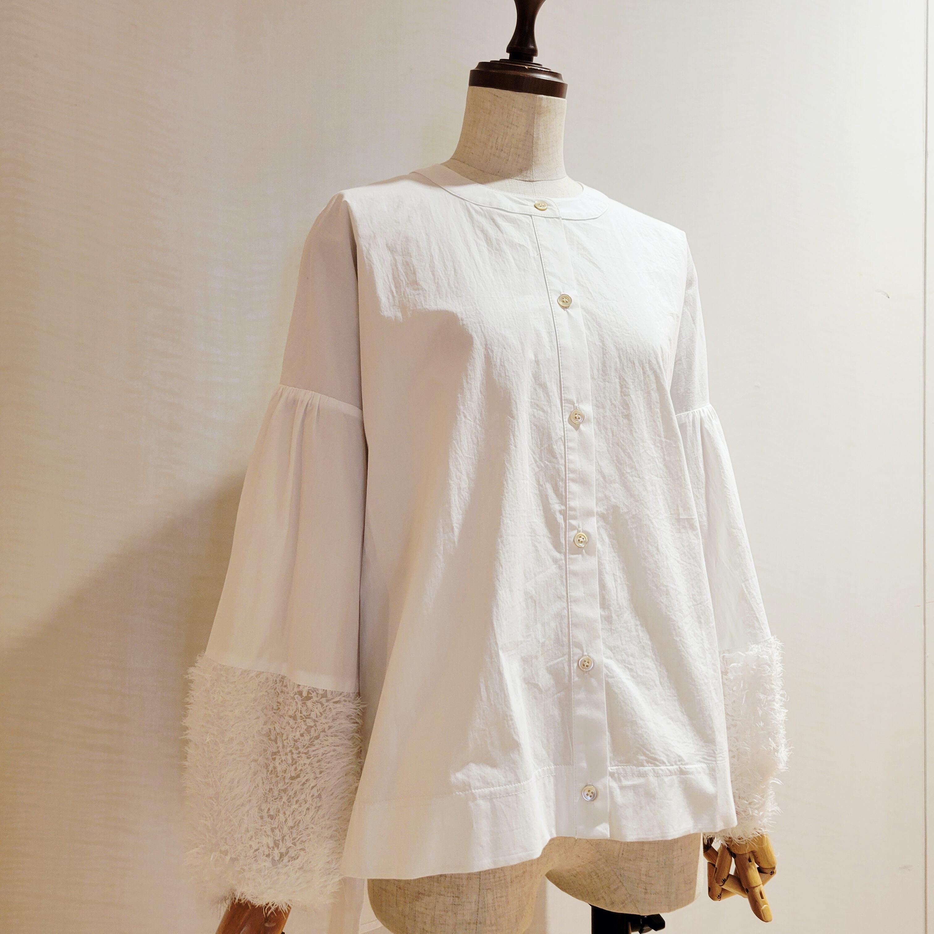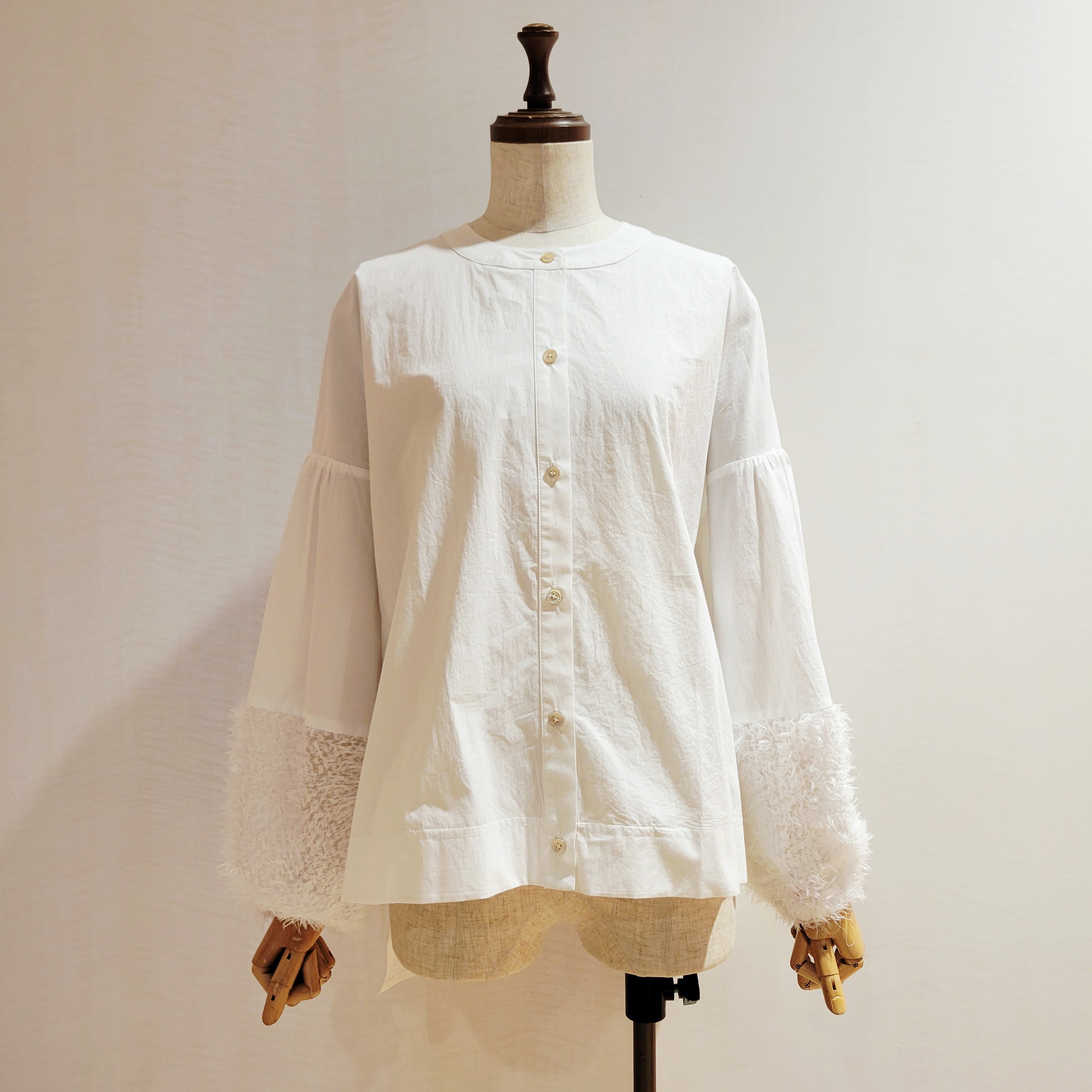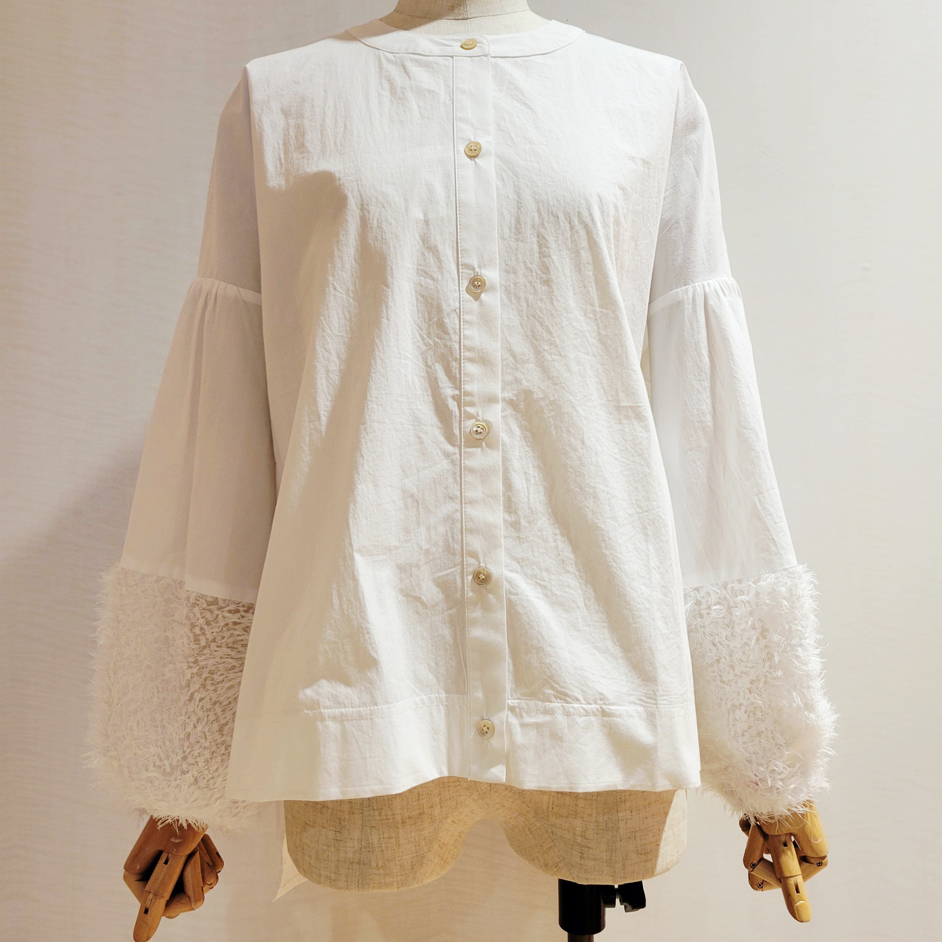 袖口をフェザーで切替がかわいいシャツブラウスです。