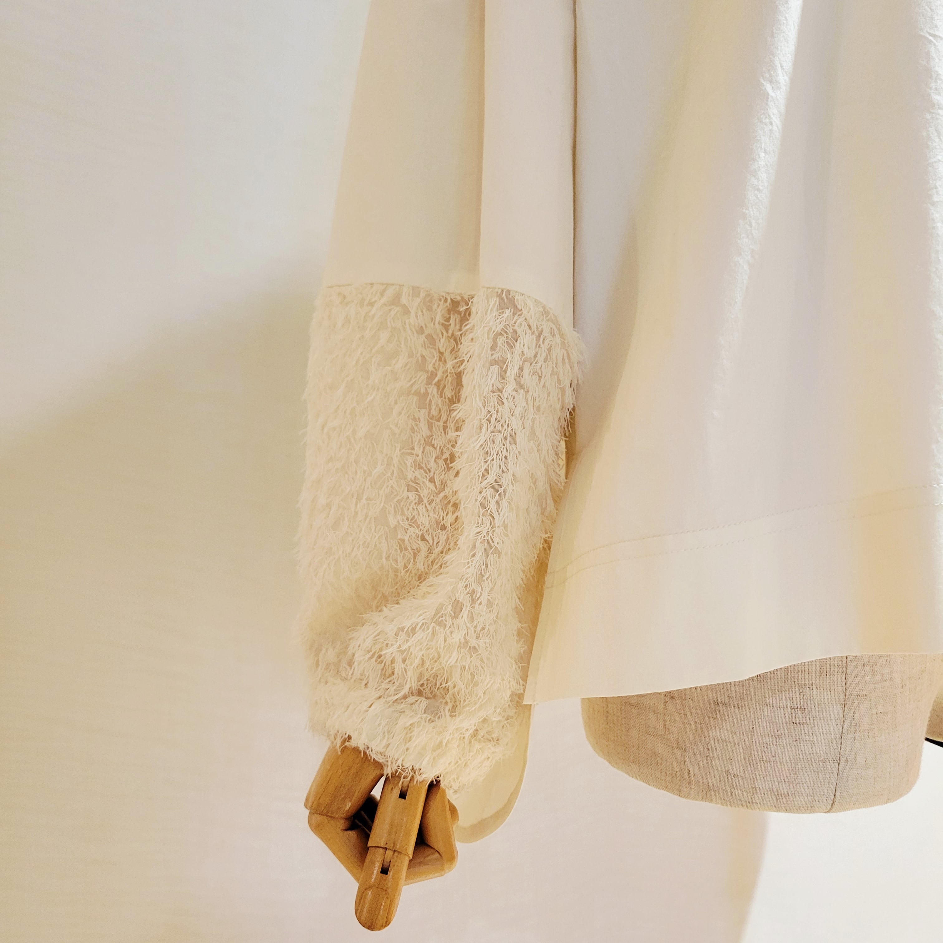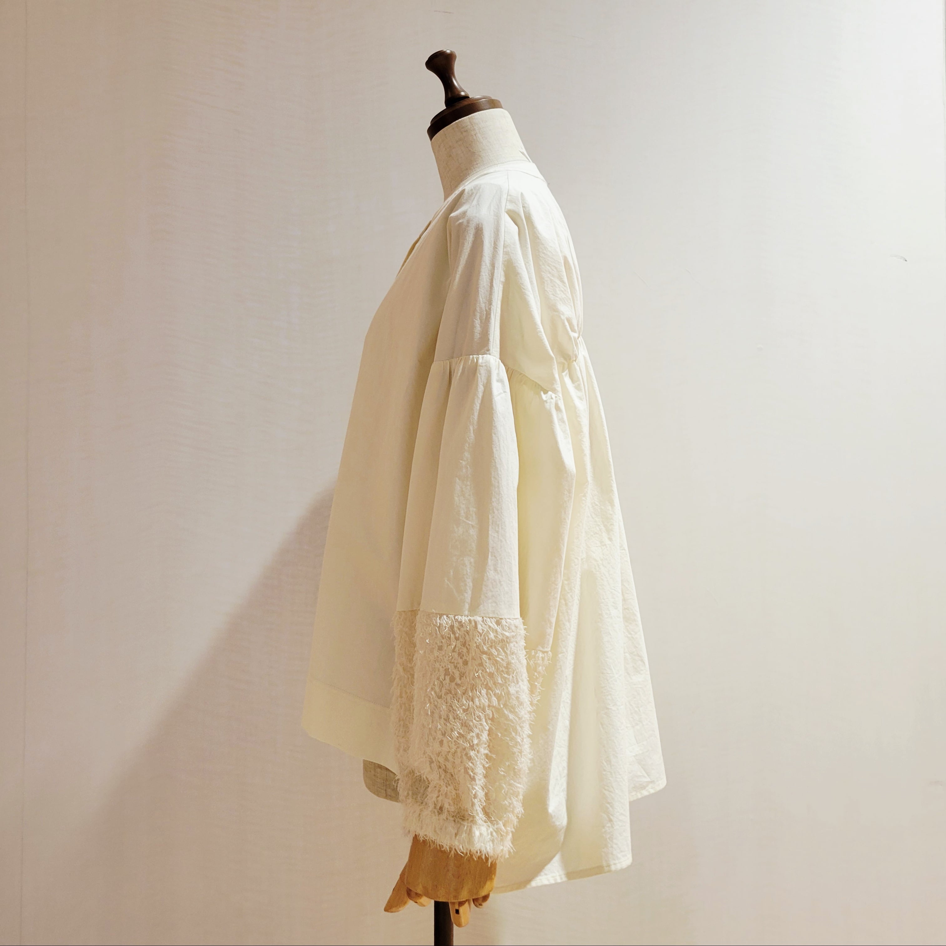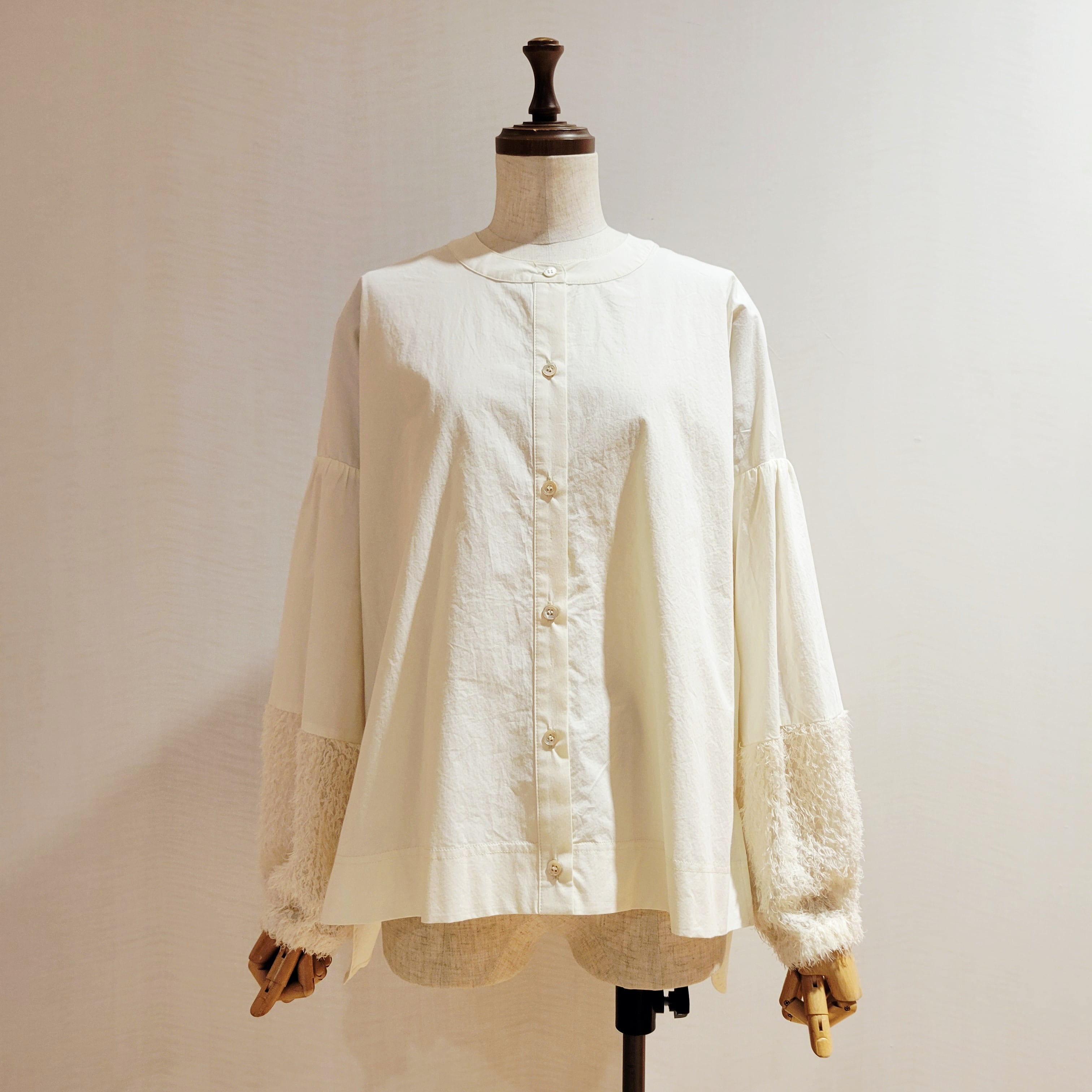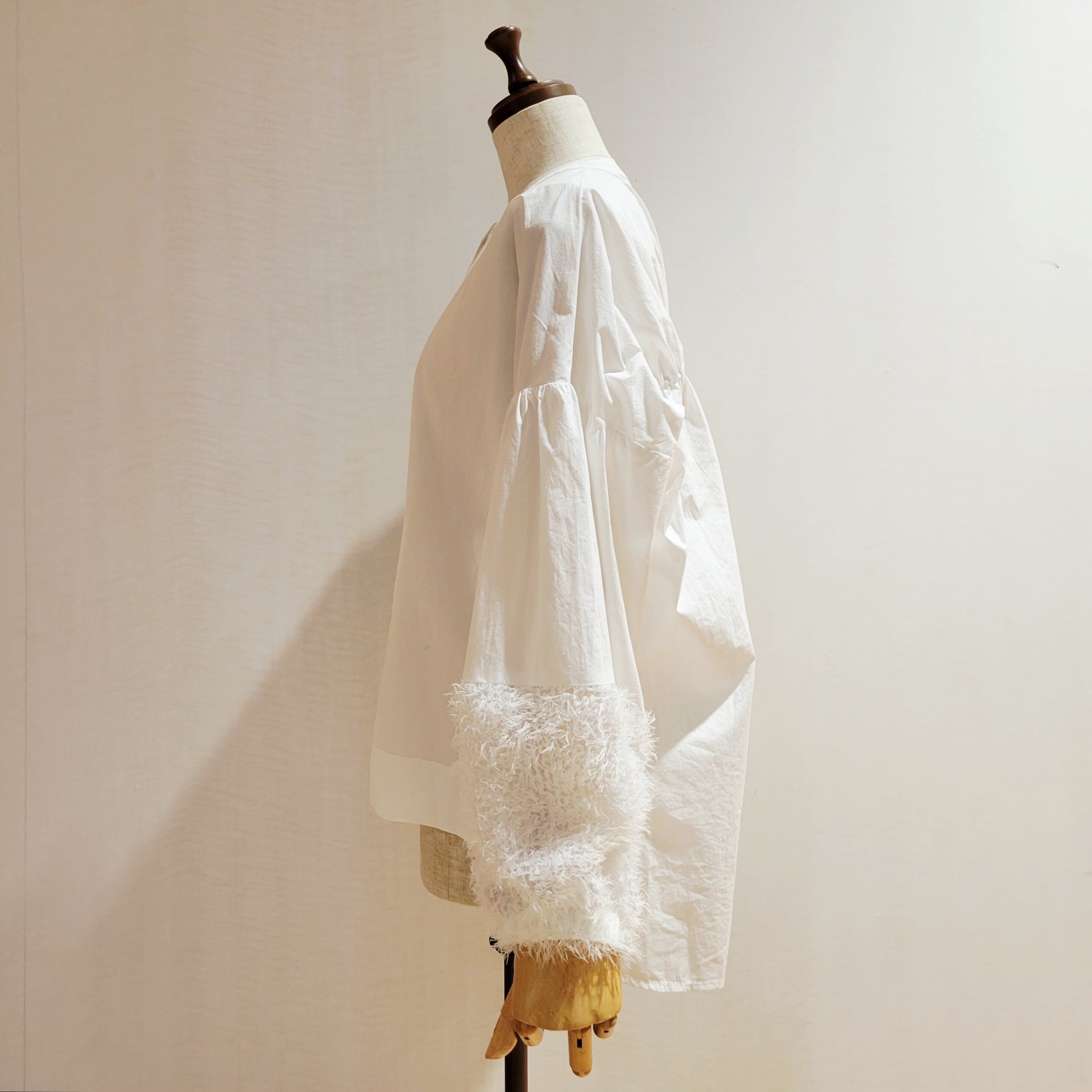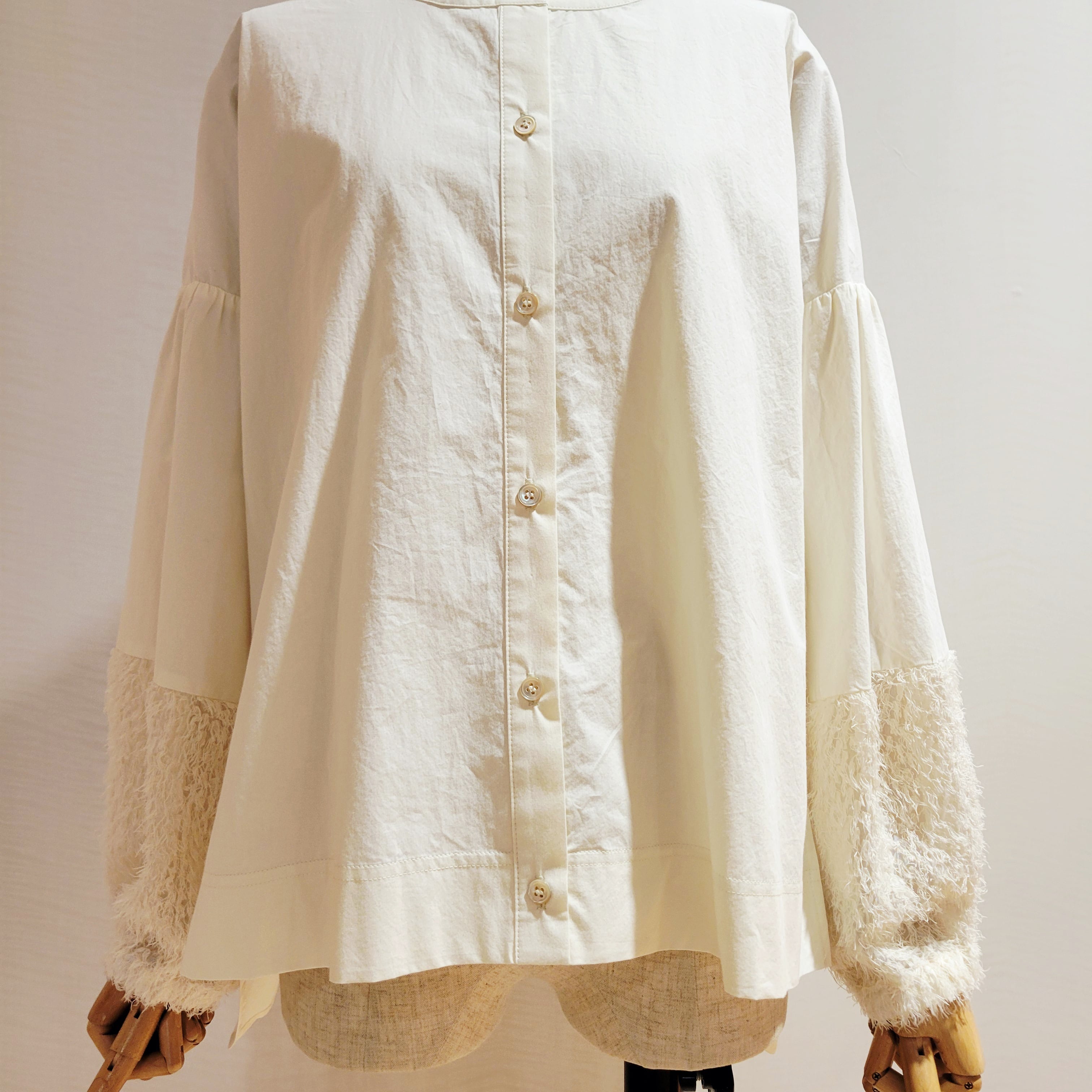 袖口をフェザーで切替がかわいいシャツブラウスです。