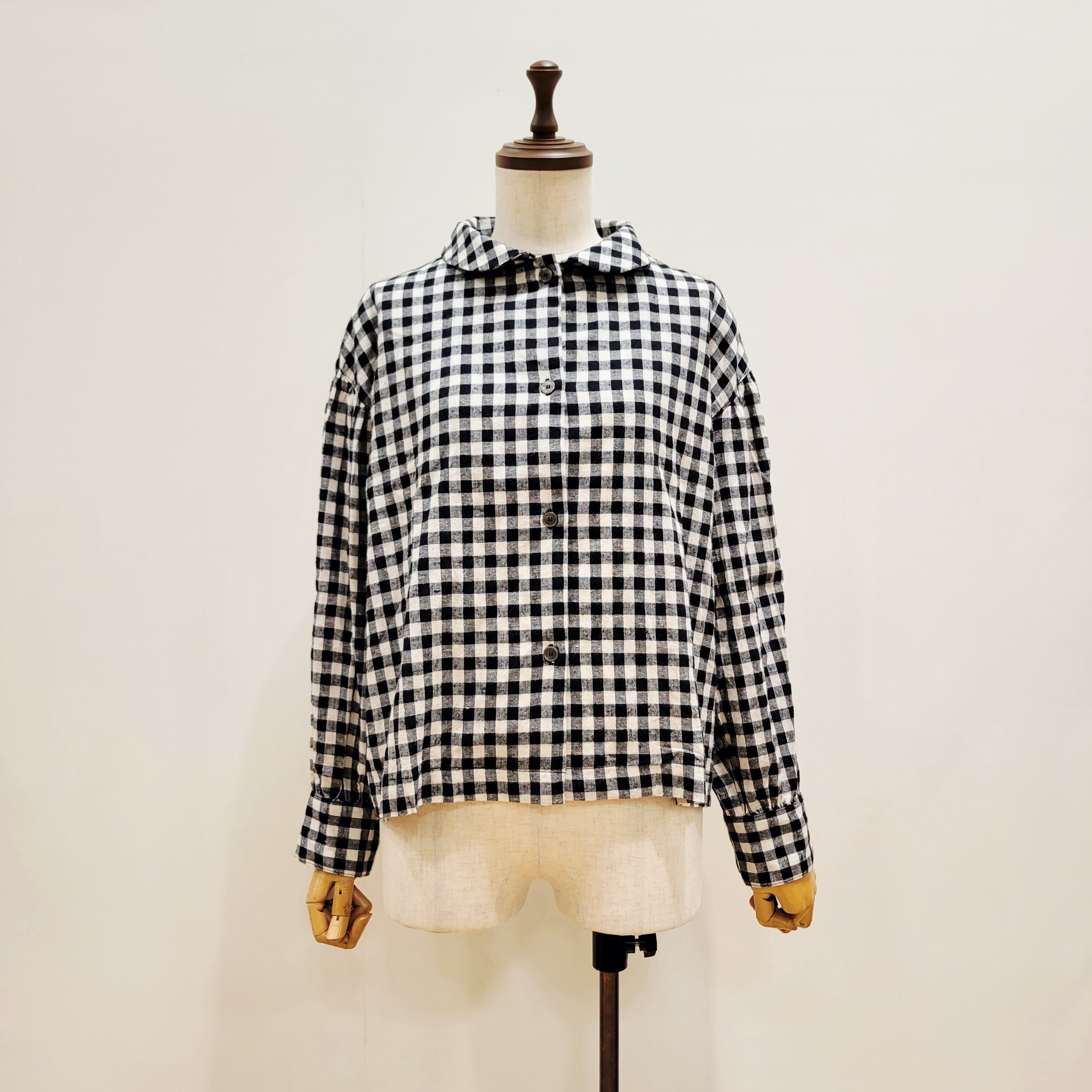 丸襟がやさしい印象を添え、柄物でも落ち着いたスタイリングに仕上がります。