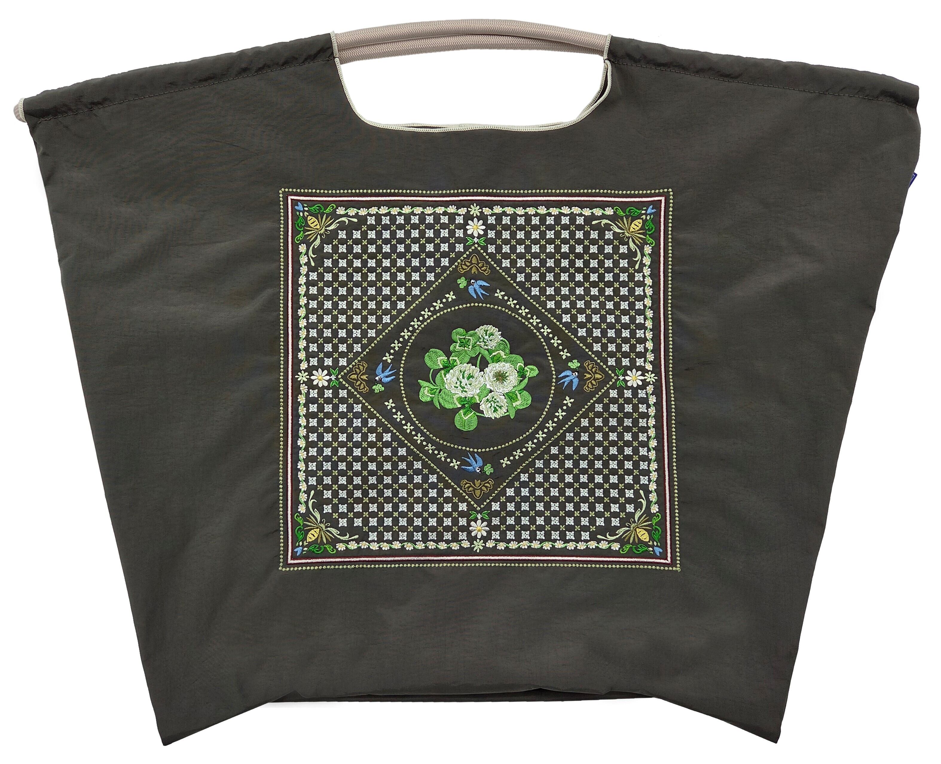 耐久性、撥水性に優れた厚手のポリエステル素材に、 グラフィックデザインをそのまま「刺繍」で施すことで、 高級感がありデザイン性の高いバッグとなっています。