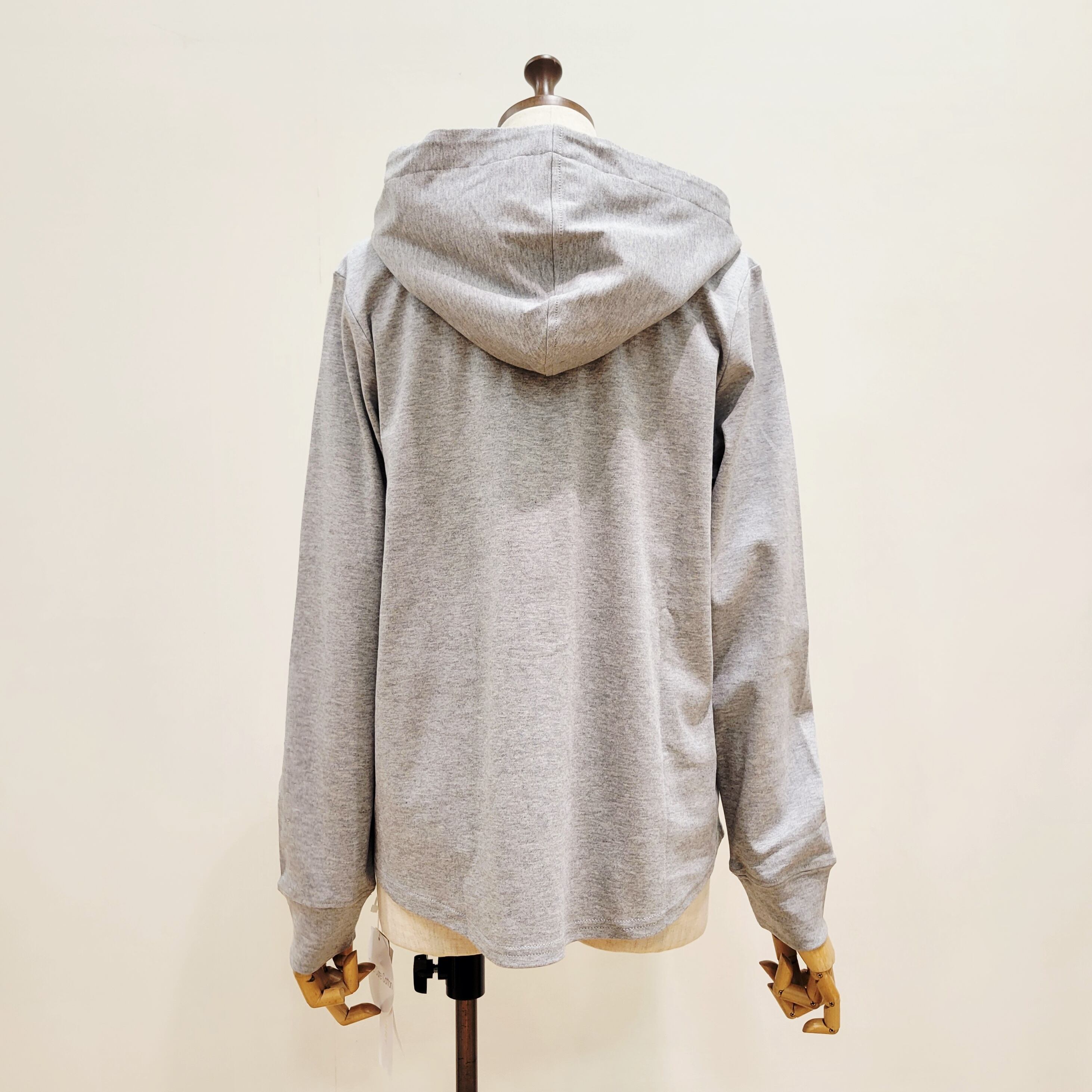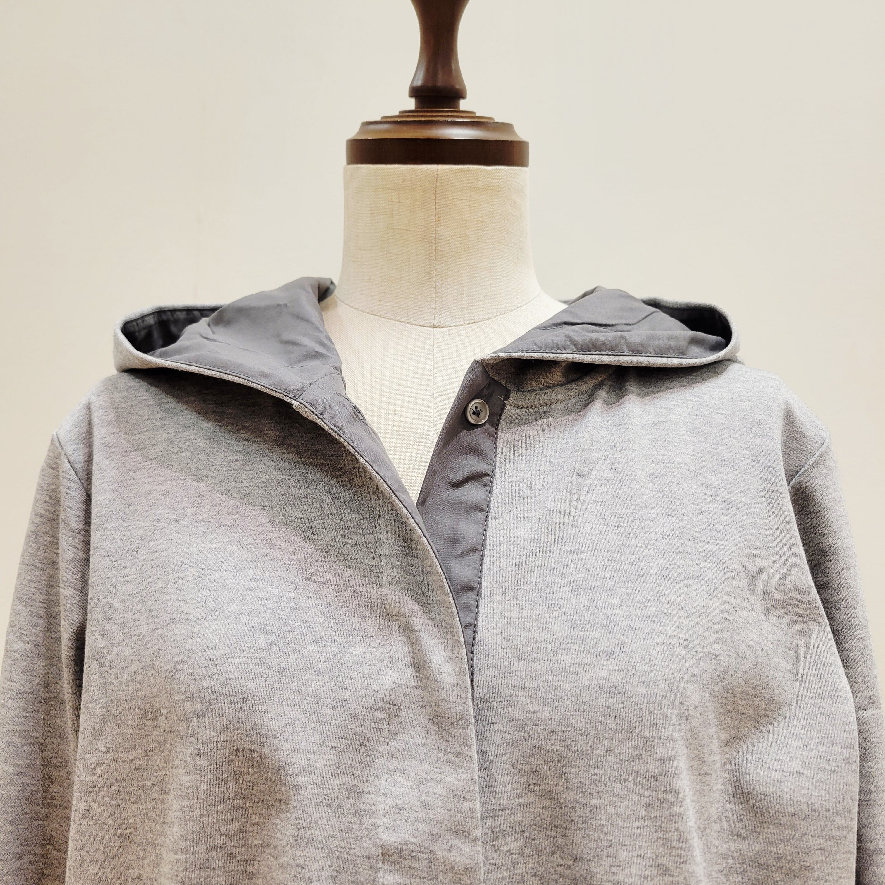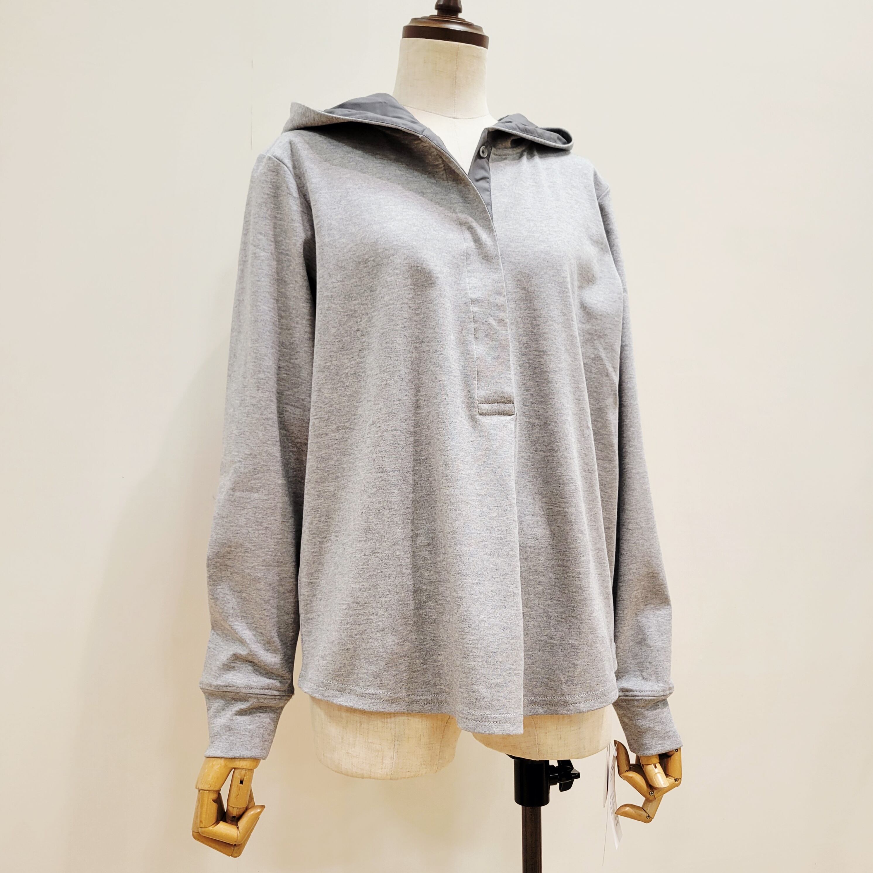フード裏とボタンラインをを布帛素材に切り替えたフーディープルオーバー。