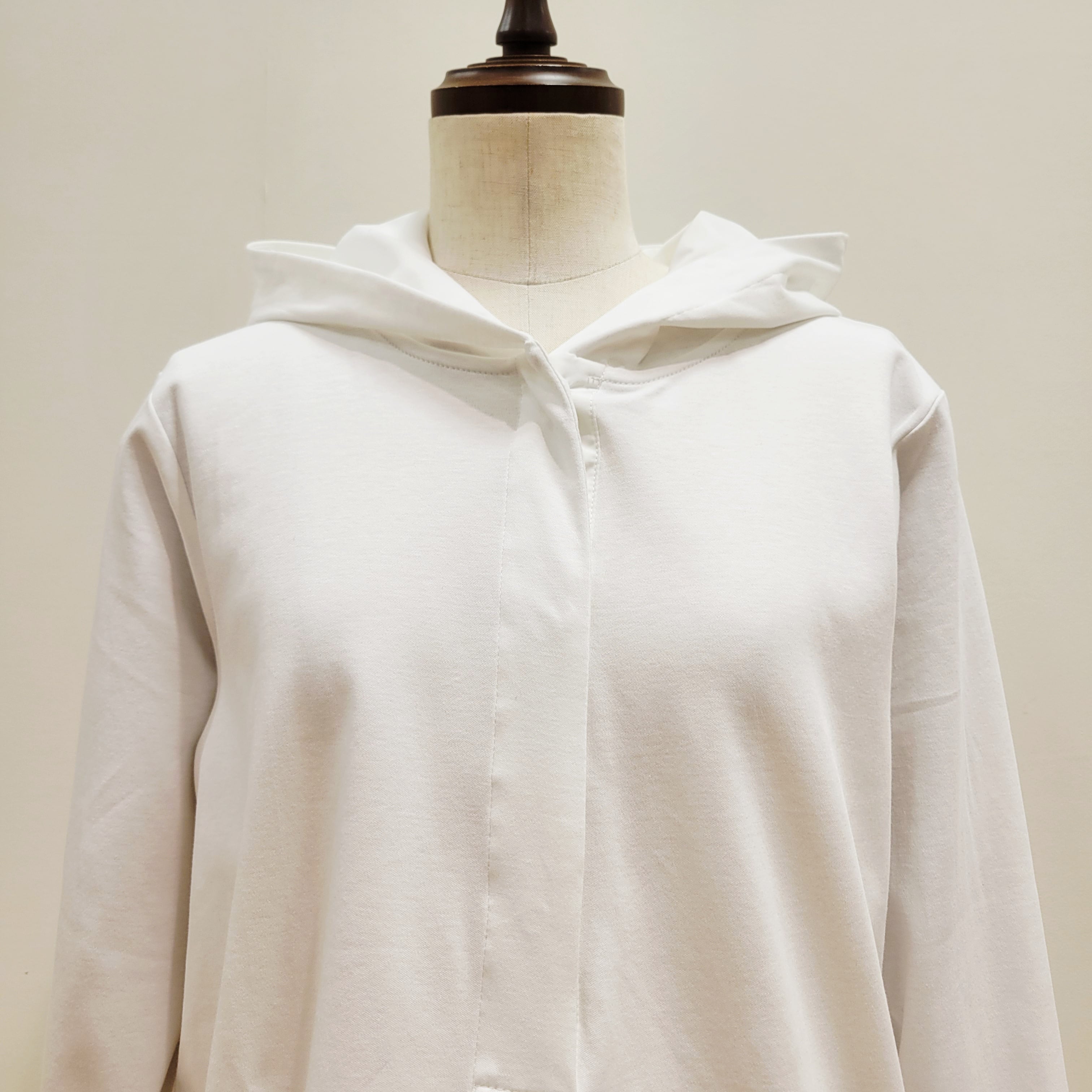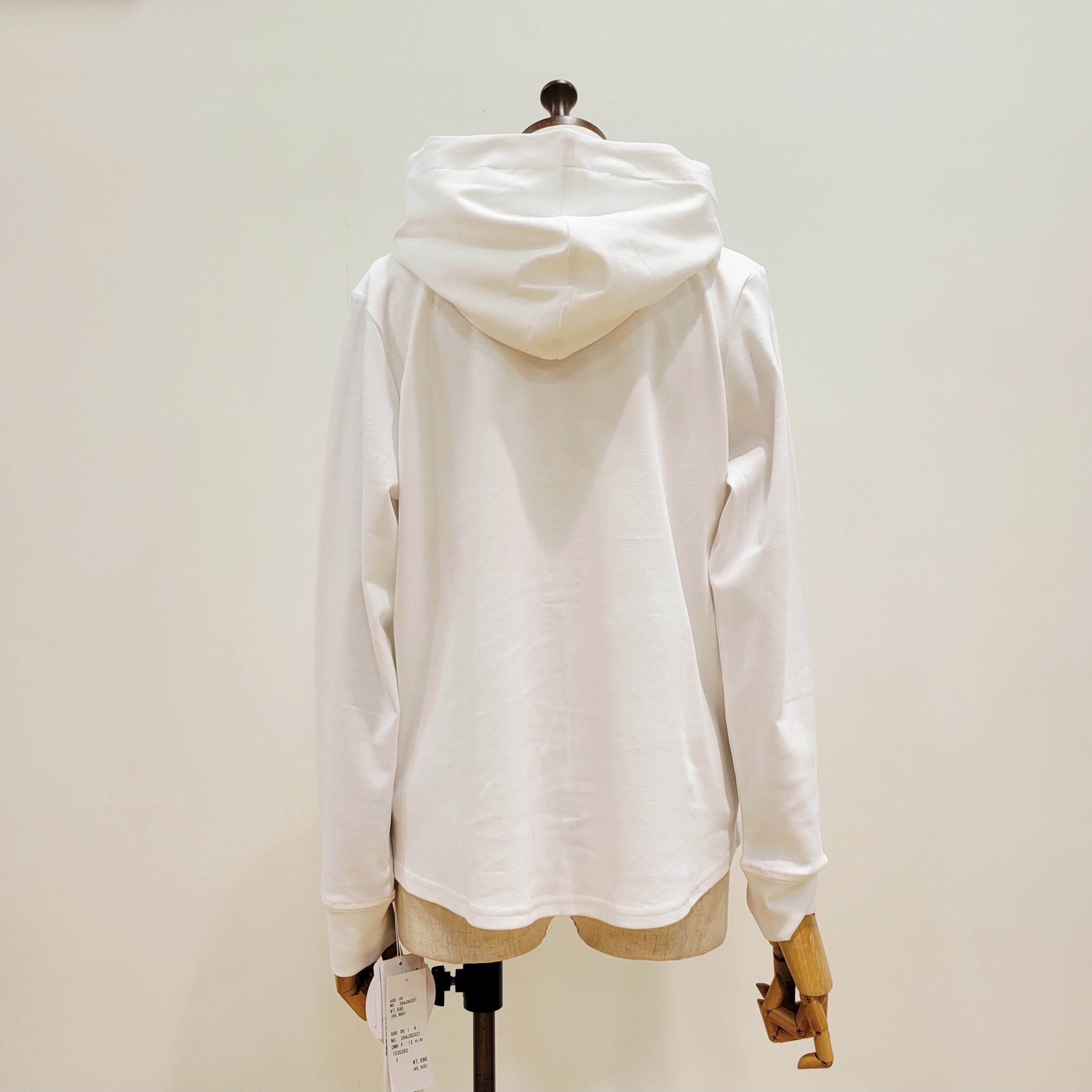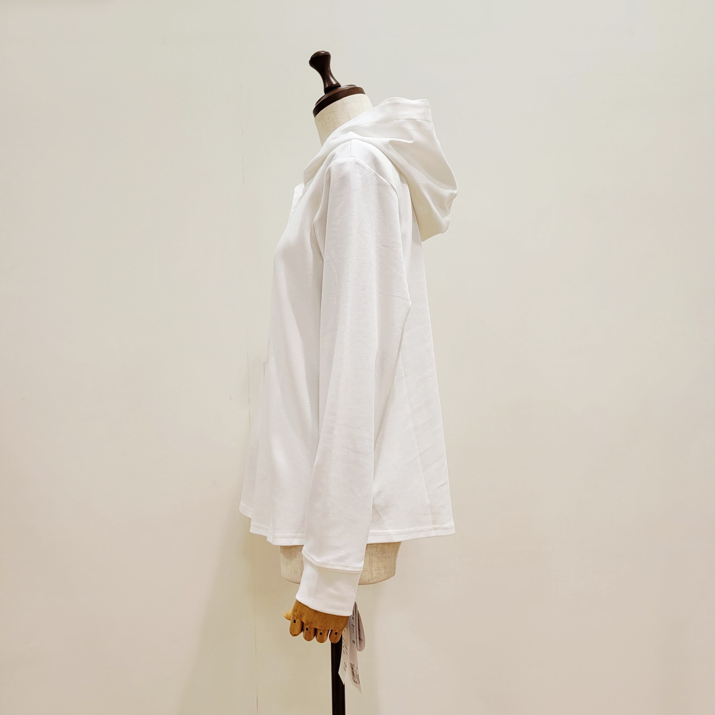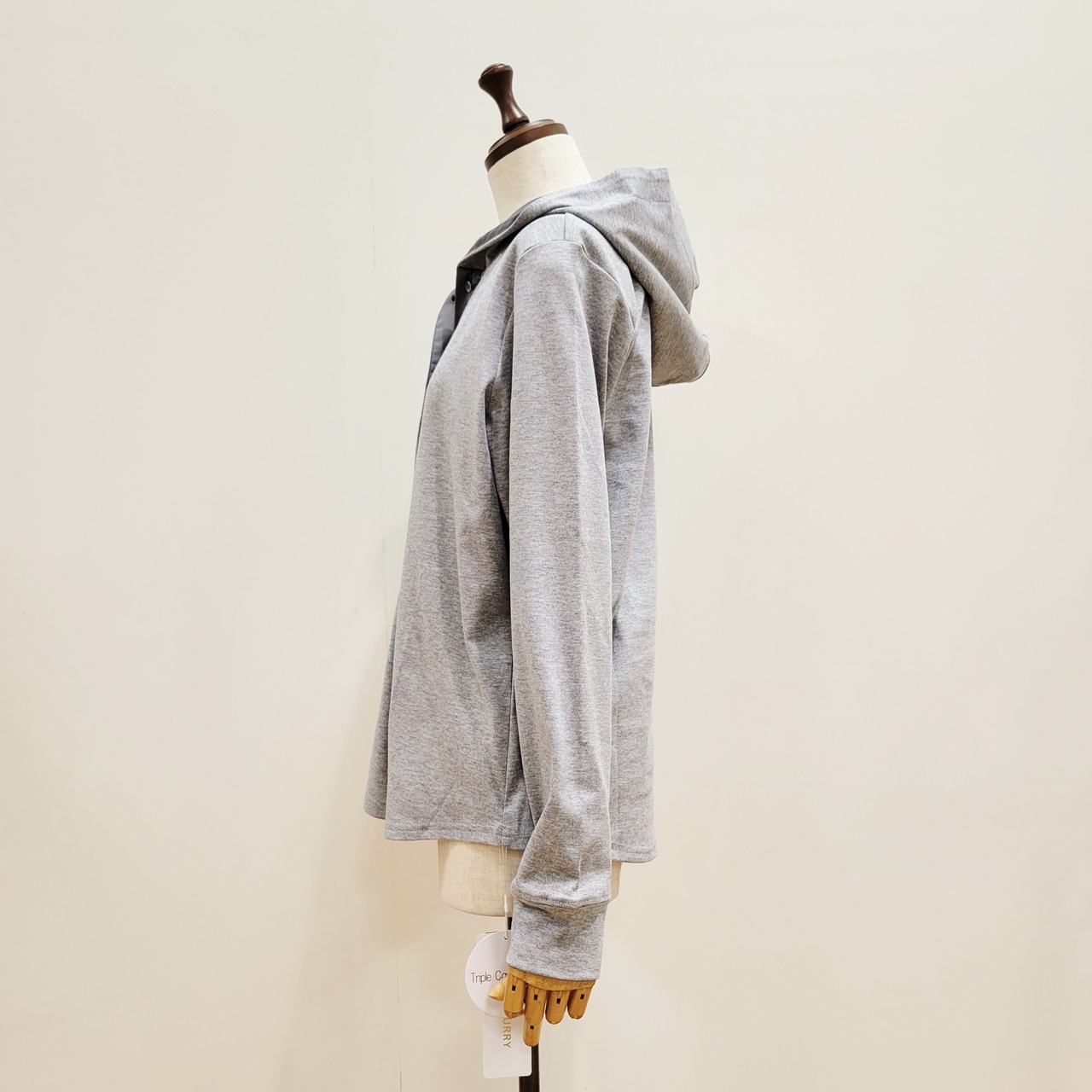 フード裏とボタンラインをを布帛素材に切り替えたフーディープルオーバー。