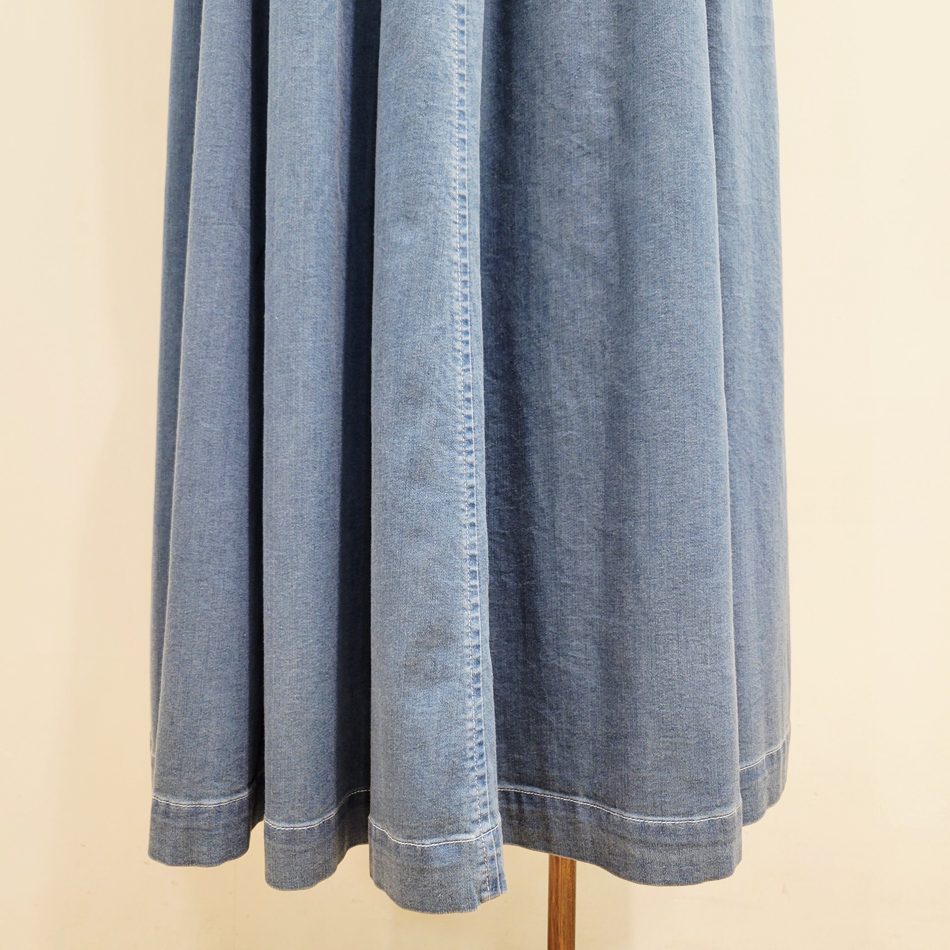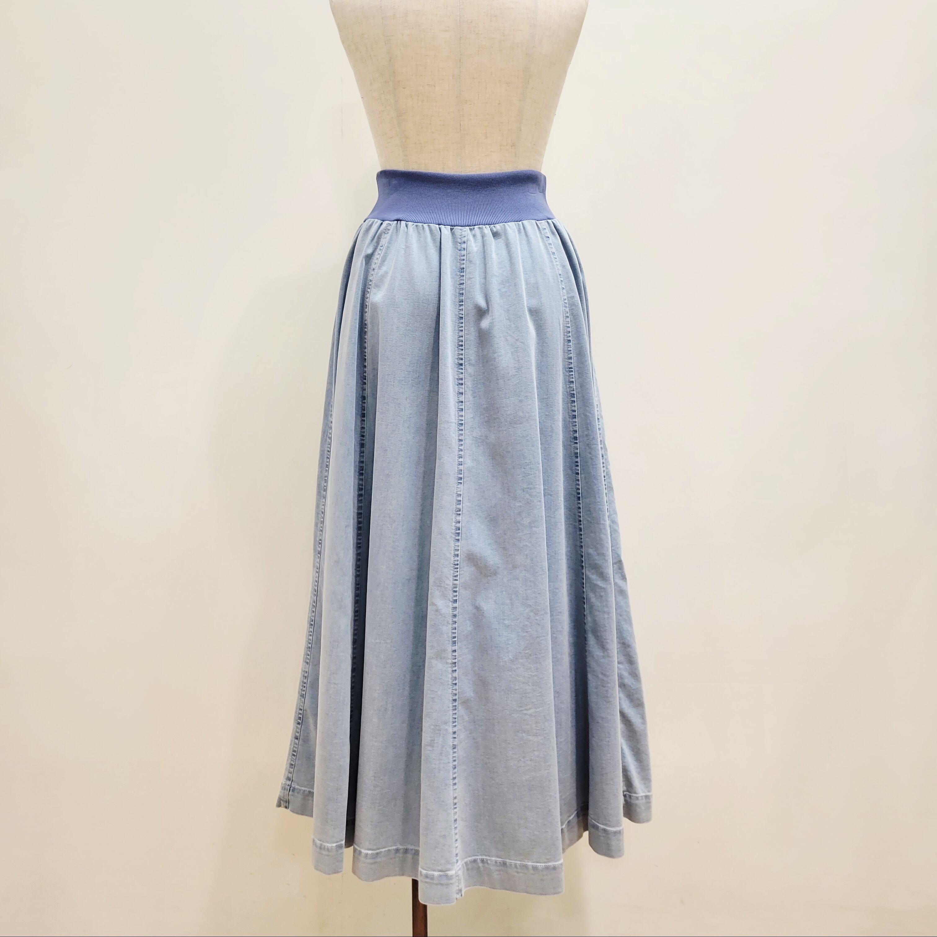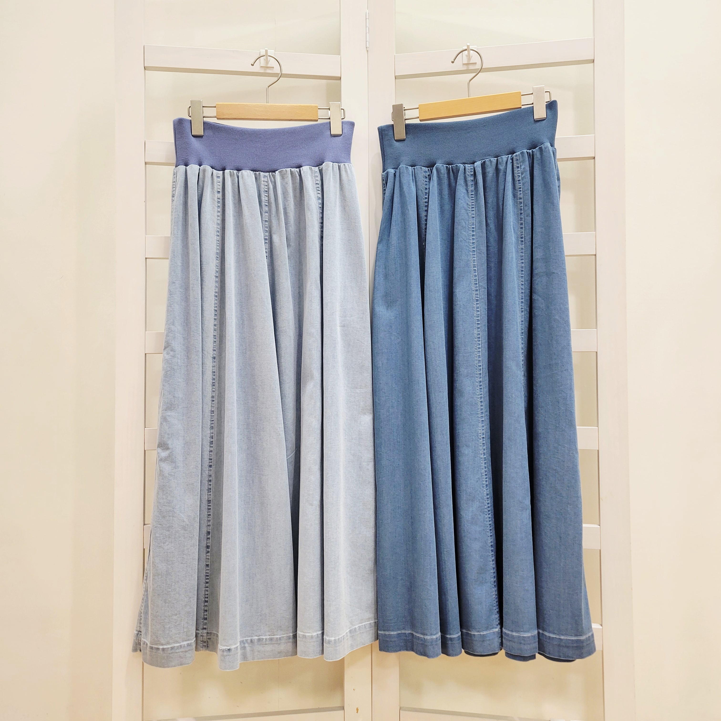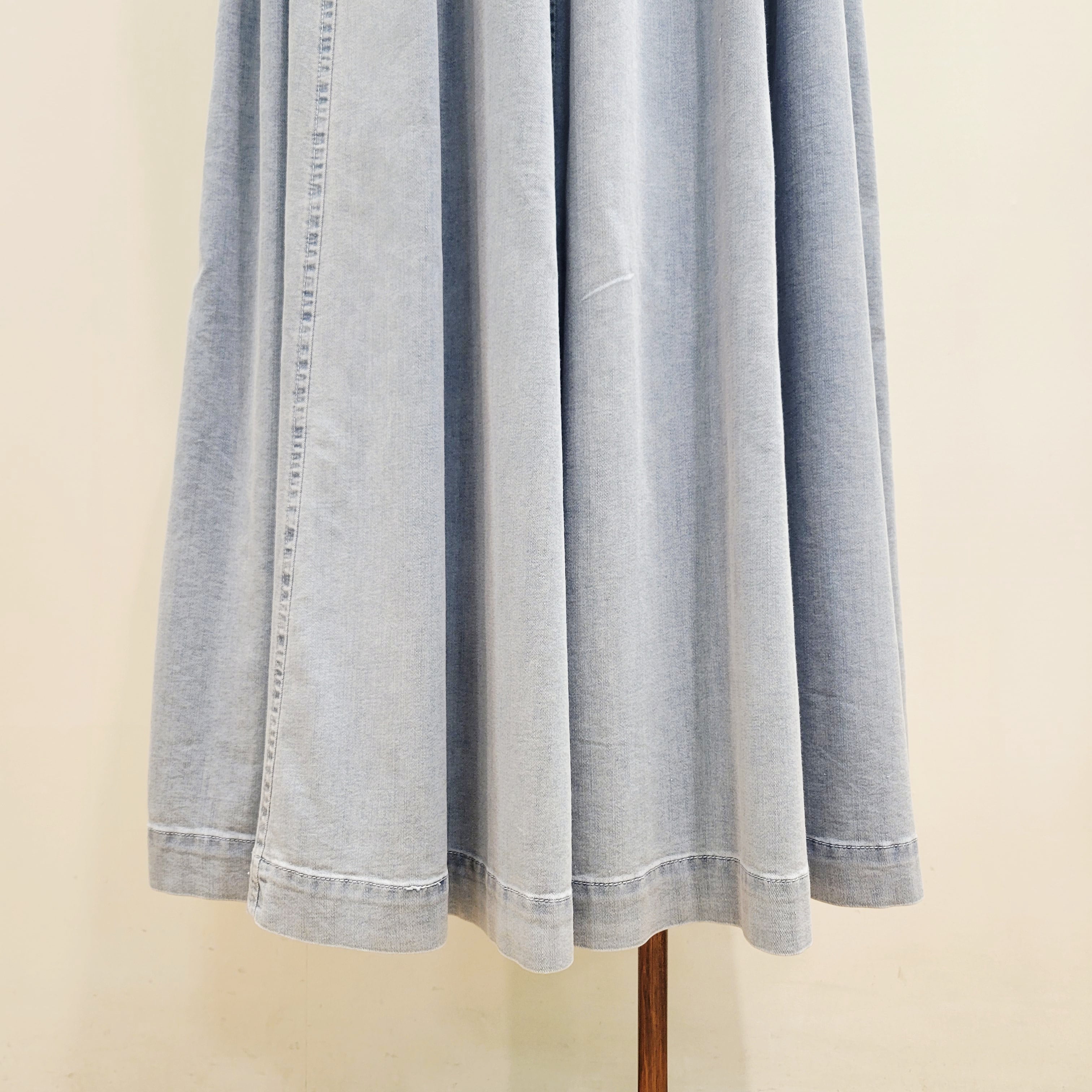 見た目も柔らかなデニム生地と程よいボリューム感のフレアシルエットで、カジュアルかつ上品な印象に。キレイめにもカジュアルにも合わせられるコーディネートしやすい一枚です。