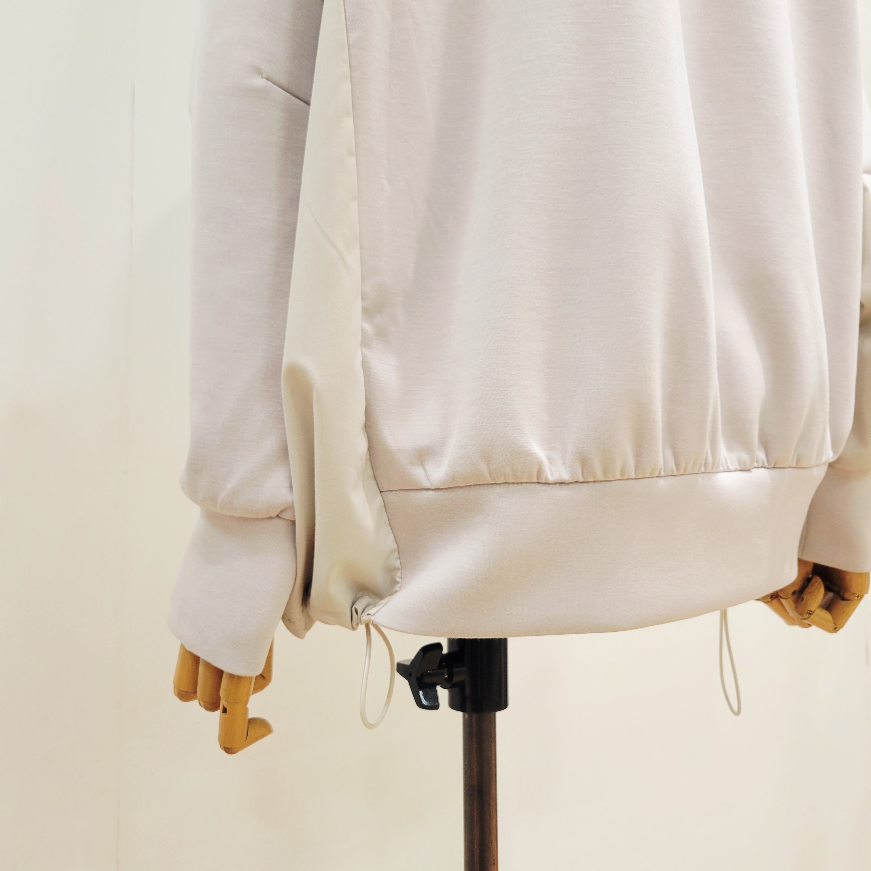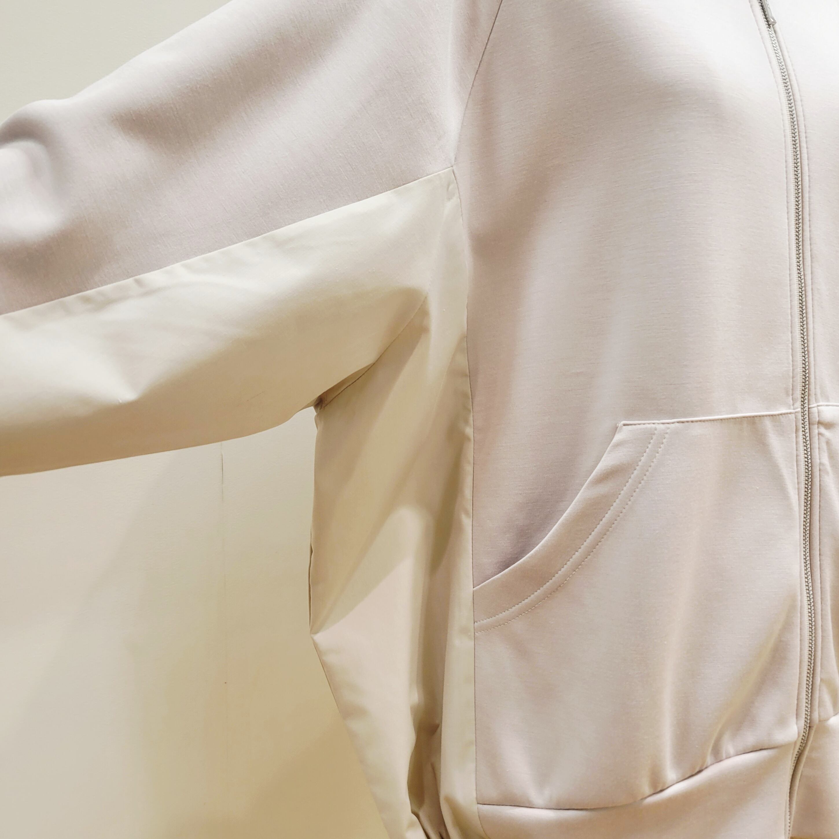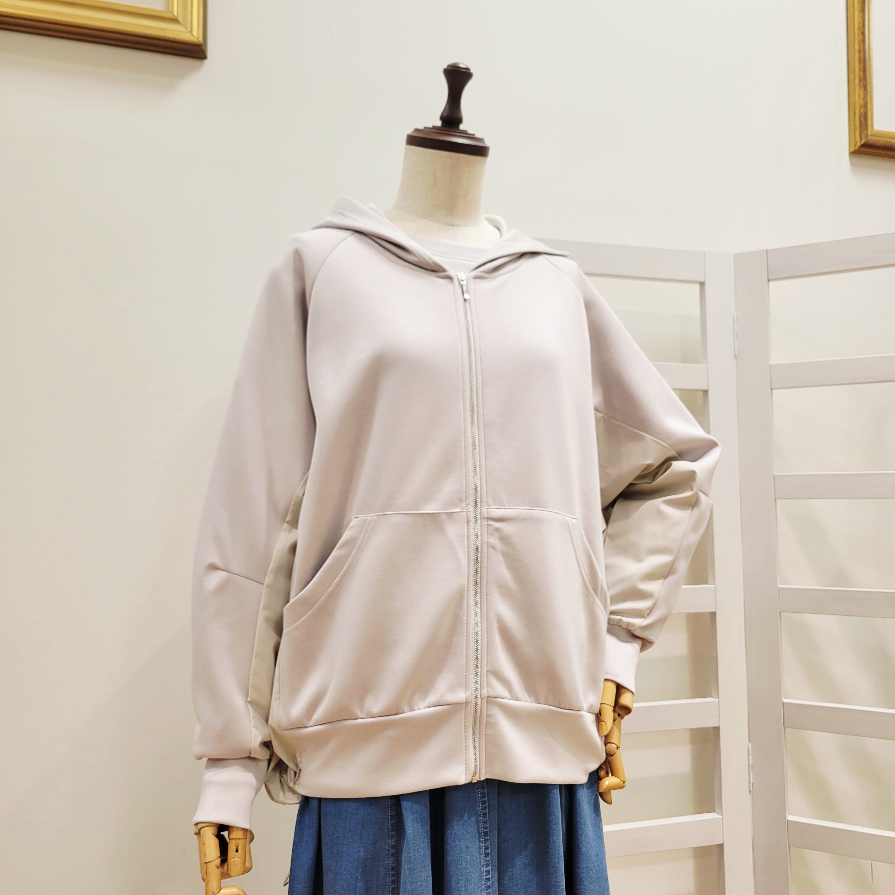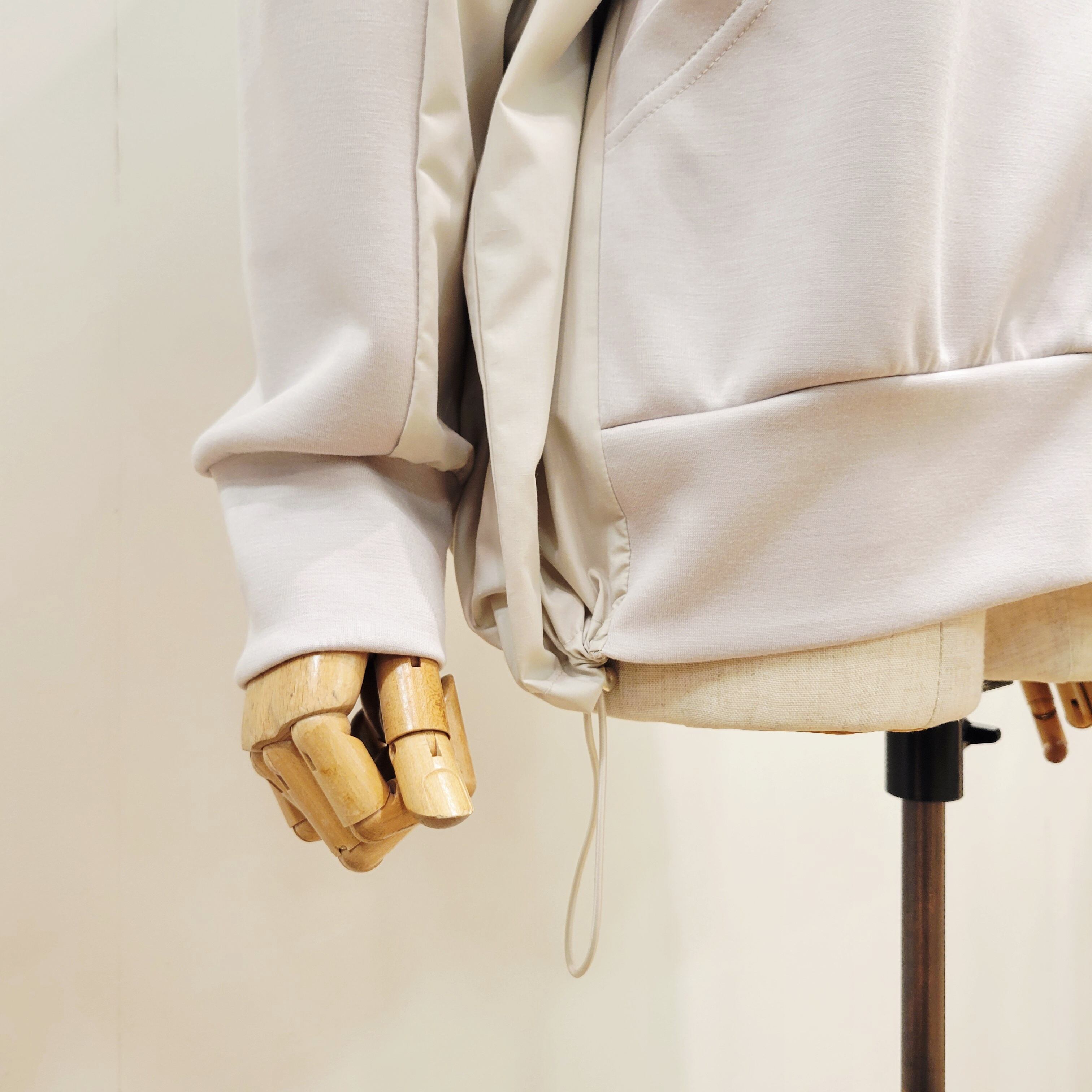 袖の内側から脇にかけて布帛との切替デザインによって、ボリュームが出ずにスッキリとした印象に。肩まわりはゆったり、シルエットはスッキリとした着心地です。