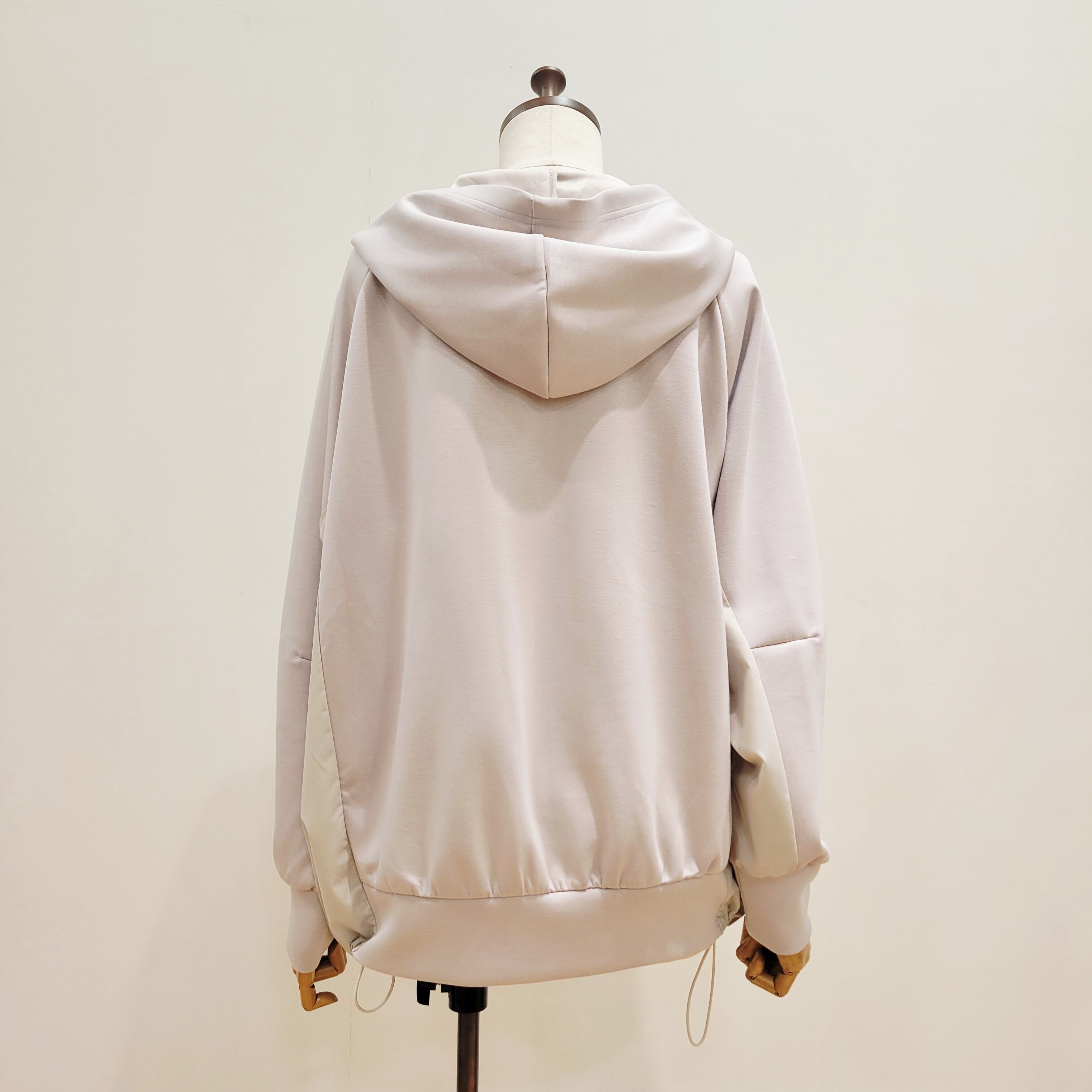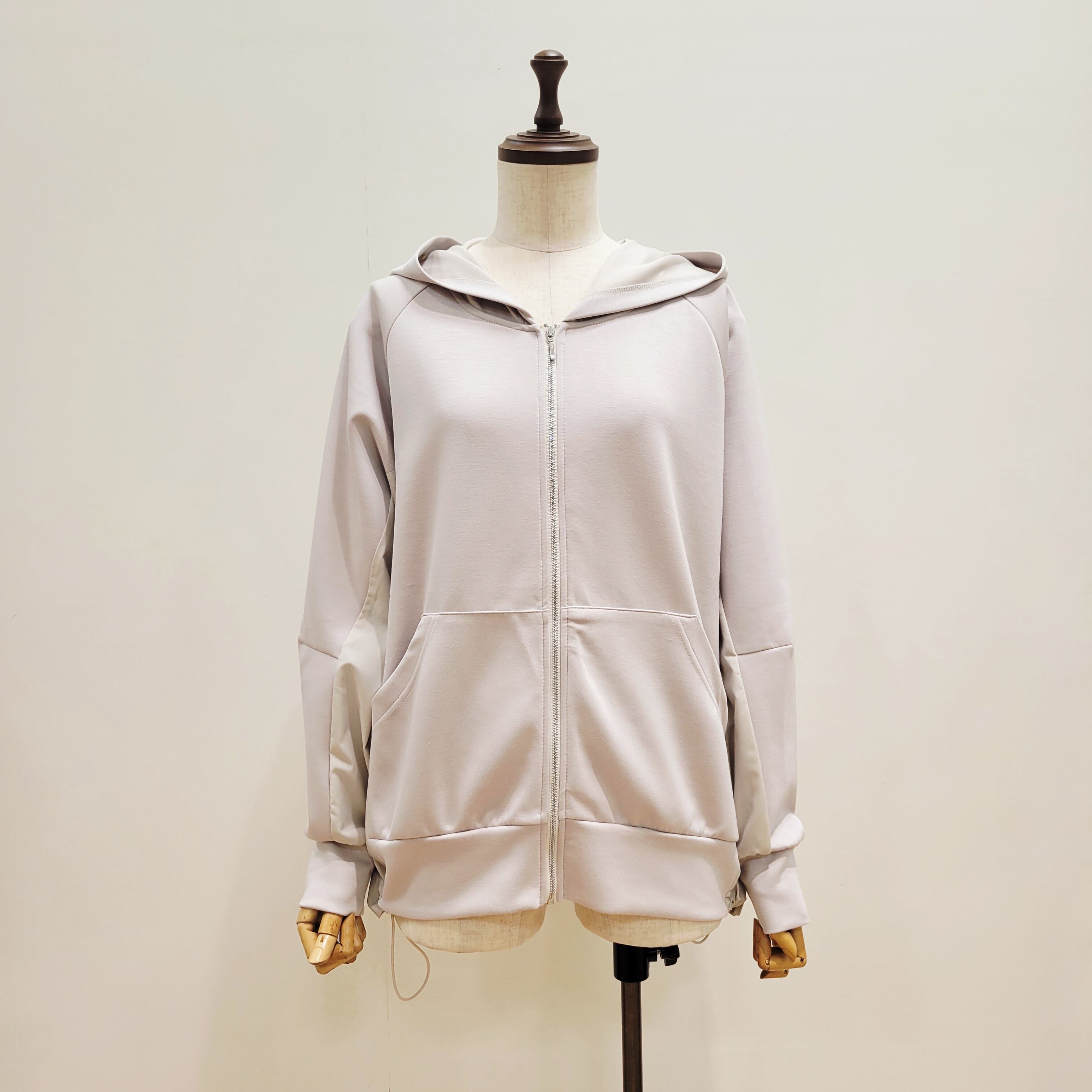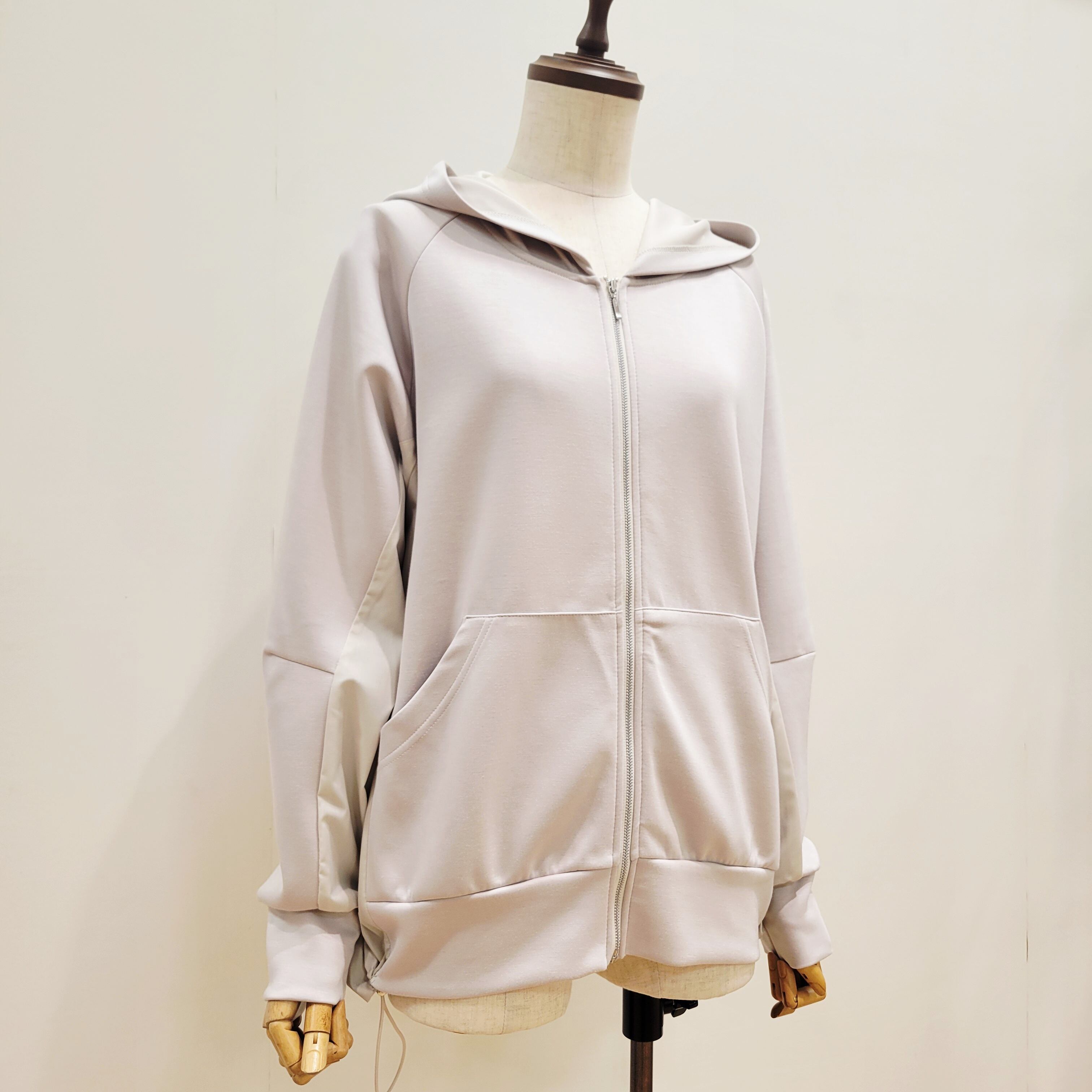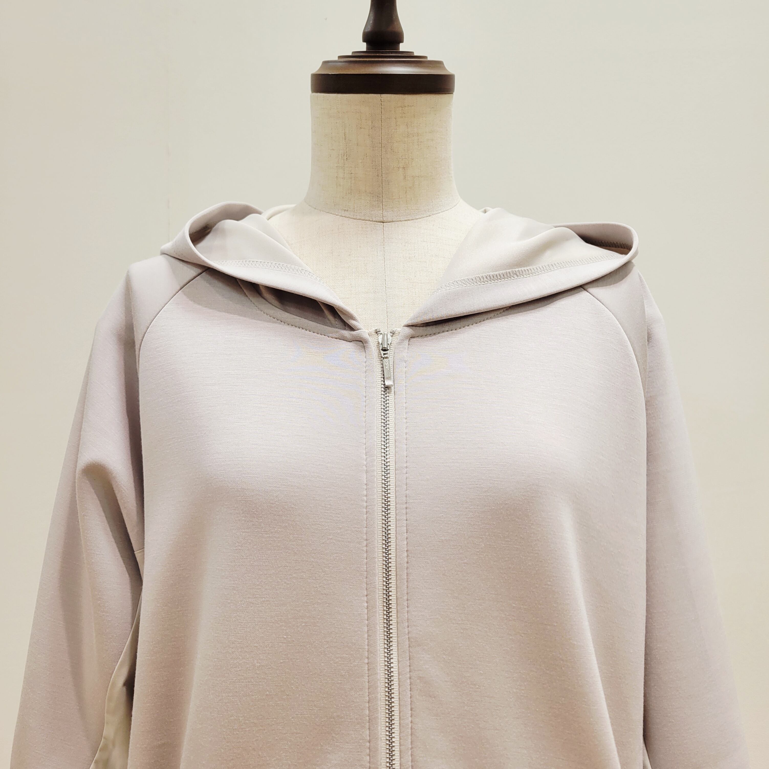 袖の内側から脇にかけて布帛との切替デザインによって、ボリュームが出ずにスッキリとした印象に。肩まわりはゆったり、シルエットはスッキリとした着心地です。