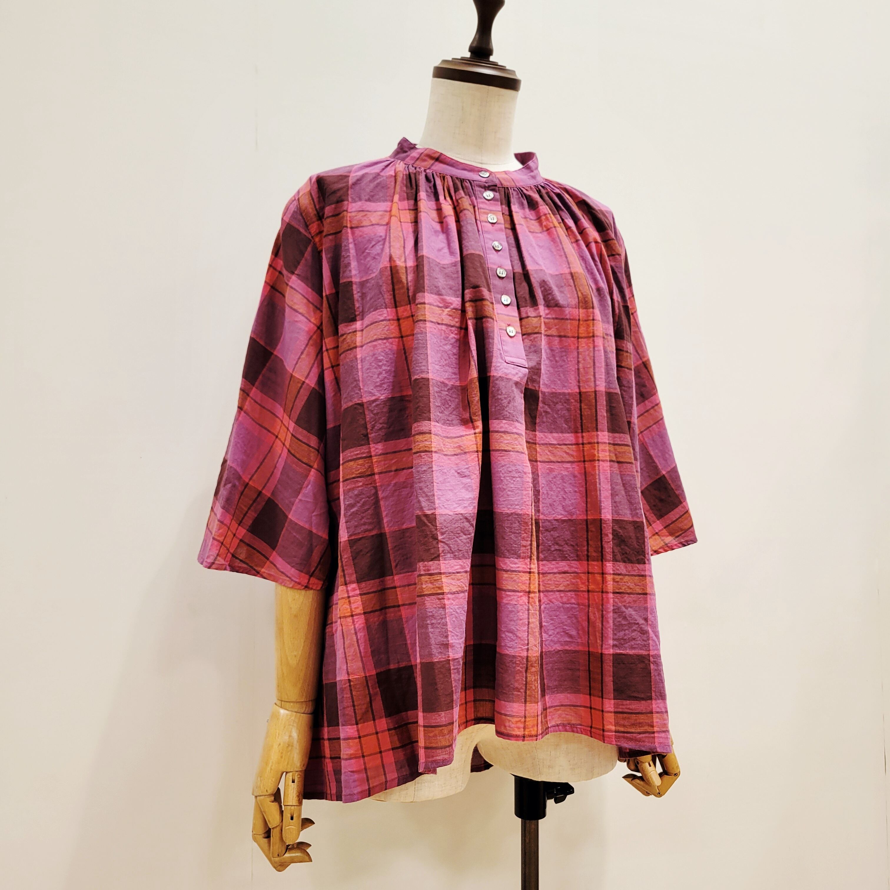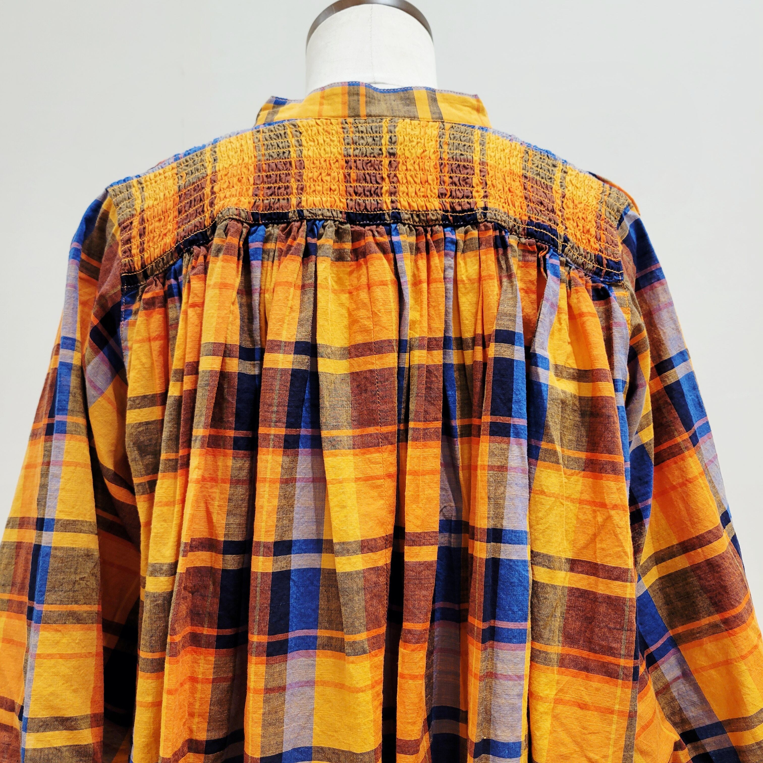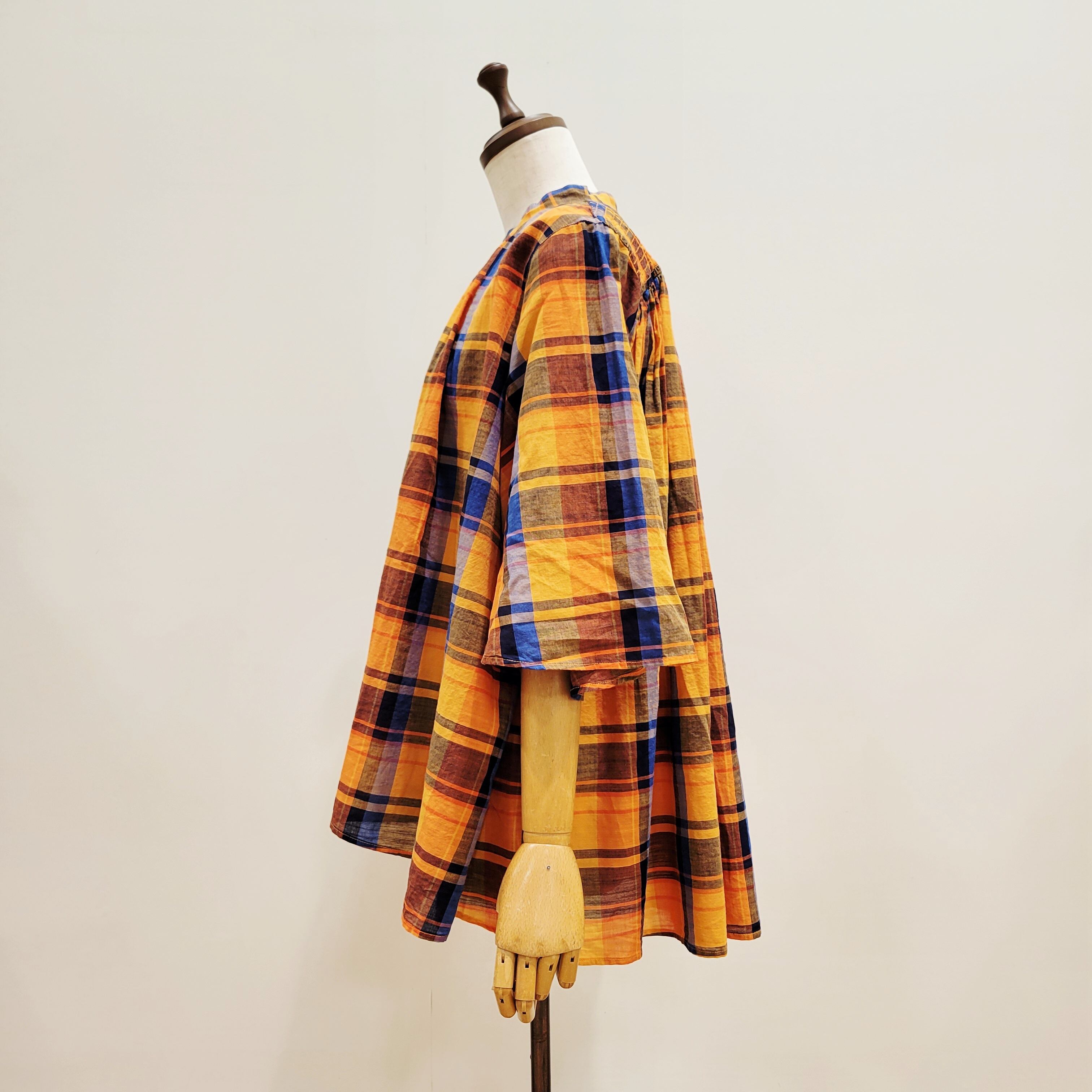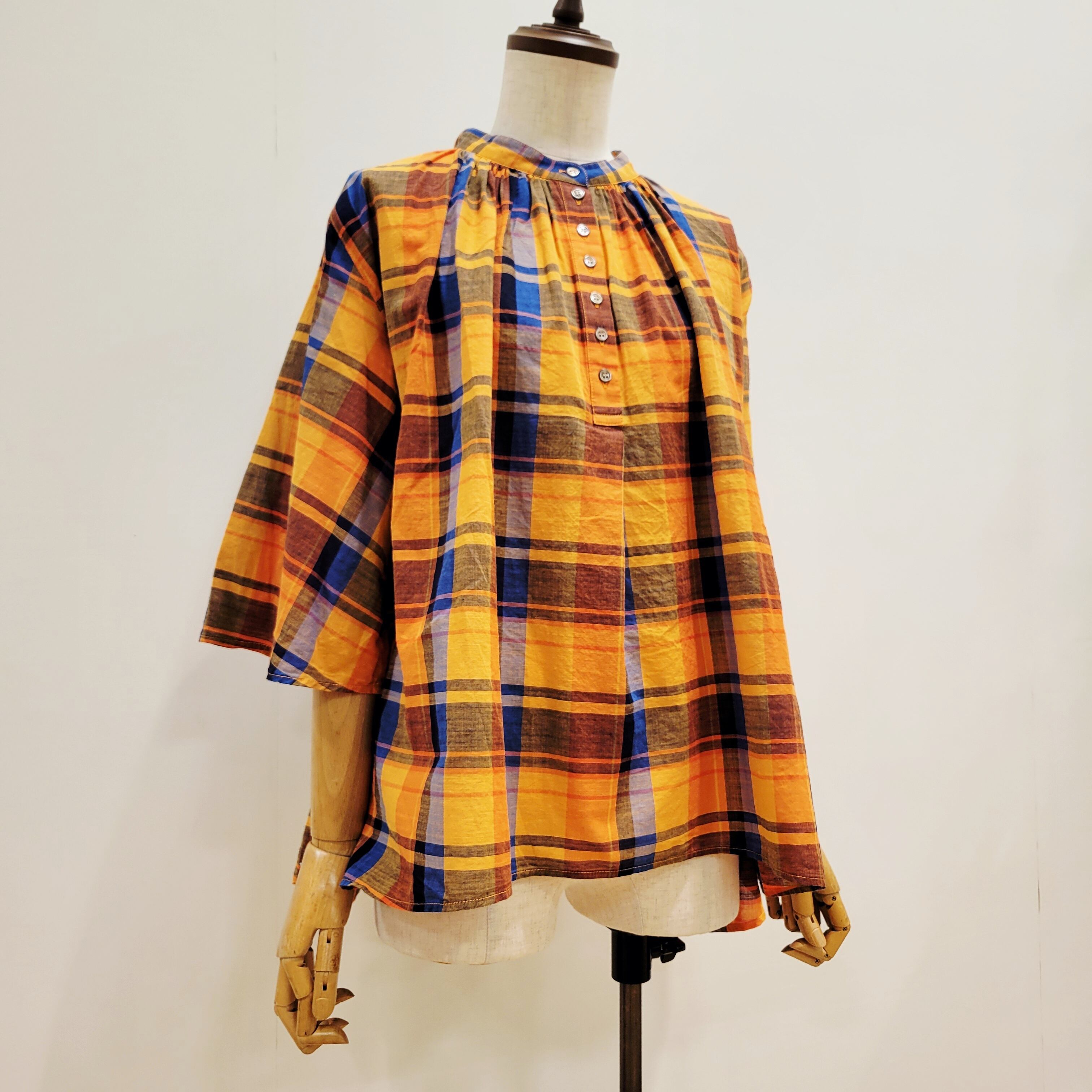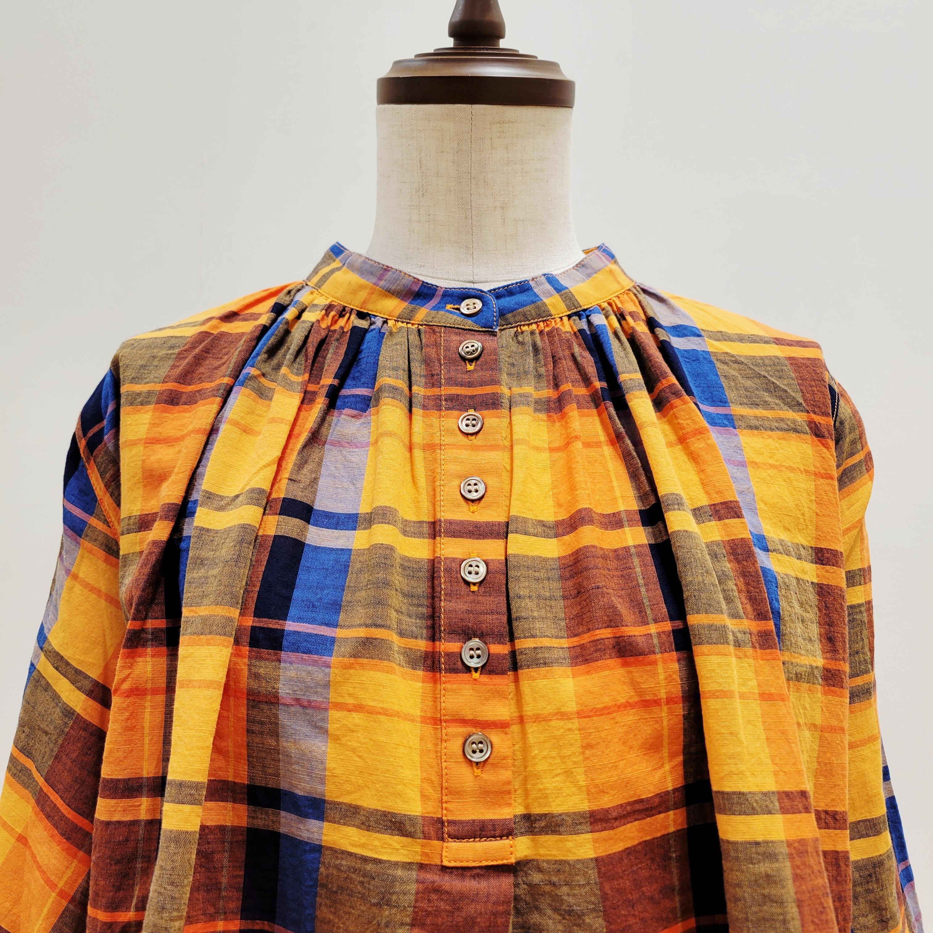 あたたかみのあるオレンジをベースにした、やさしい雰囲気のチェック柄ブラウス。首元に寄せたギャザーが、ふんわりとした立体感のある表情を添えています。ほどよい存在感がありながら、コーディネートに自然と馴染む一枚。バンドカラーですっきりと着られ、パンツにもスカートにも合わせやすいデザインです。