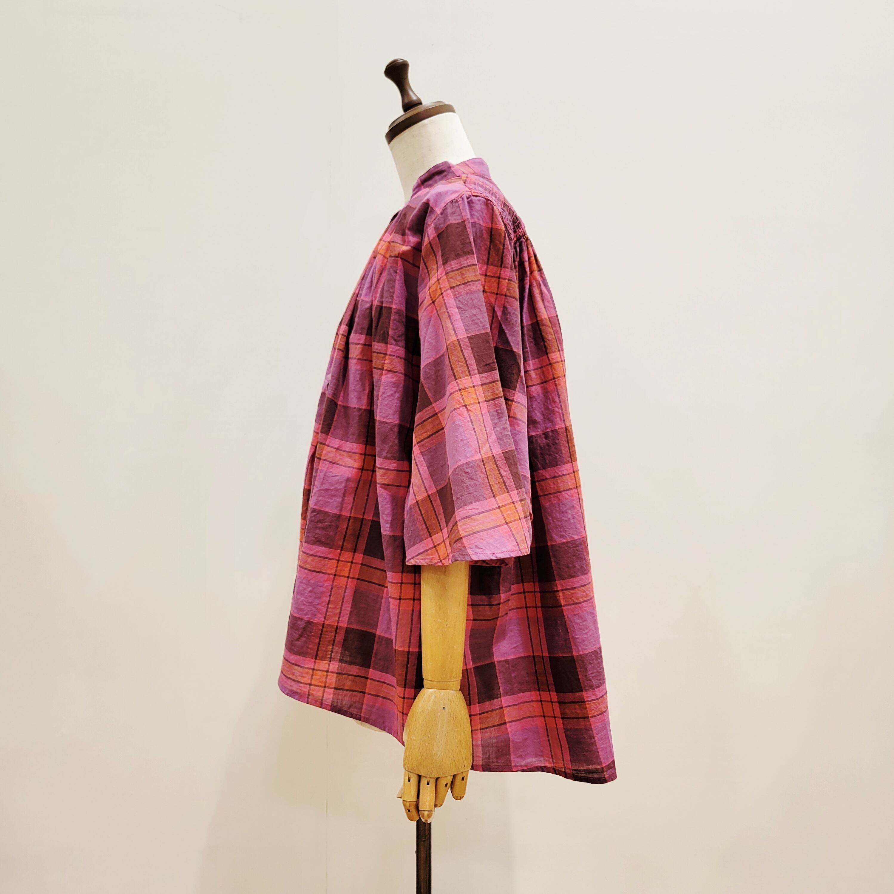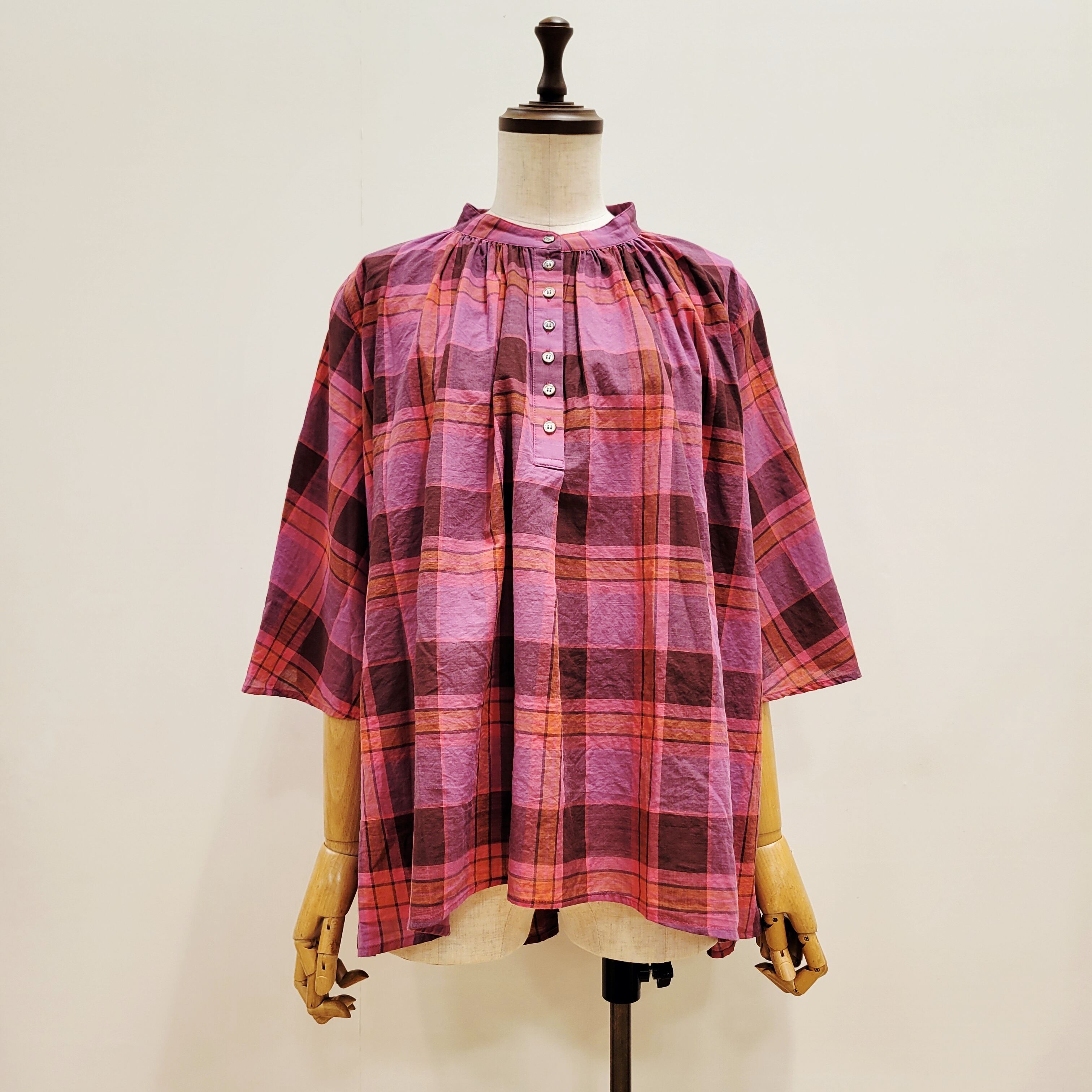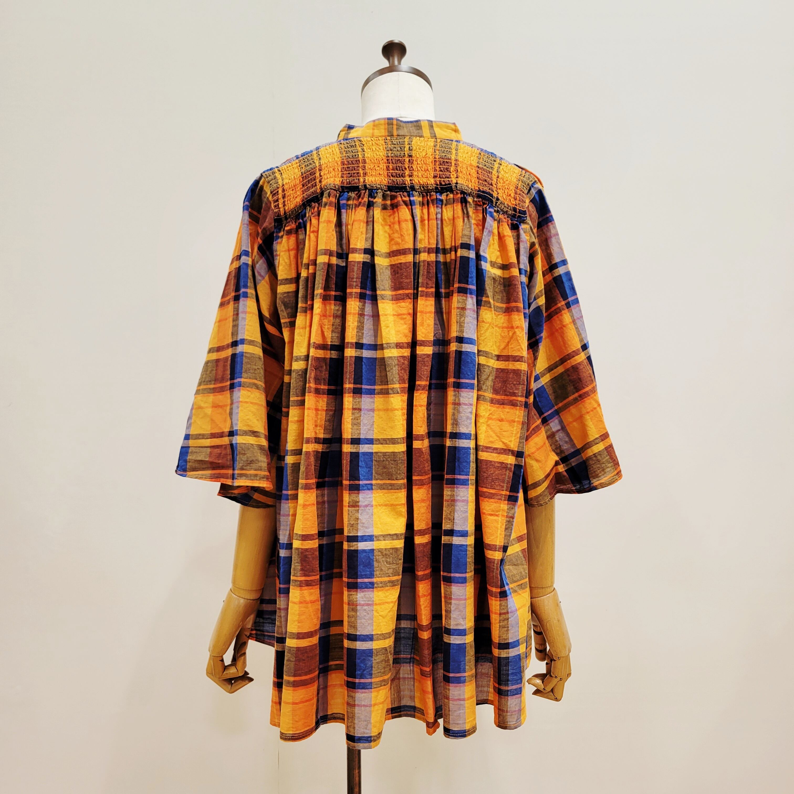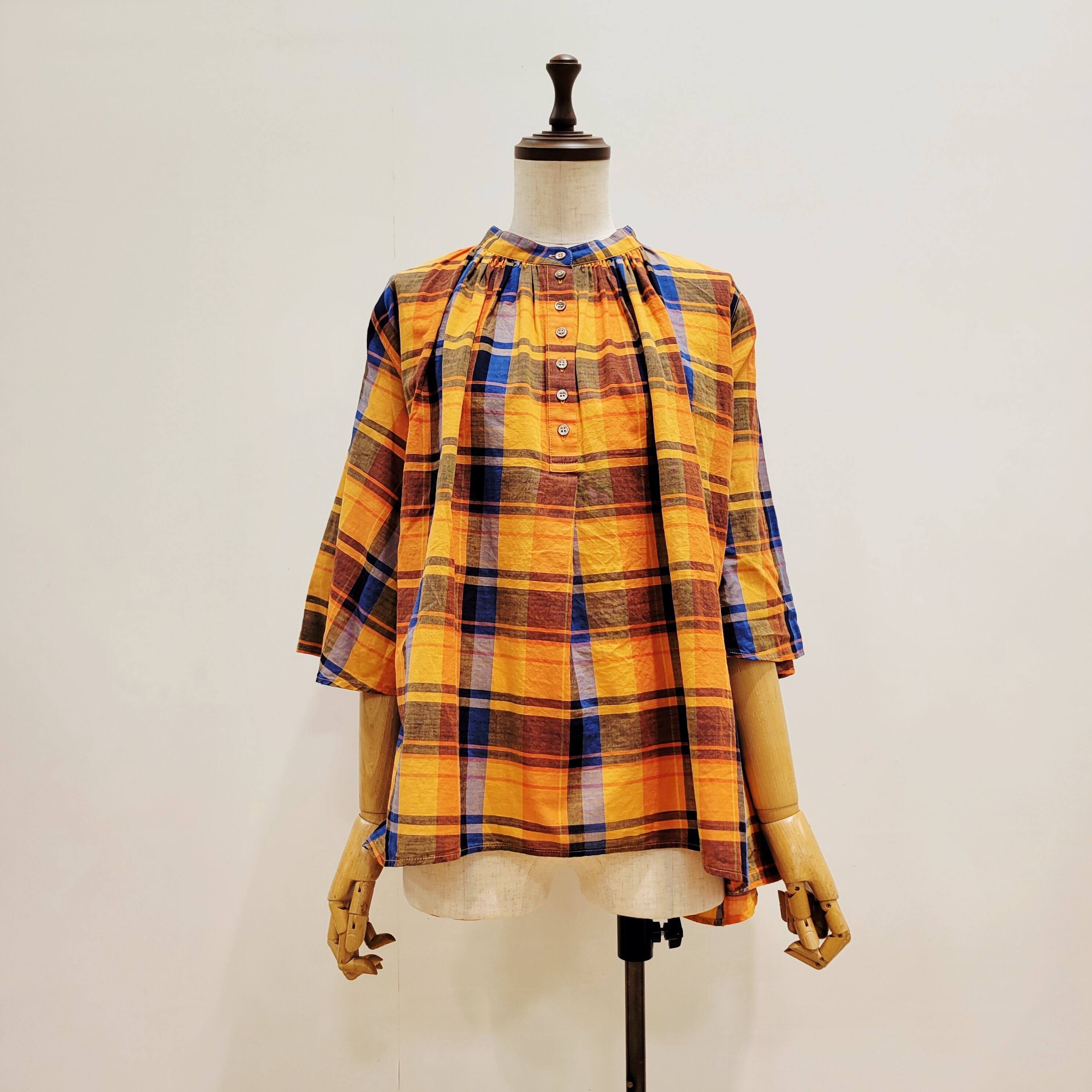 あたたかみのあるオレンジをベースにした、やさしい雰囲気のチェック柄ブラウス。首元に寄せたギャザーが、ふんわりとした立体感のある表情を添えています。ほどよい存在感がありながら、コーディネートに自然と馴染む一枚。バンドカラーですっきりと着られ、パンツにもスカートにも合わせやすいデザインです。