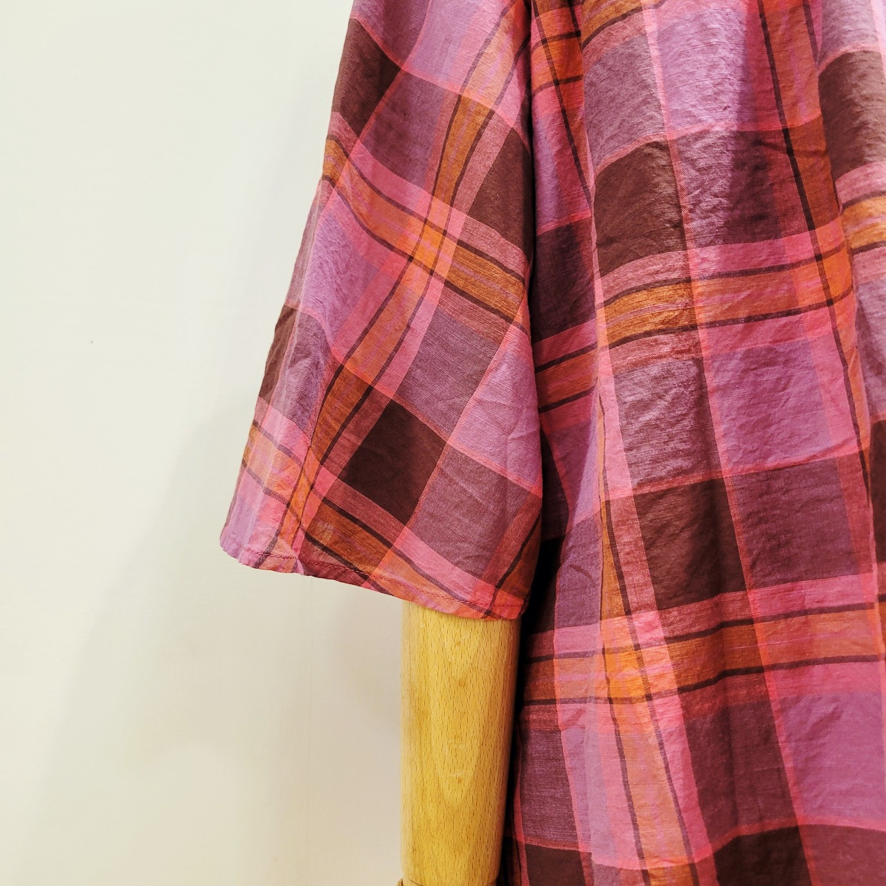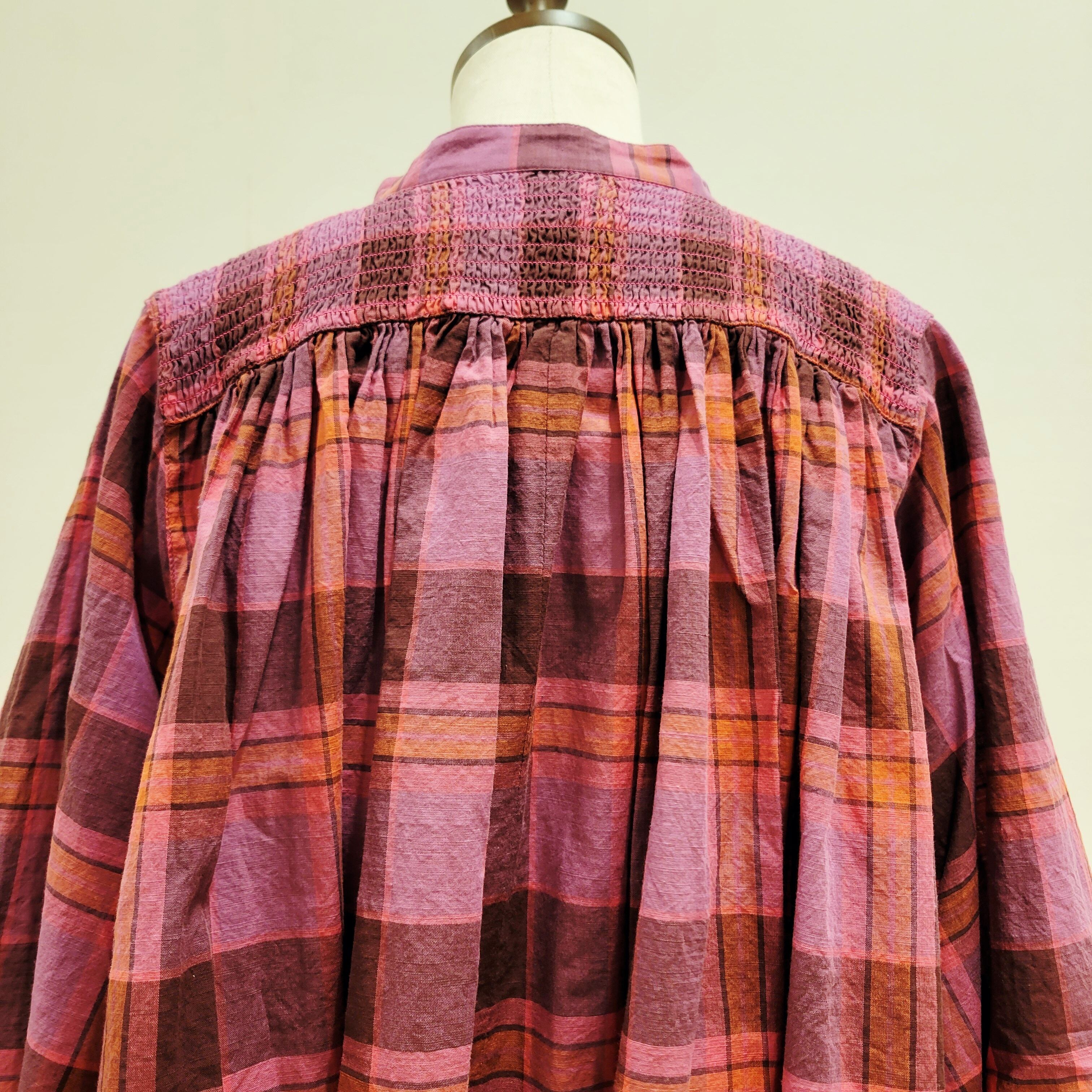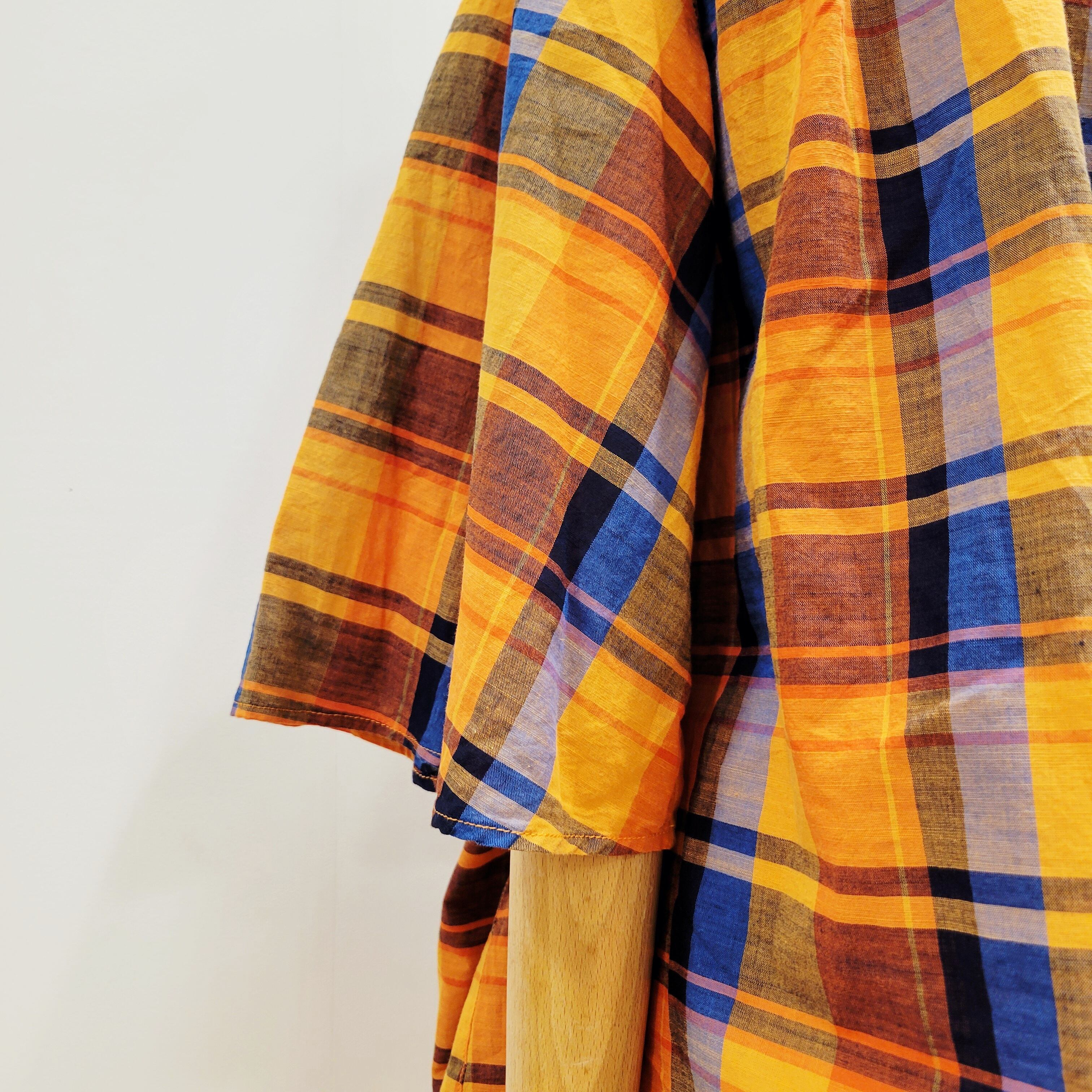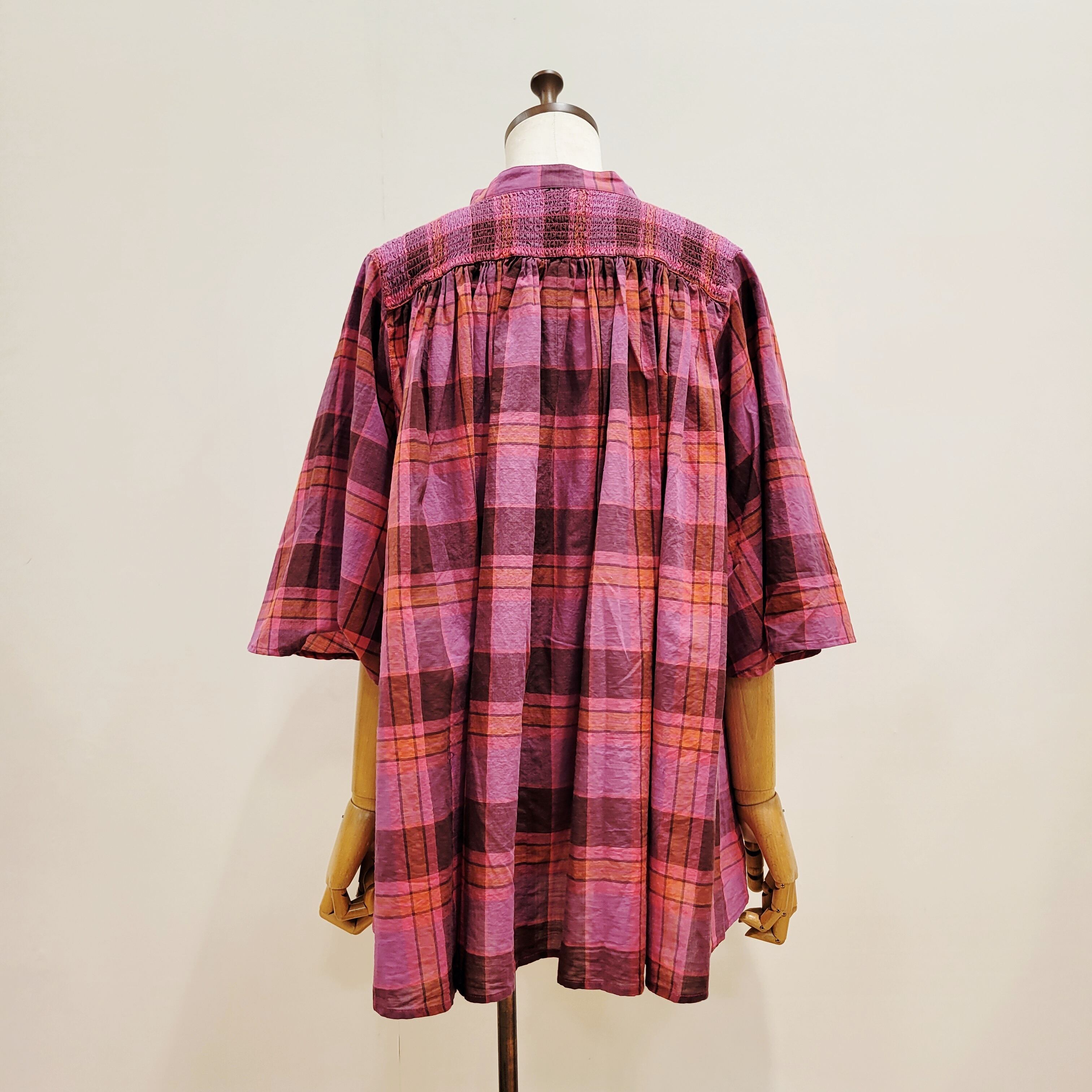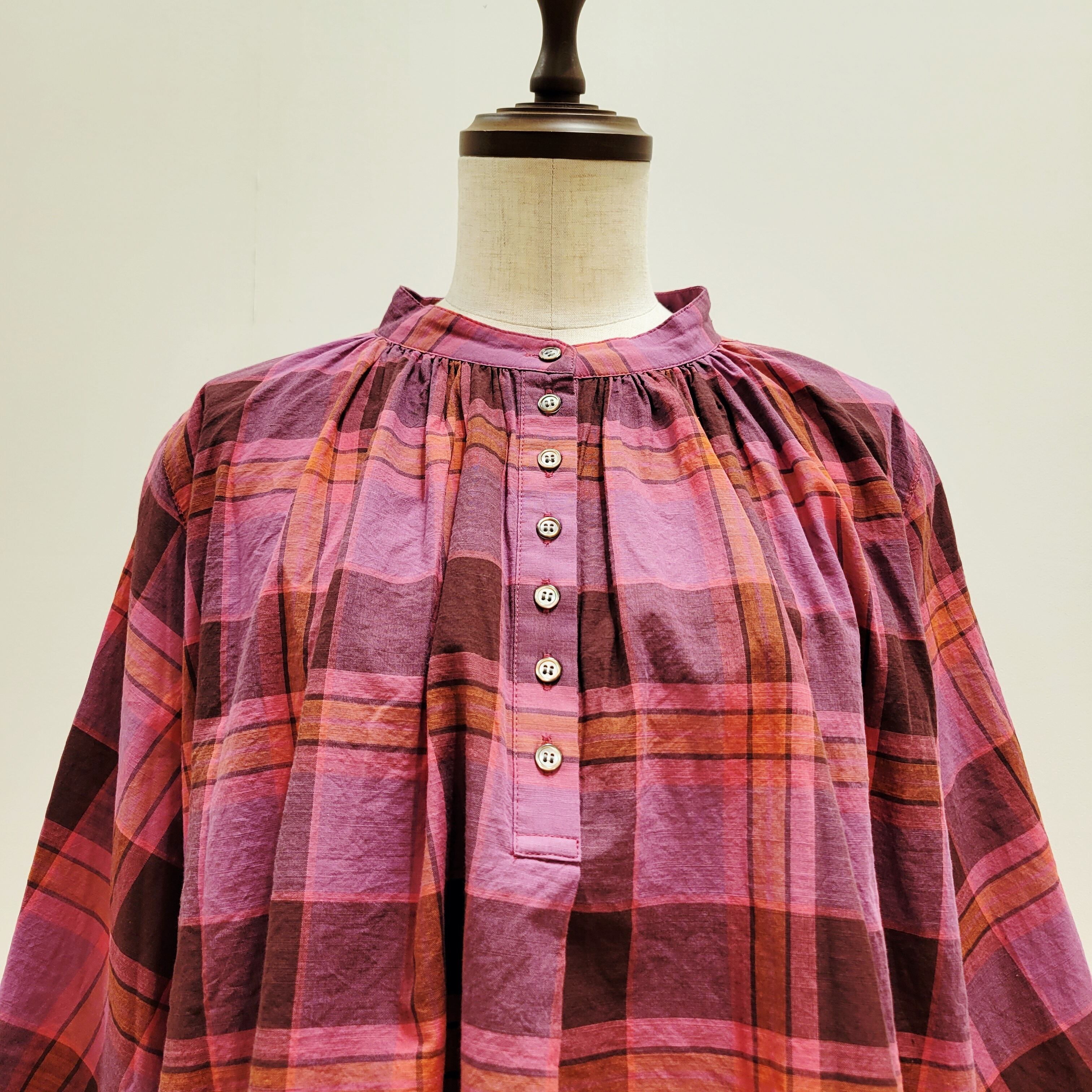 あたたかみのあるオレンジをベースにした、やさしい雰囲気のチェック柄ブラウス。首元に寄せたギャザーが、ふんわりとした立体感のある表情を添えています。ほどよい存在感がありながら、コーディネートに自然と馴染む一枚。バンドカラーですっきりと着られ、パンツにもスカートにも合わせやすいデザインです。