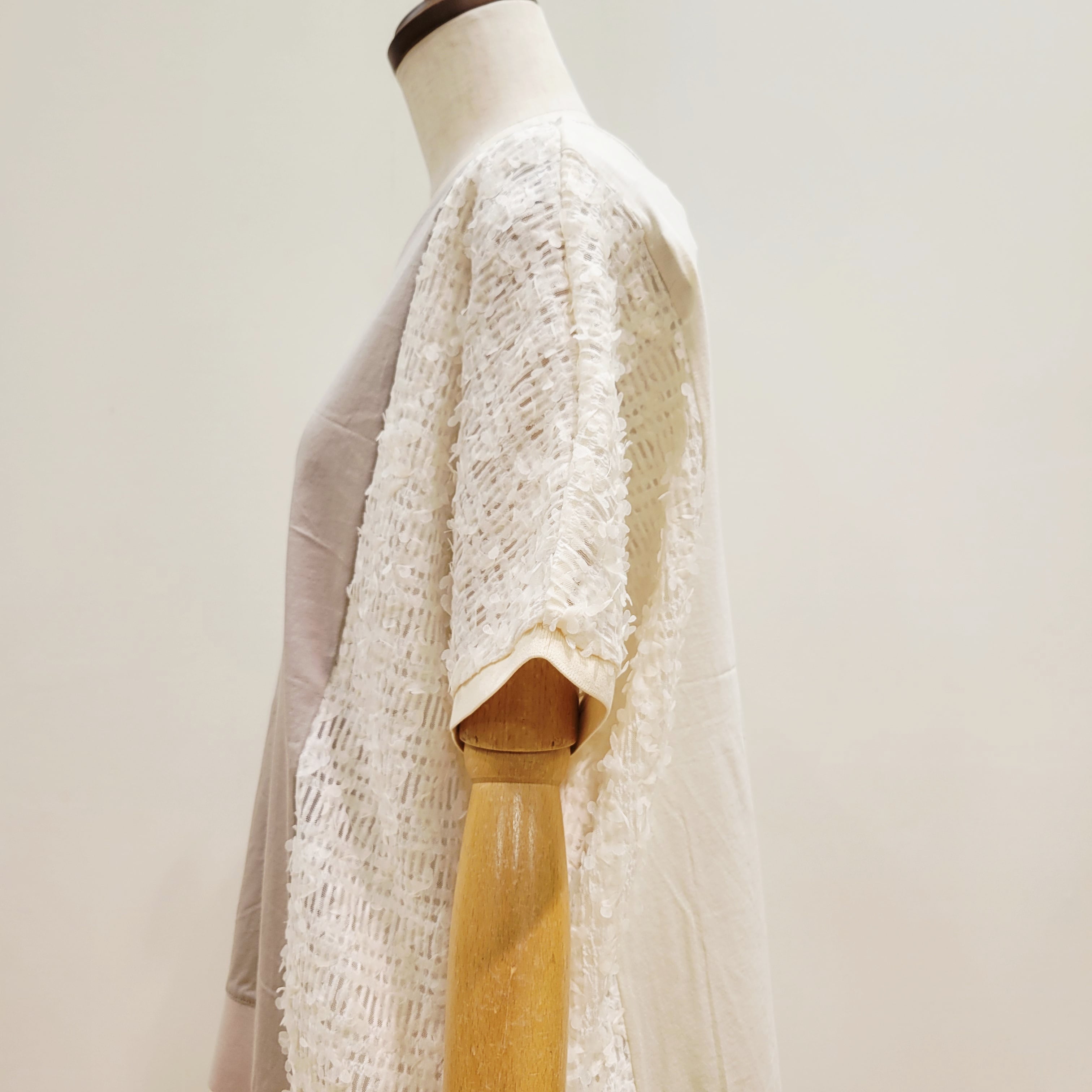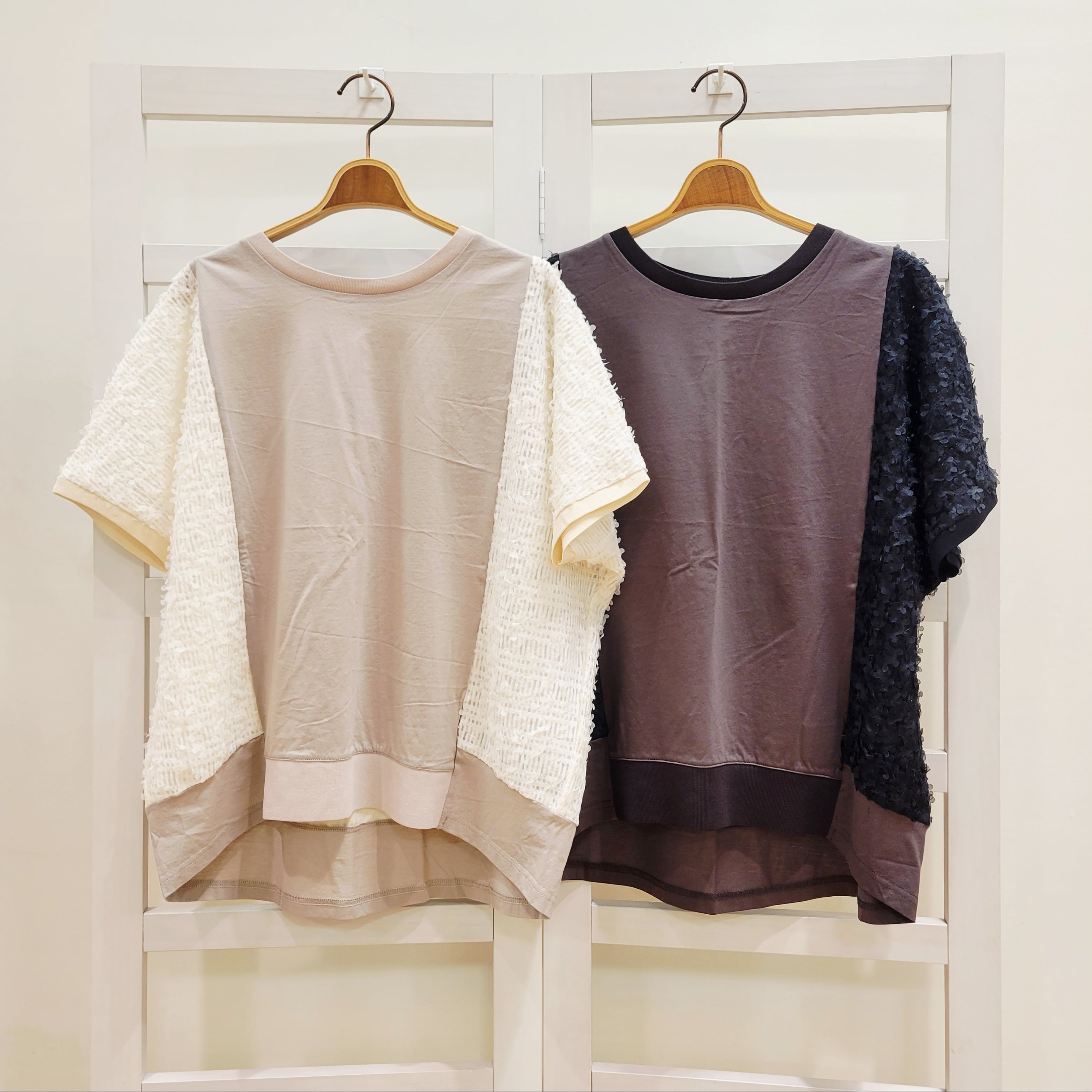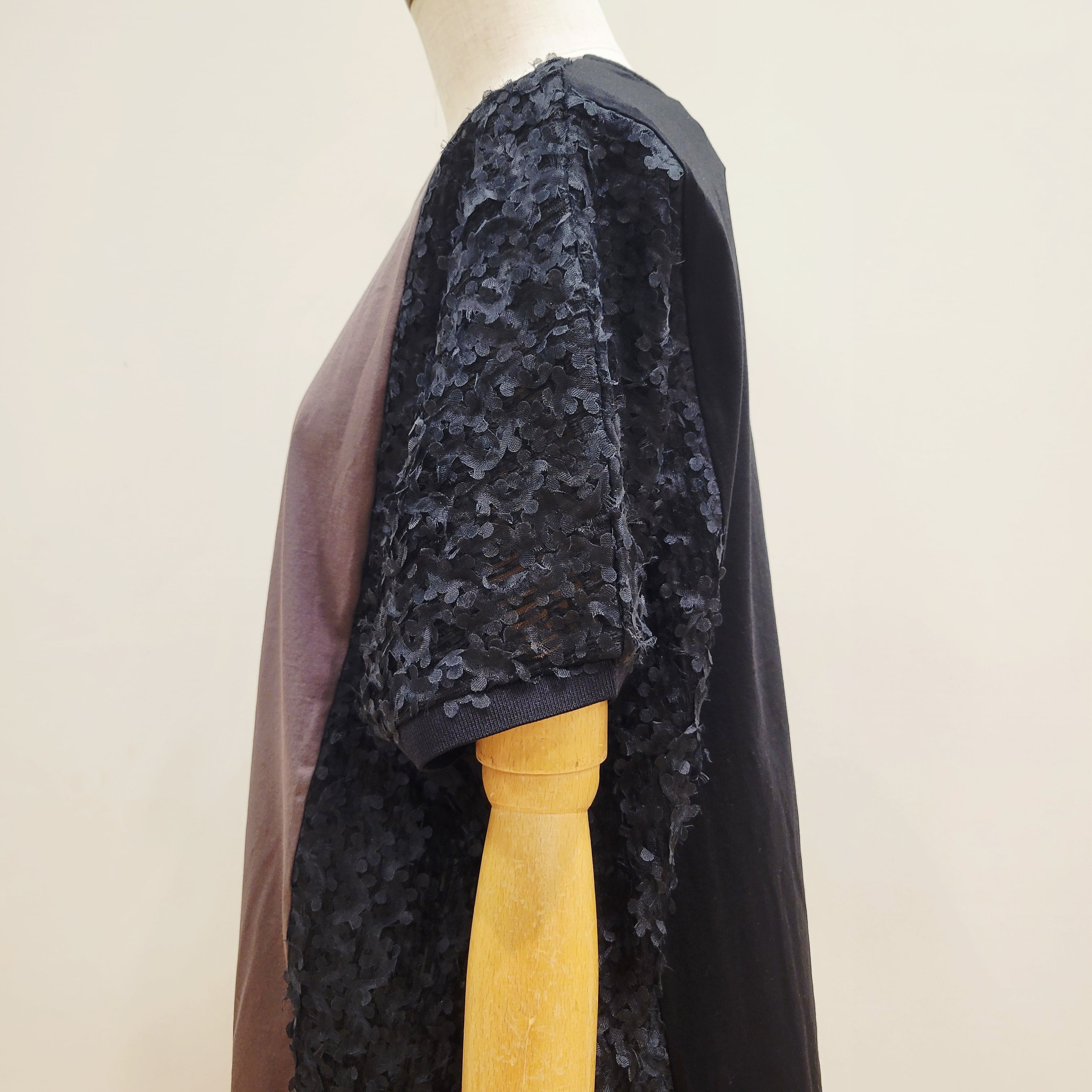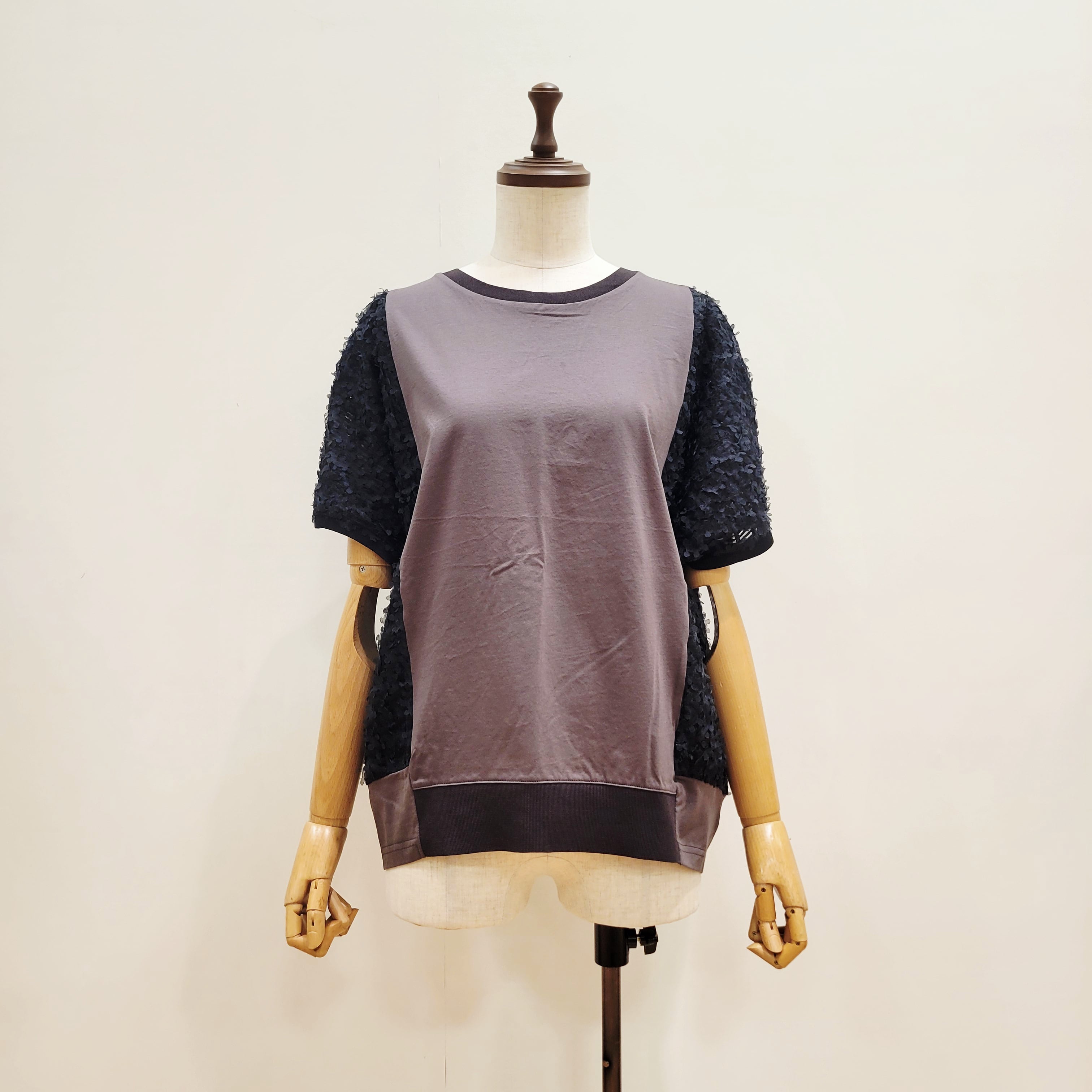 両袖を大胆にレース袖で切り替えたプルオーバー。